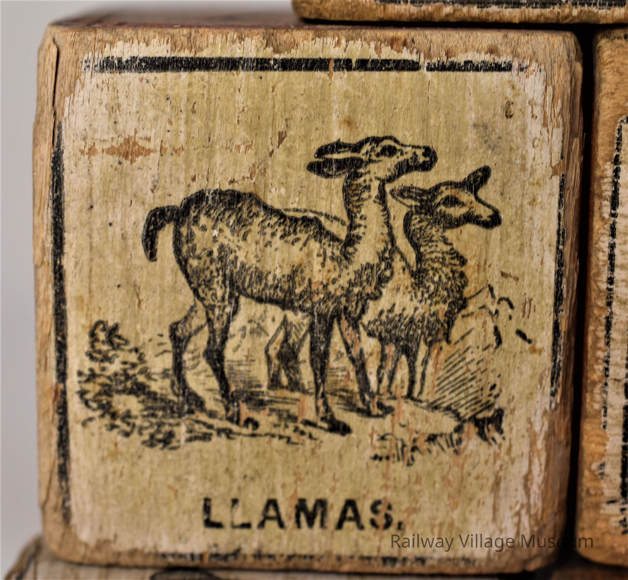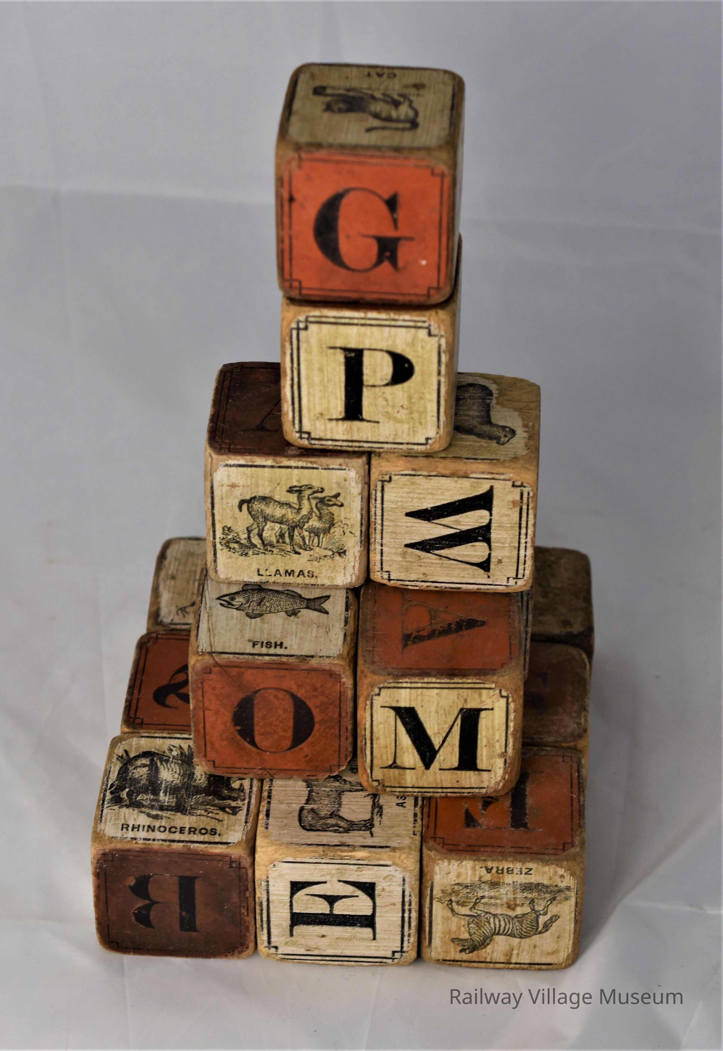Old wooden blocks that have pictures of animals and letters.Lexicon