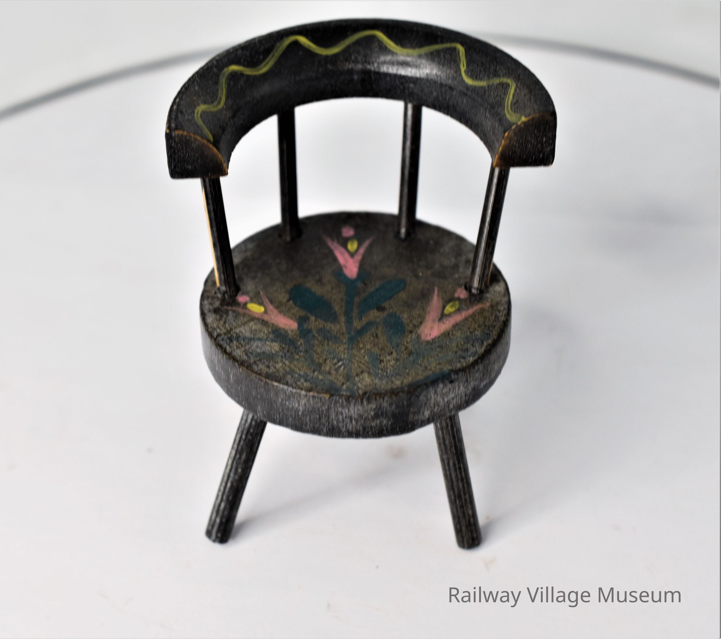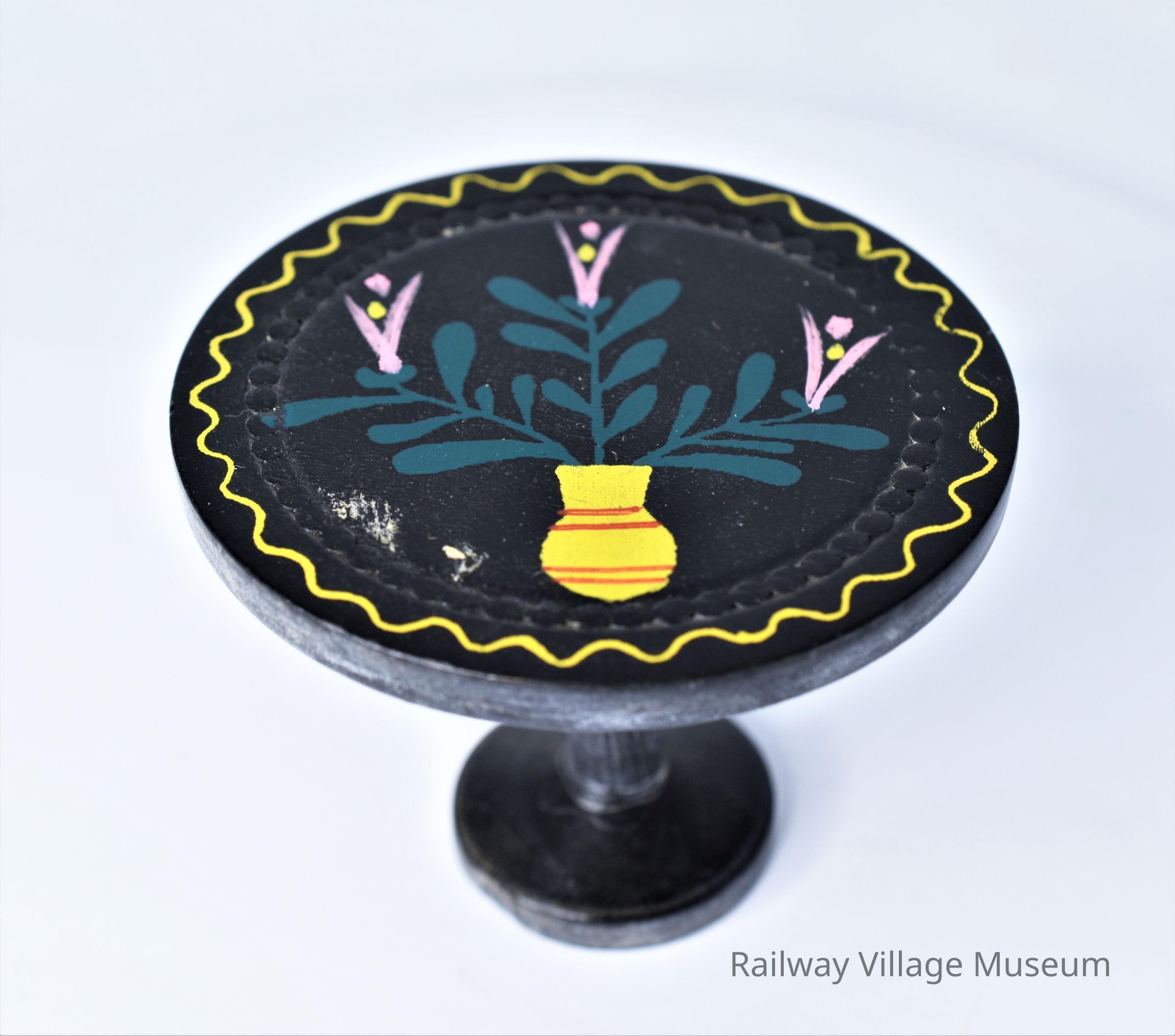 A black dining set by Fomerz. Each piece has flowers painted over the flat surfaces. Each of the chairs are the same. The Fomerz makers mark is located on the bottom of the table.