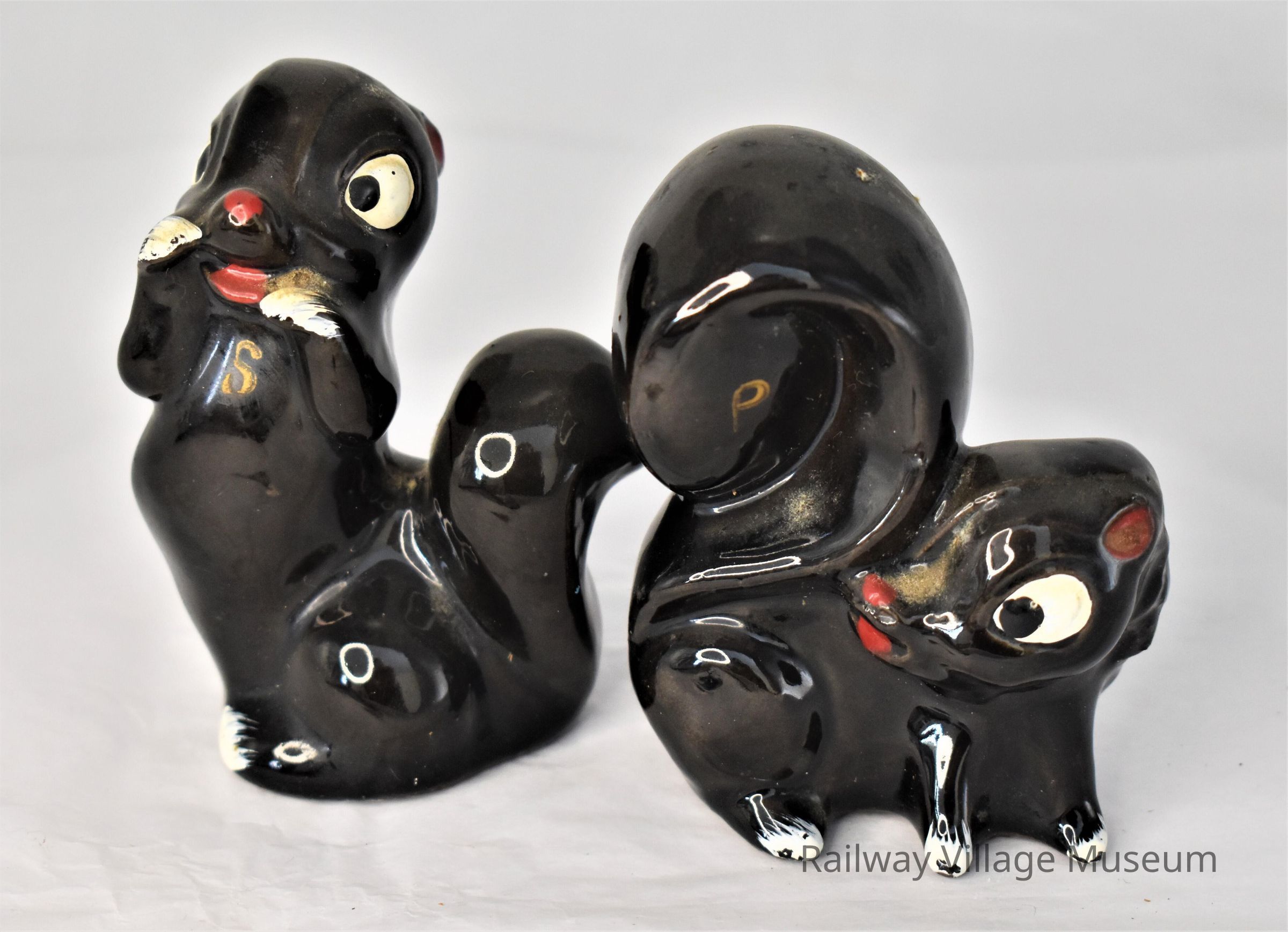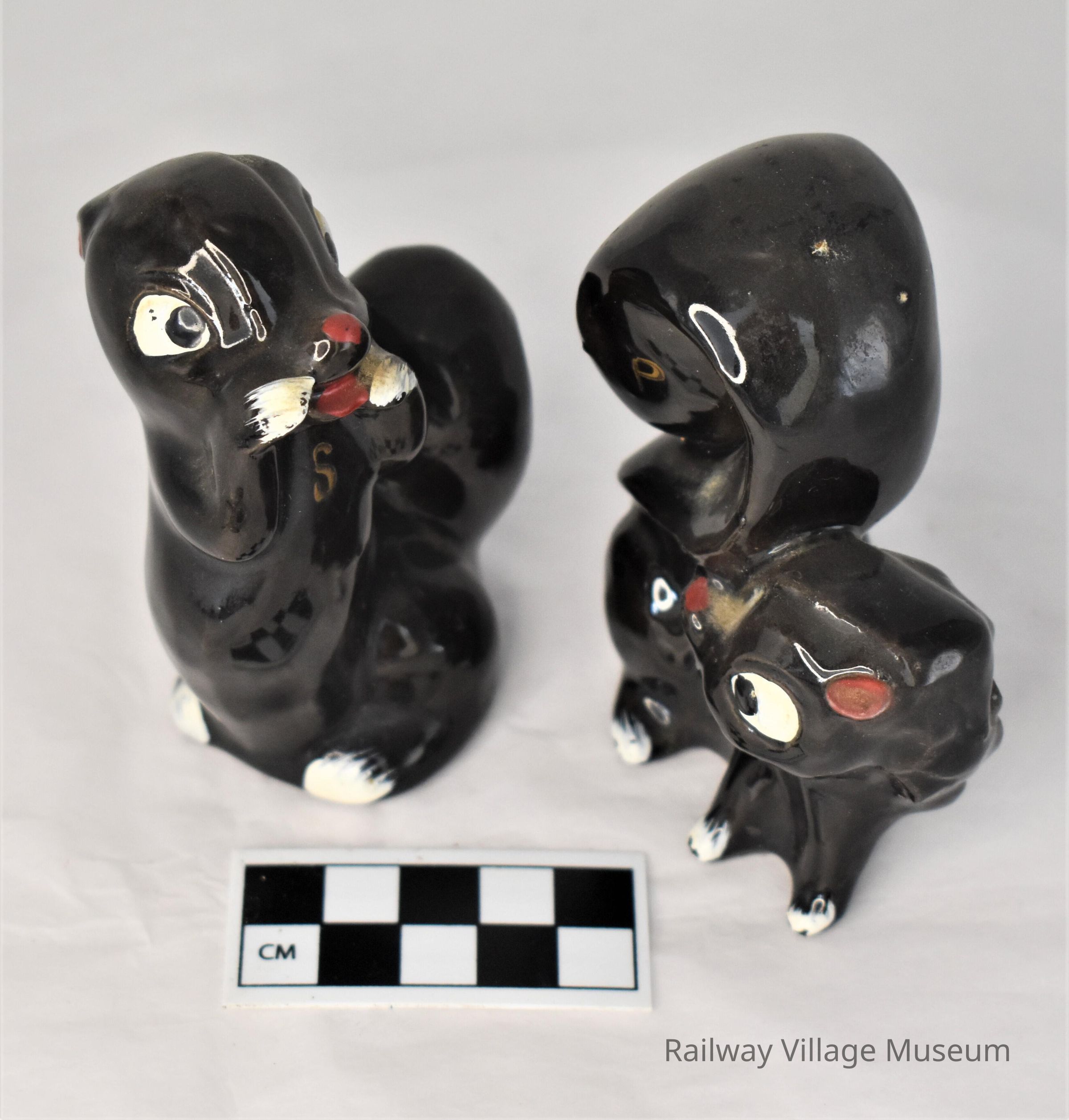Ceramic black squirrel salt and pepper shakers. The salt is standing on its hind legs and the pepper is on all fours with tail in the air. Unmarked other than the "S" and "P". Both have their cork stoppers in place.