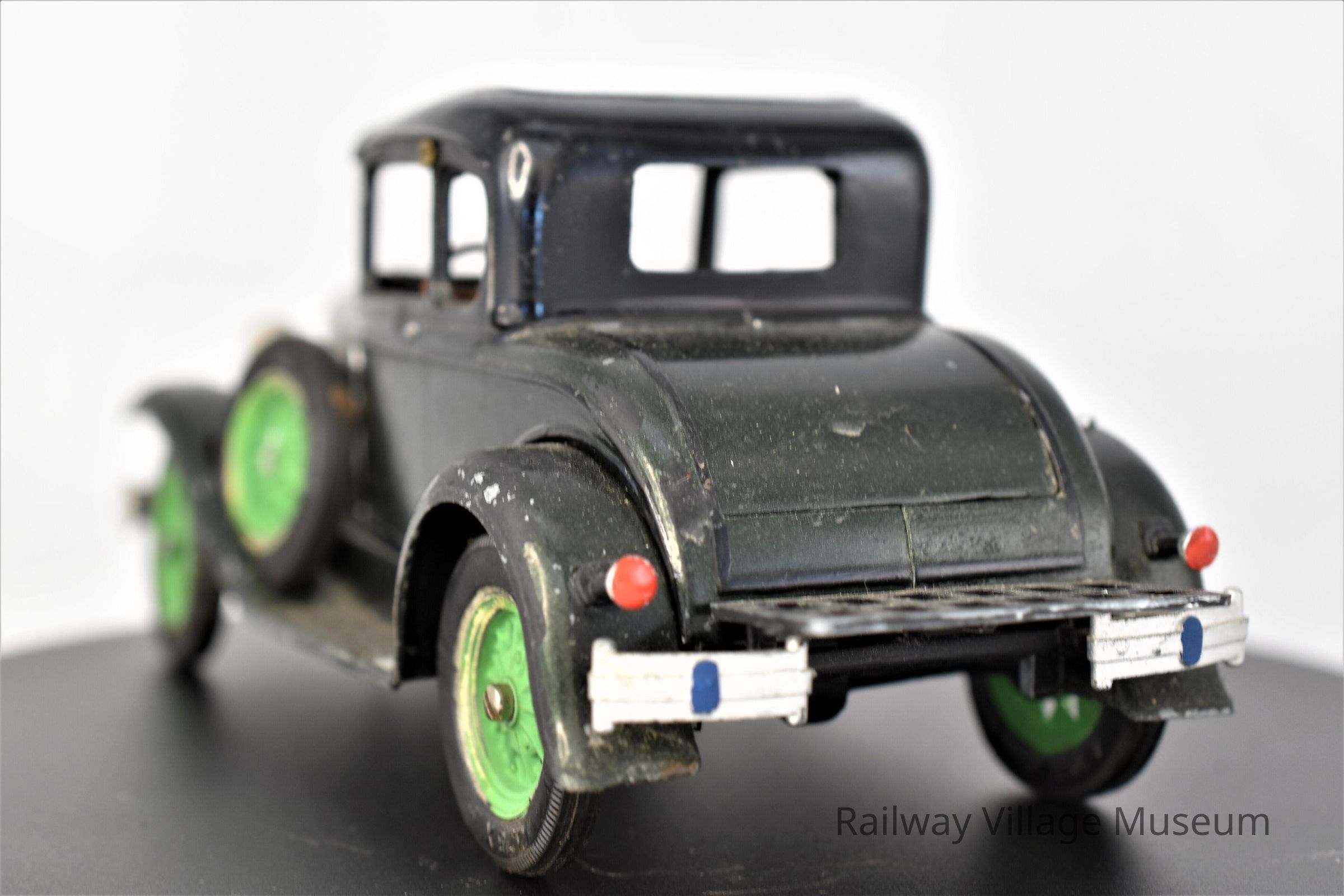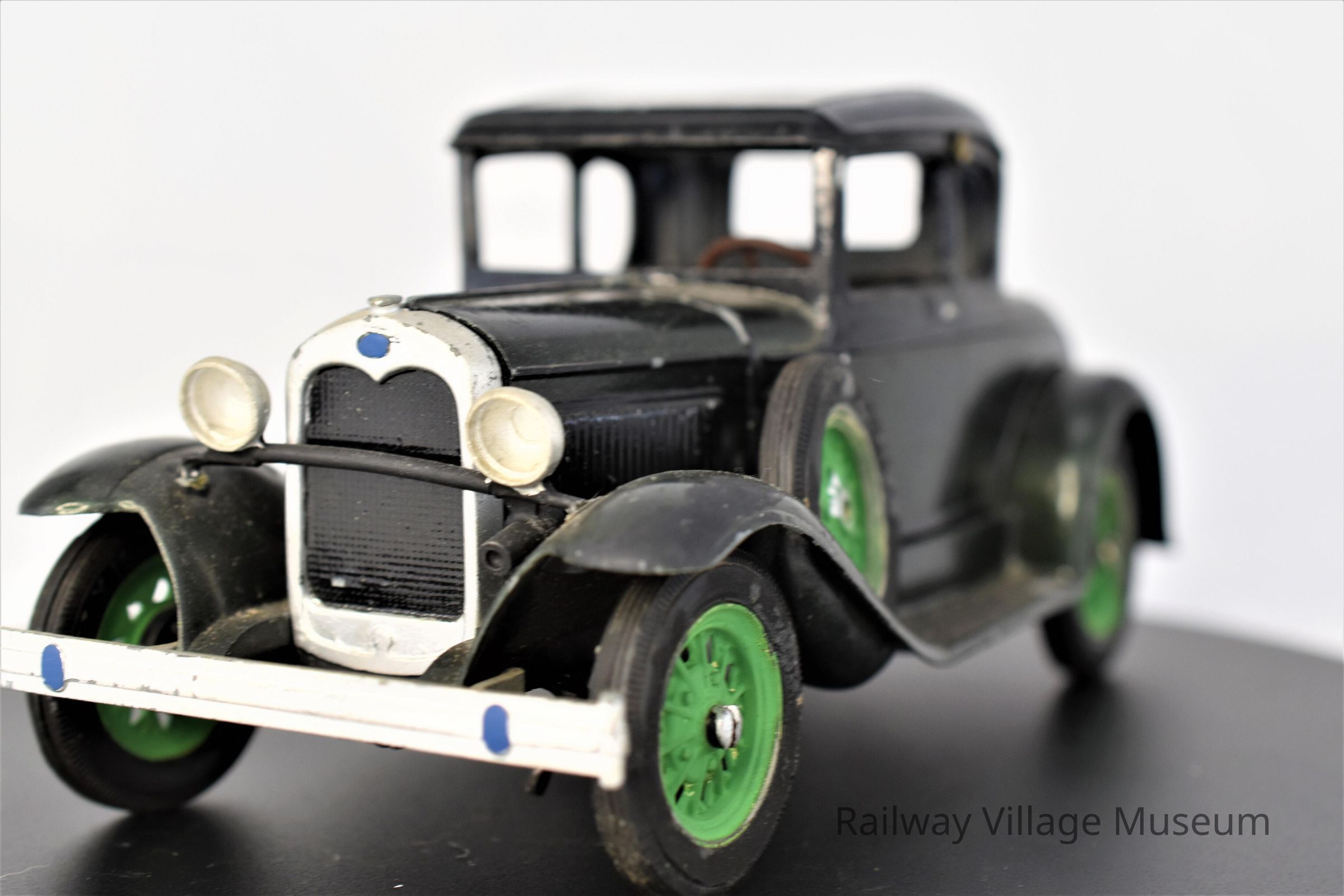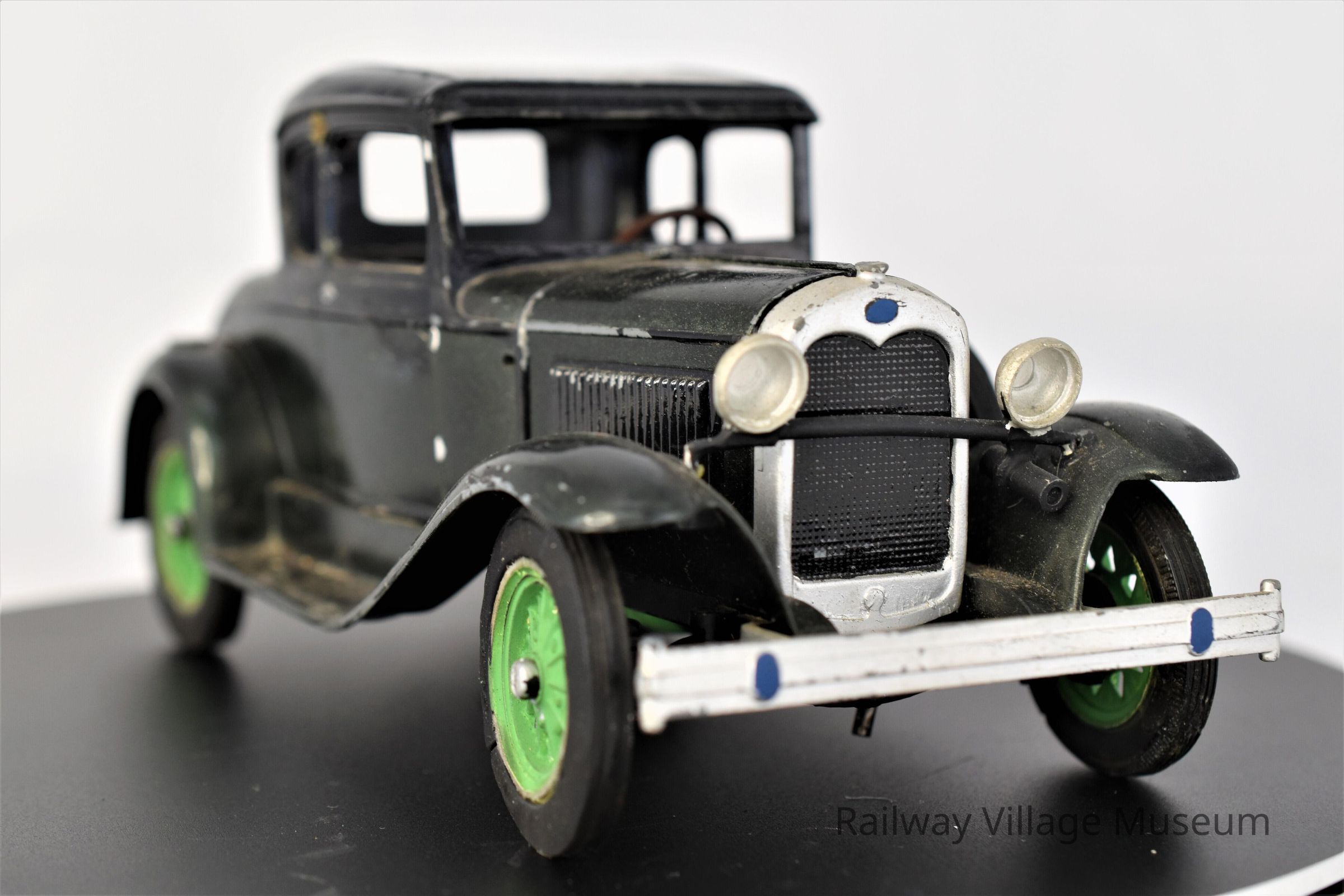 A Model A dark green Coupe, crafted from a kit. The dark green of the body paint is so dark, that it appears black at first glance. The tires of this car are a lighter green. The steering wheel turns the front two wheels.