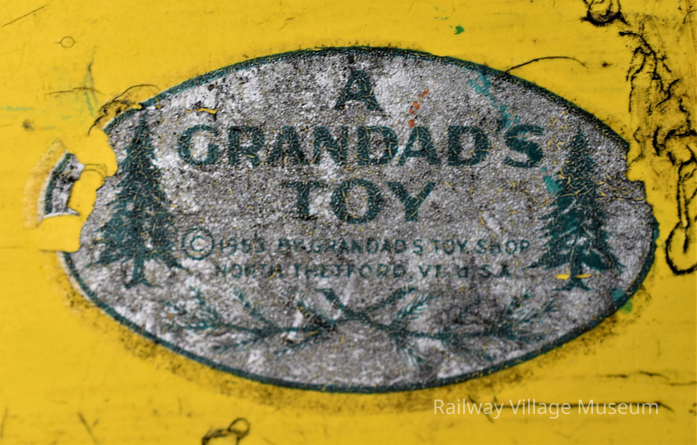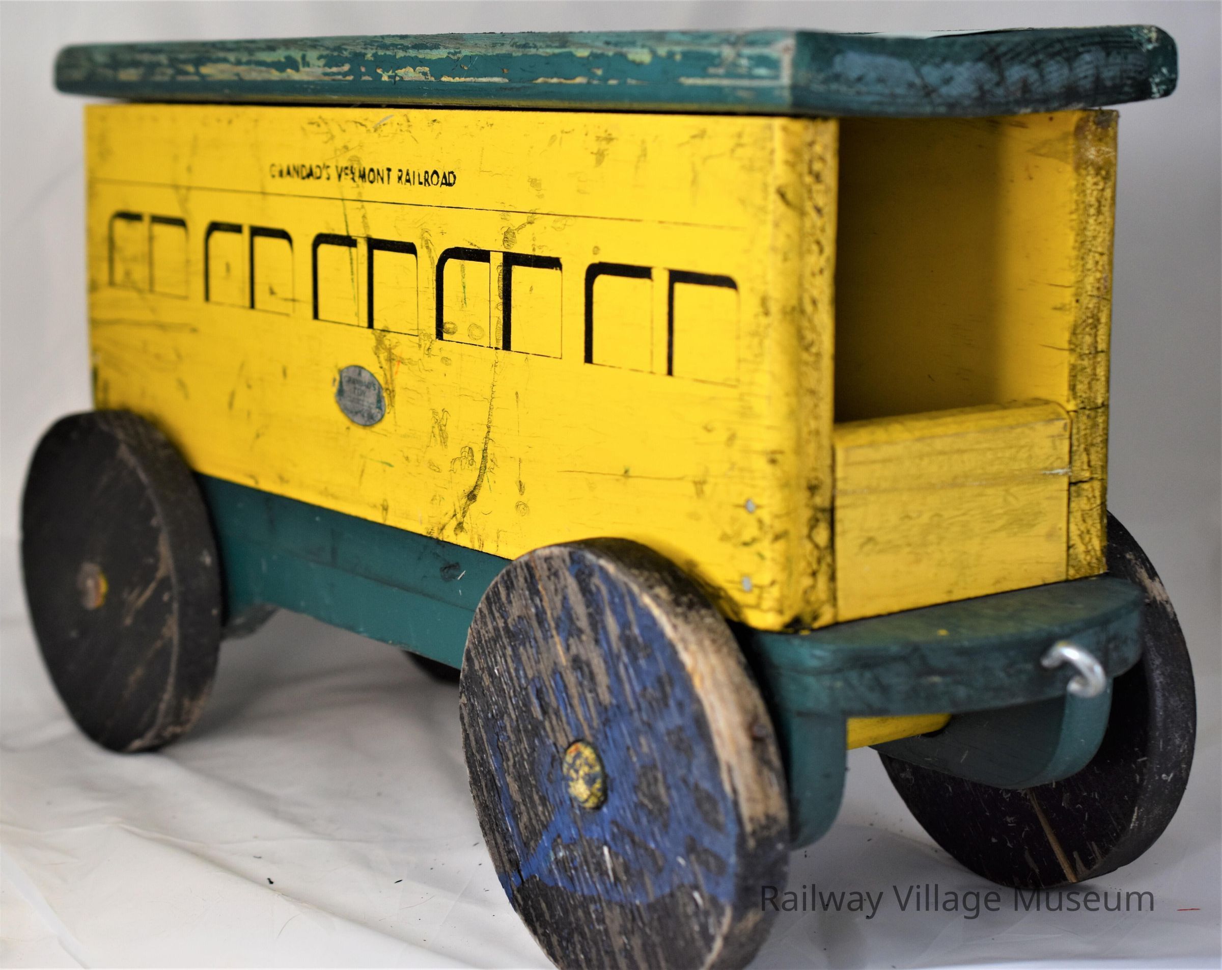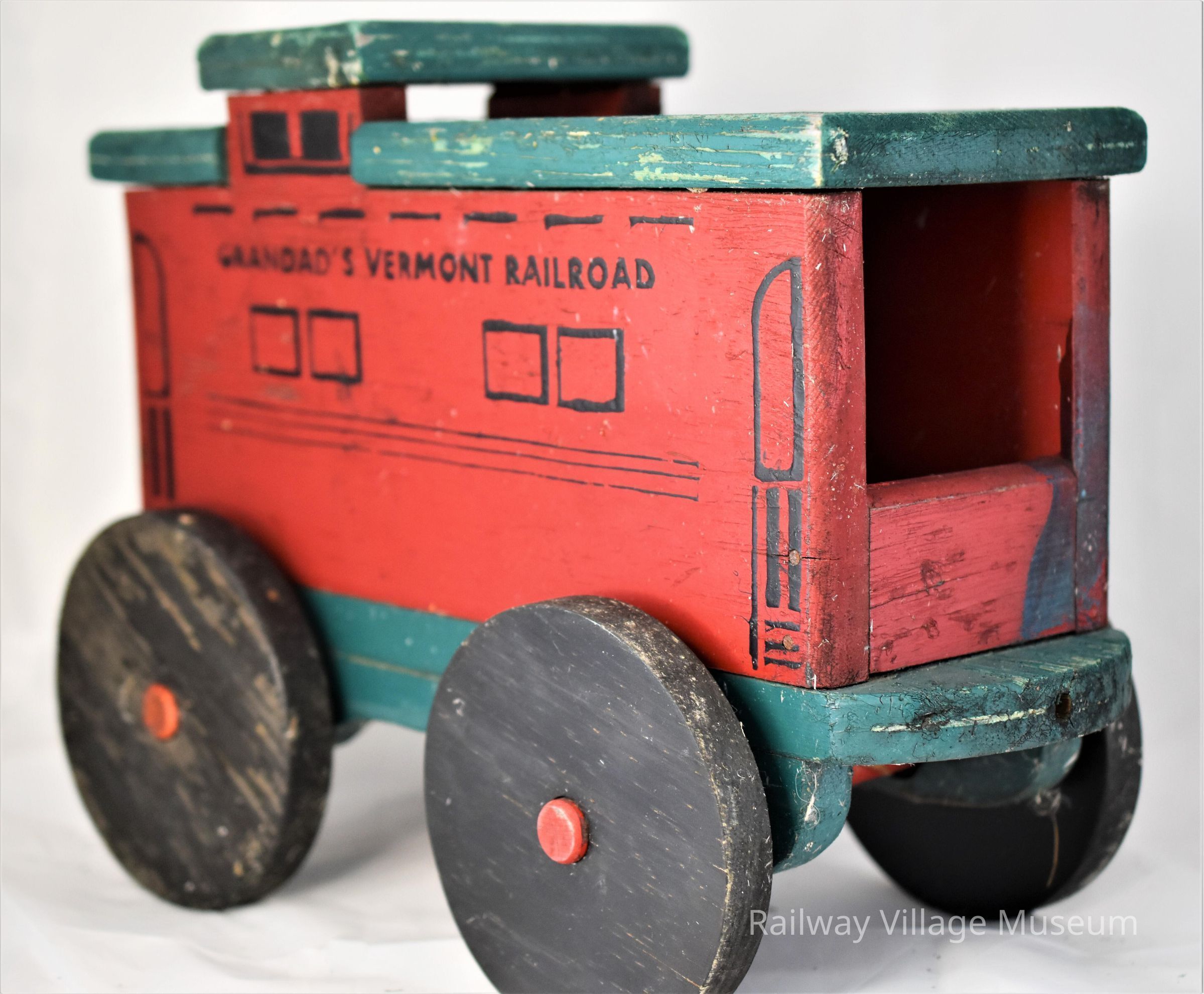 This train consists of six cars and two spare wheels. It was built in 1953, as seen by the logo stamped to the side of the Passenger Car. The whole set is a part of the Grandad's Vermont Railroad. They fit together by the original hooks in the front and back of each car.