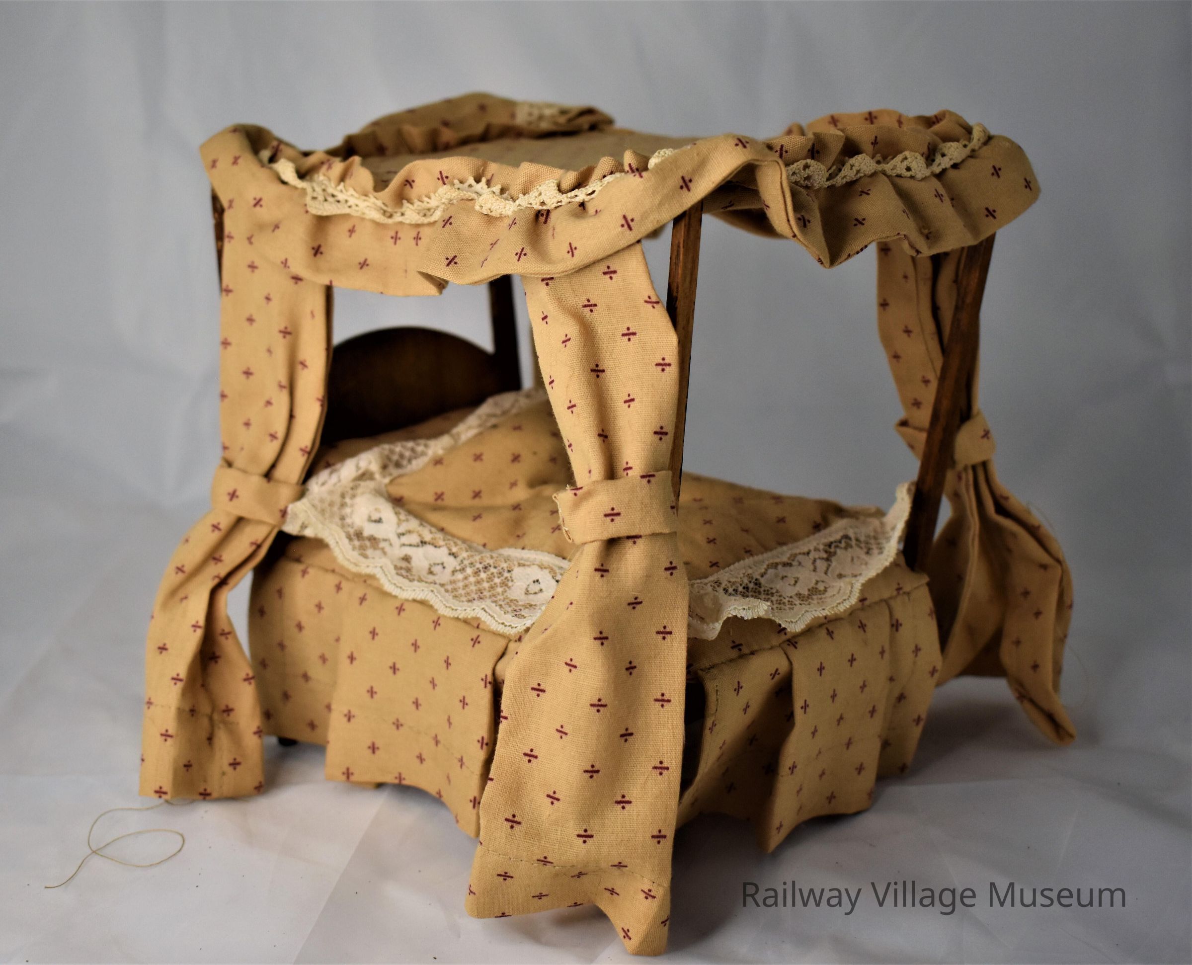 A canopy bed, by an unknown maker. It is unclear if the canopy is original or a later addition. The mattress comes with a blanket that has been sewn on.