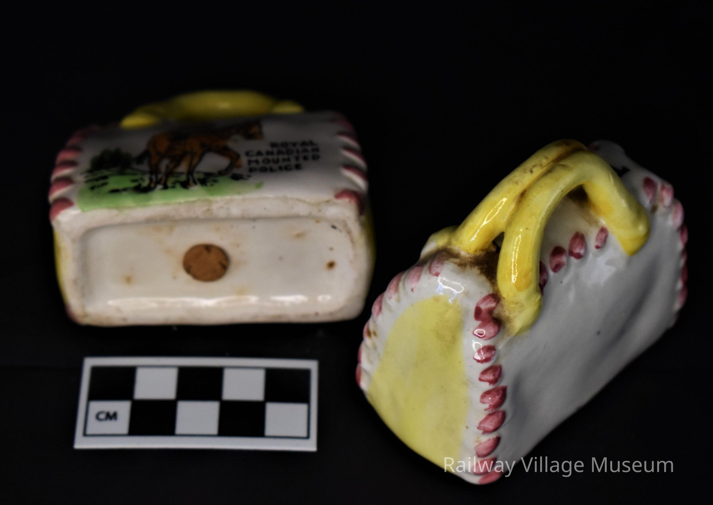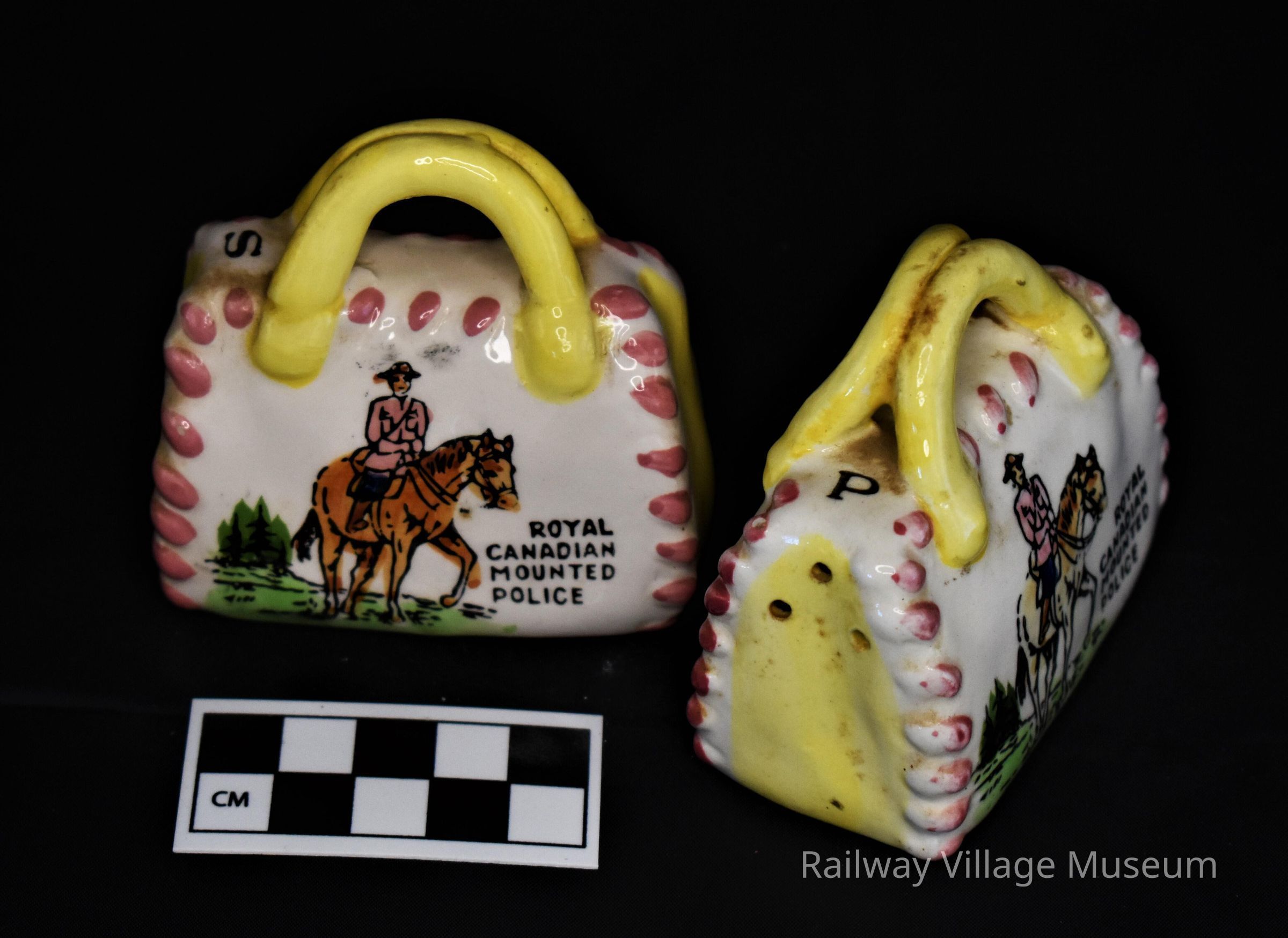 These ceramic bag-shaped salt and pepper shakers are decorated with and illustration and title of the "Royal Canadian Mounted Police". They were likely a souvenir and may be found with different decoration from other destinations. They are otherwise unmarked and there is no clear manufacturer. Both have cork stoppers intact.
