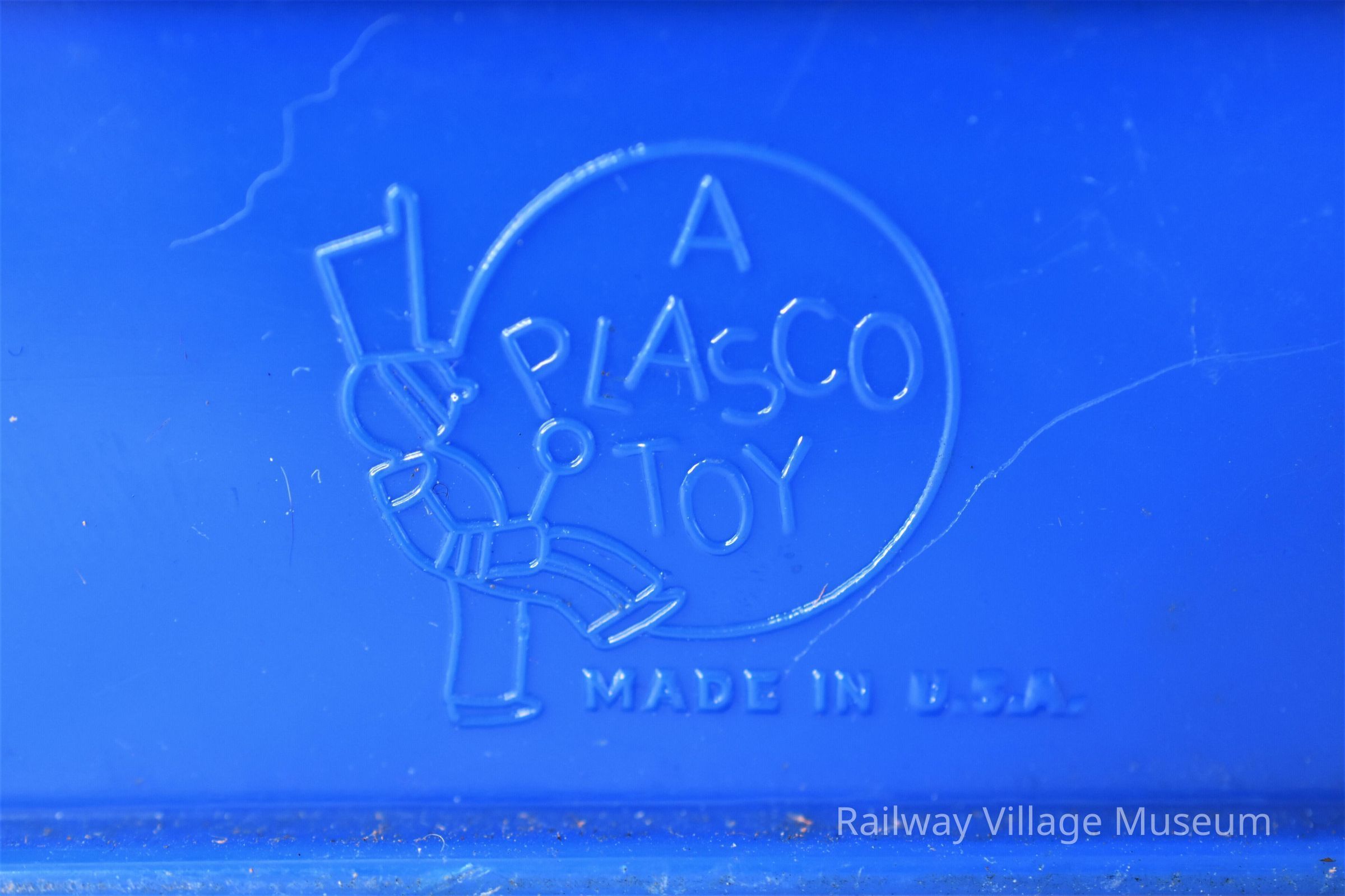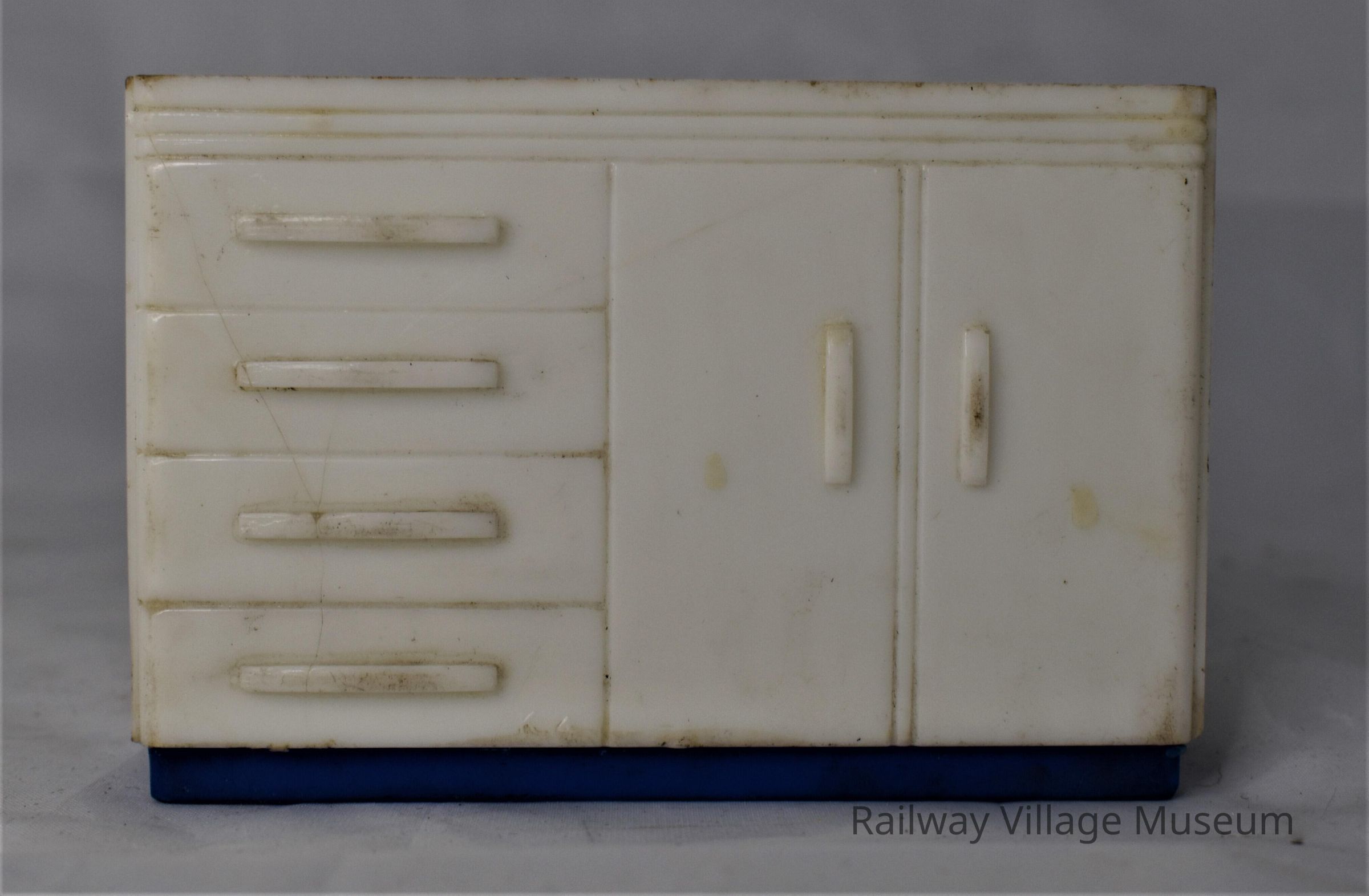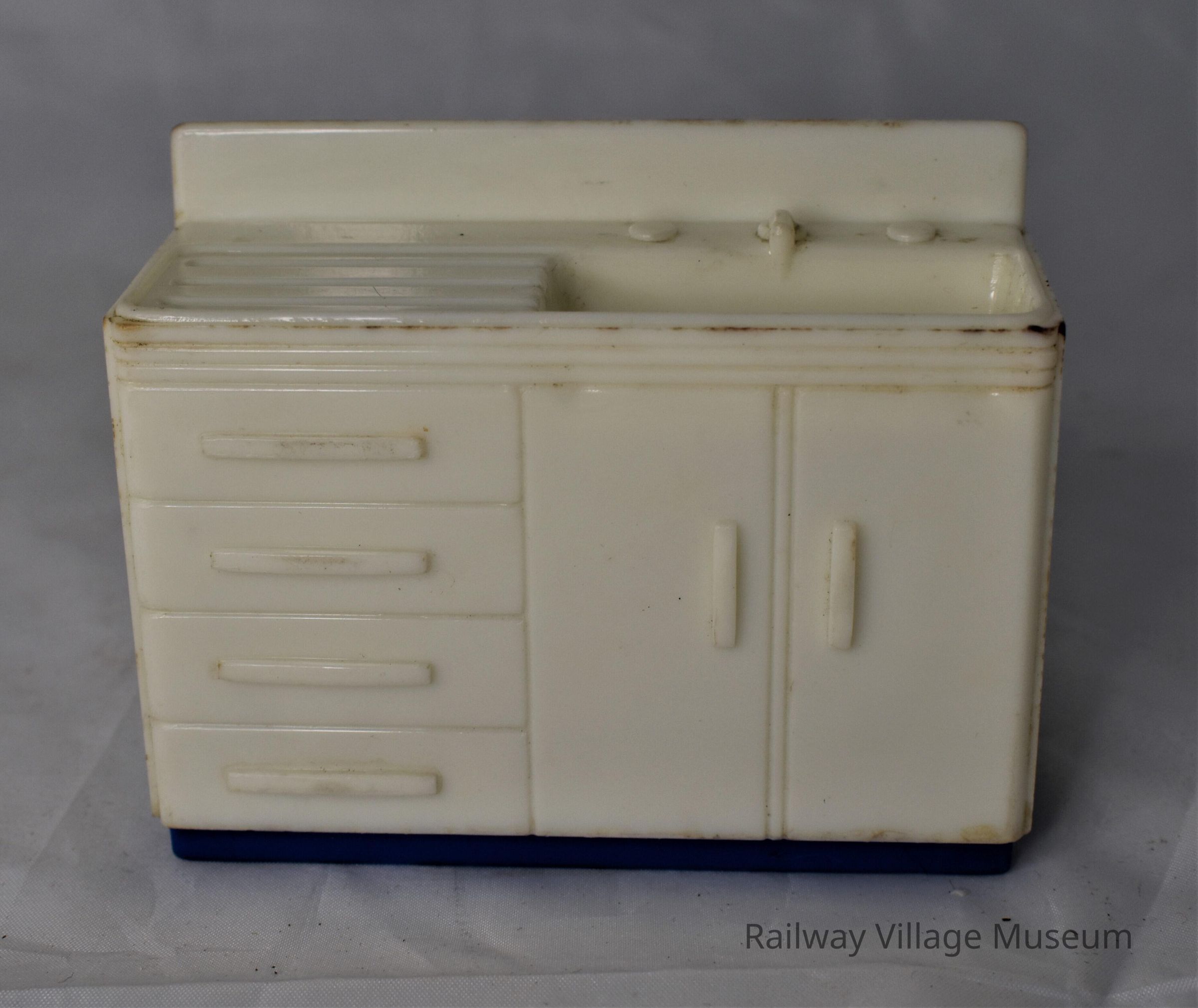 A PlasCo Toy Kitchen set. Painted white with blue bottoms. The PlasCo makers mark is found on the bottom of both the pieces.