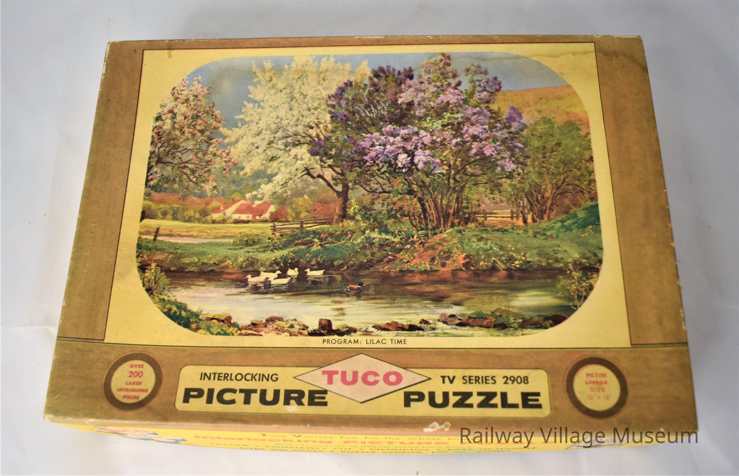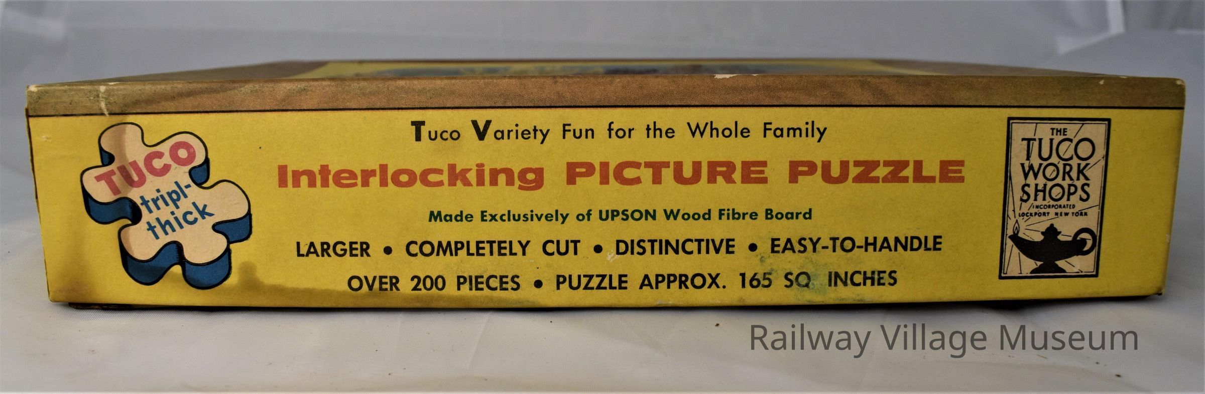 This Tuco Picture puzzle is made from a thick cardboard that the company named Upson wood fibre board. The box is slightly water and sun damaged, but the puzzle pieces themselves are all still in good condition. Whether or not there are pieces missing is unknown.Made/Created