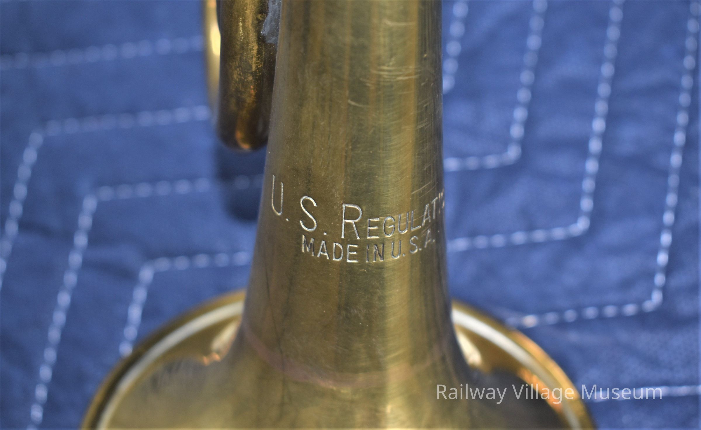 An antique bugle with gold tassels wrapped around it. There is an inscription near the bell that says, "U.S. REGULATION MADE IN U.S.A."