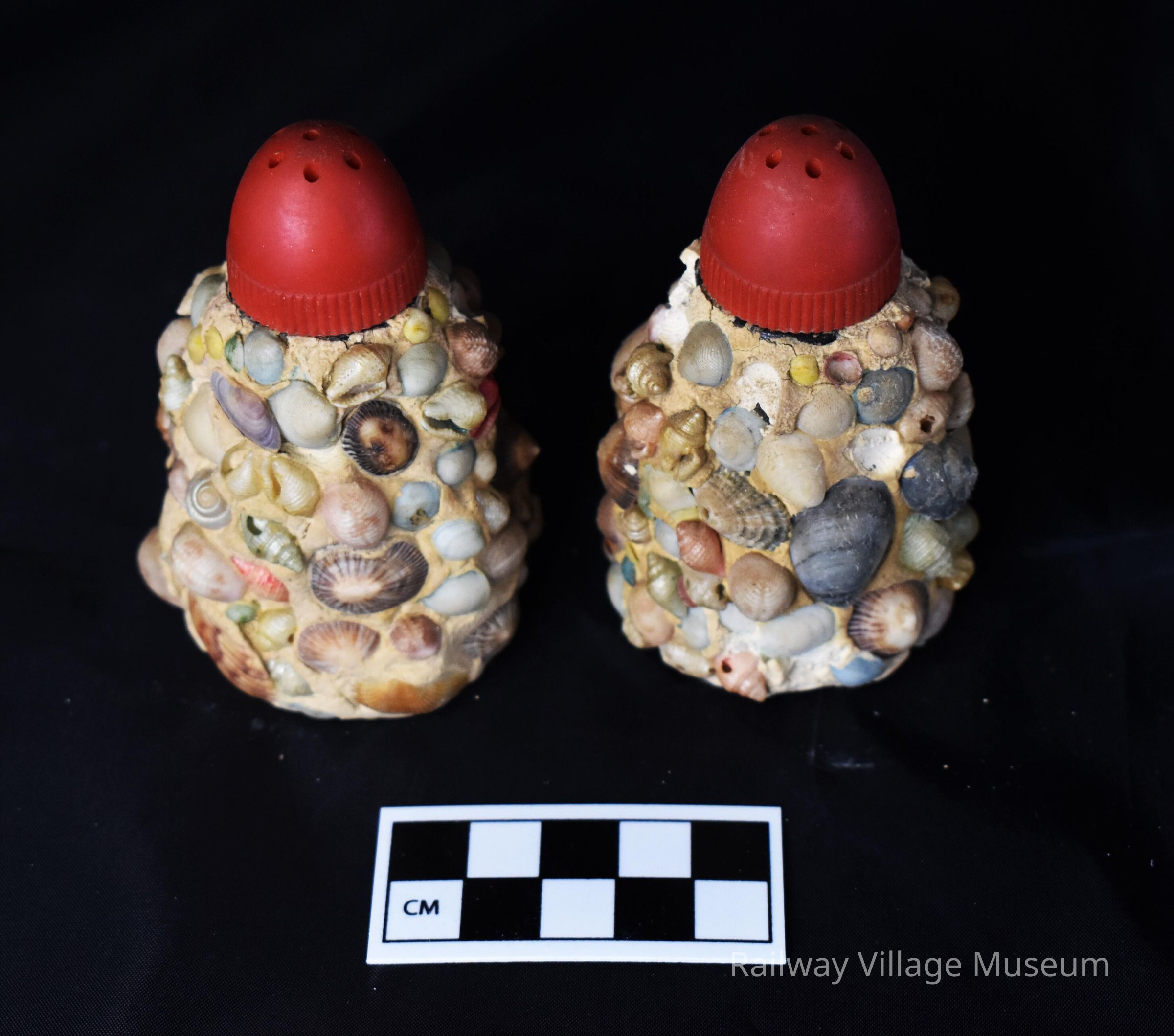 Glass salt and pepper shakers that have been covered in plaster and encrusted with shells. Both have matching red plastic tops. One is very flakey.