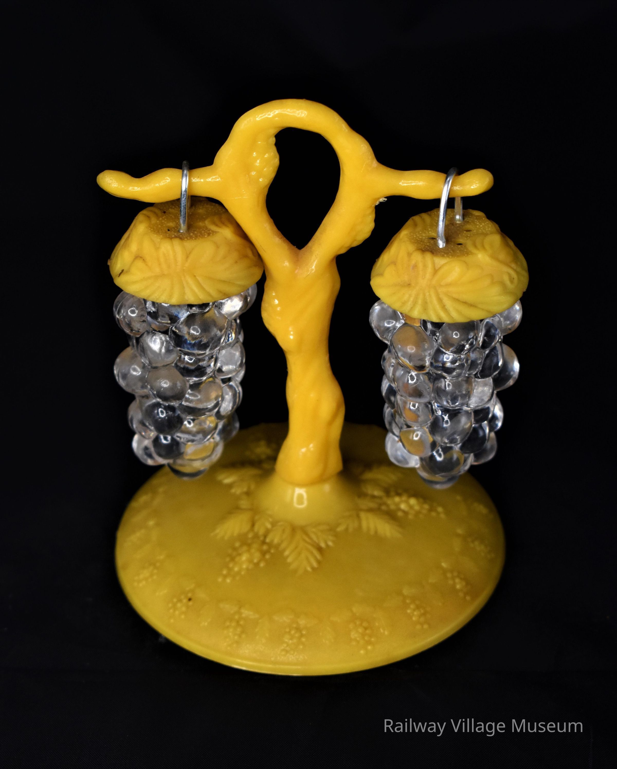 Plastic yellow grapevine base with clear and yellow grape cluster shakers hanging from the base. No manufacturer but grapevine base states, "Made in Hong Kong".