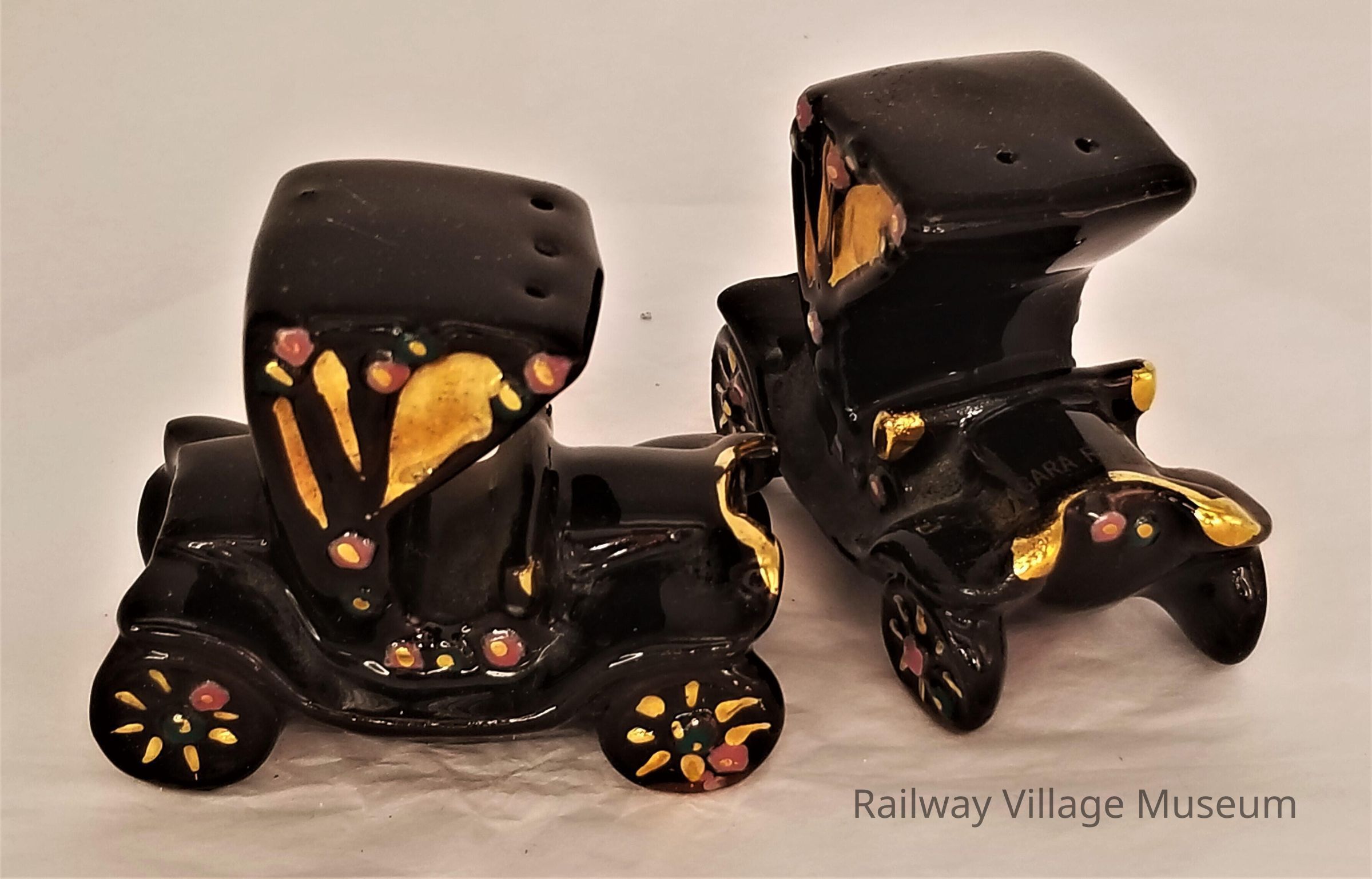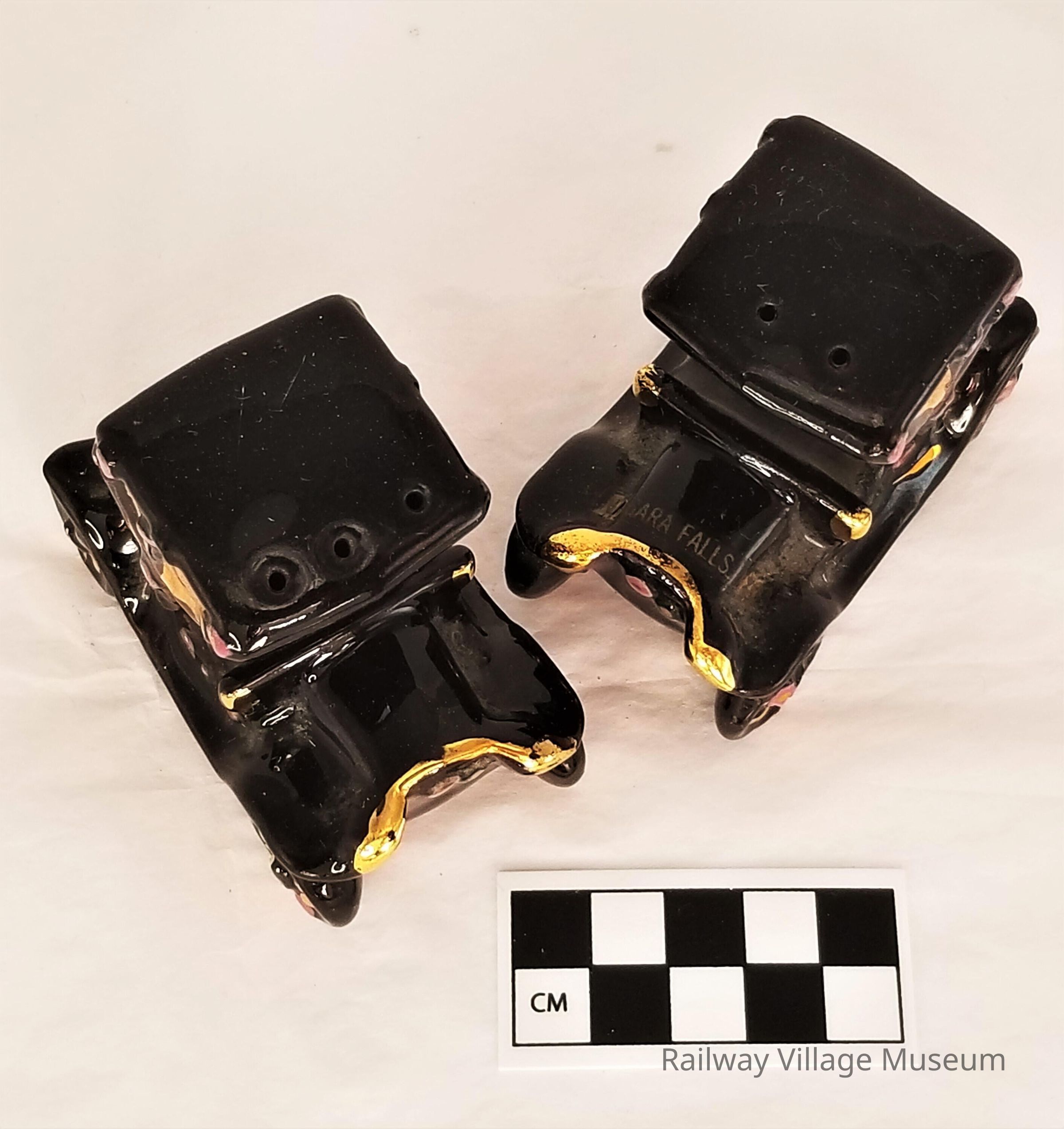 Ceramic Model T shaker set. One shaker has a sticker saying, "Niagra Falls". Cork stoppers still in place.