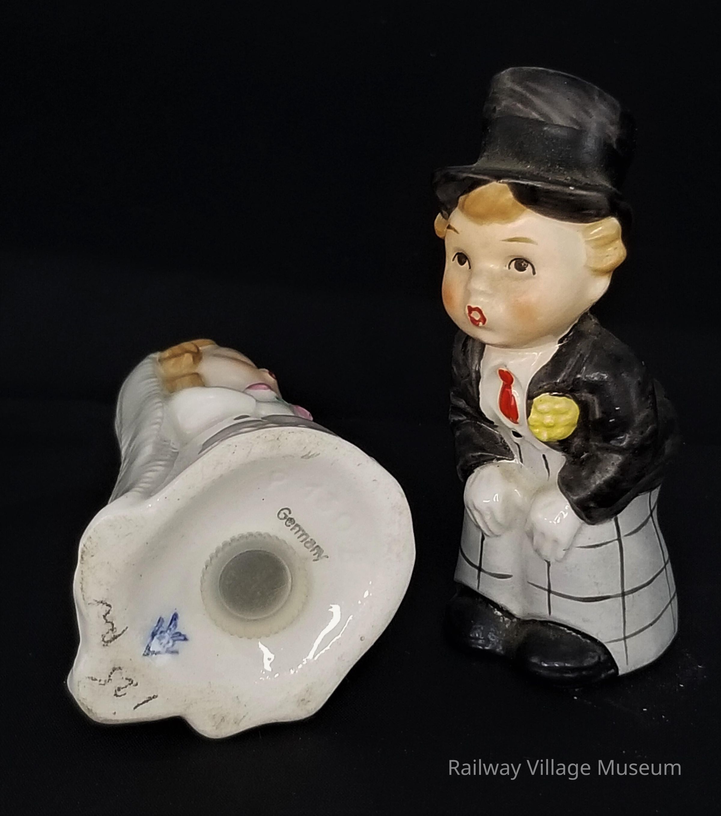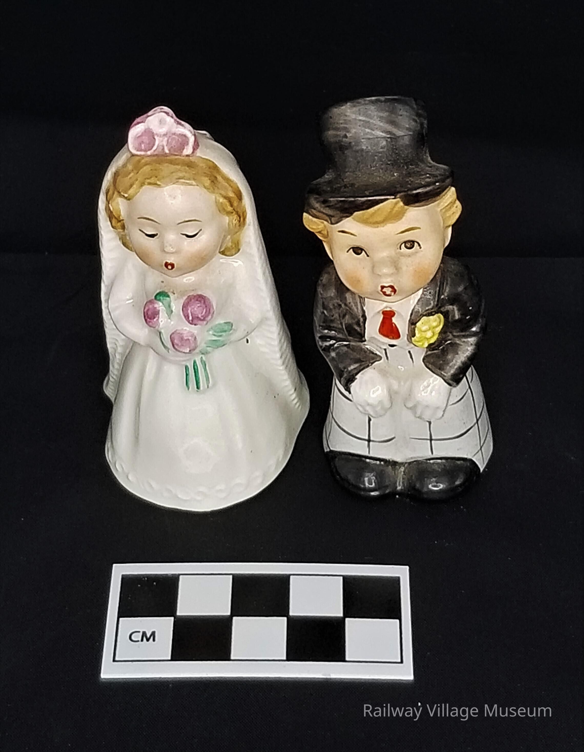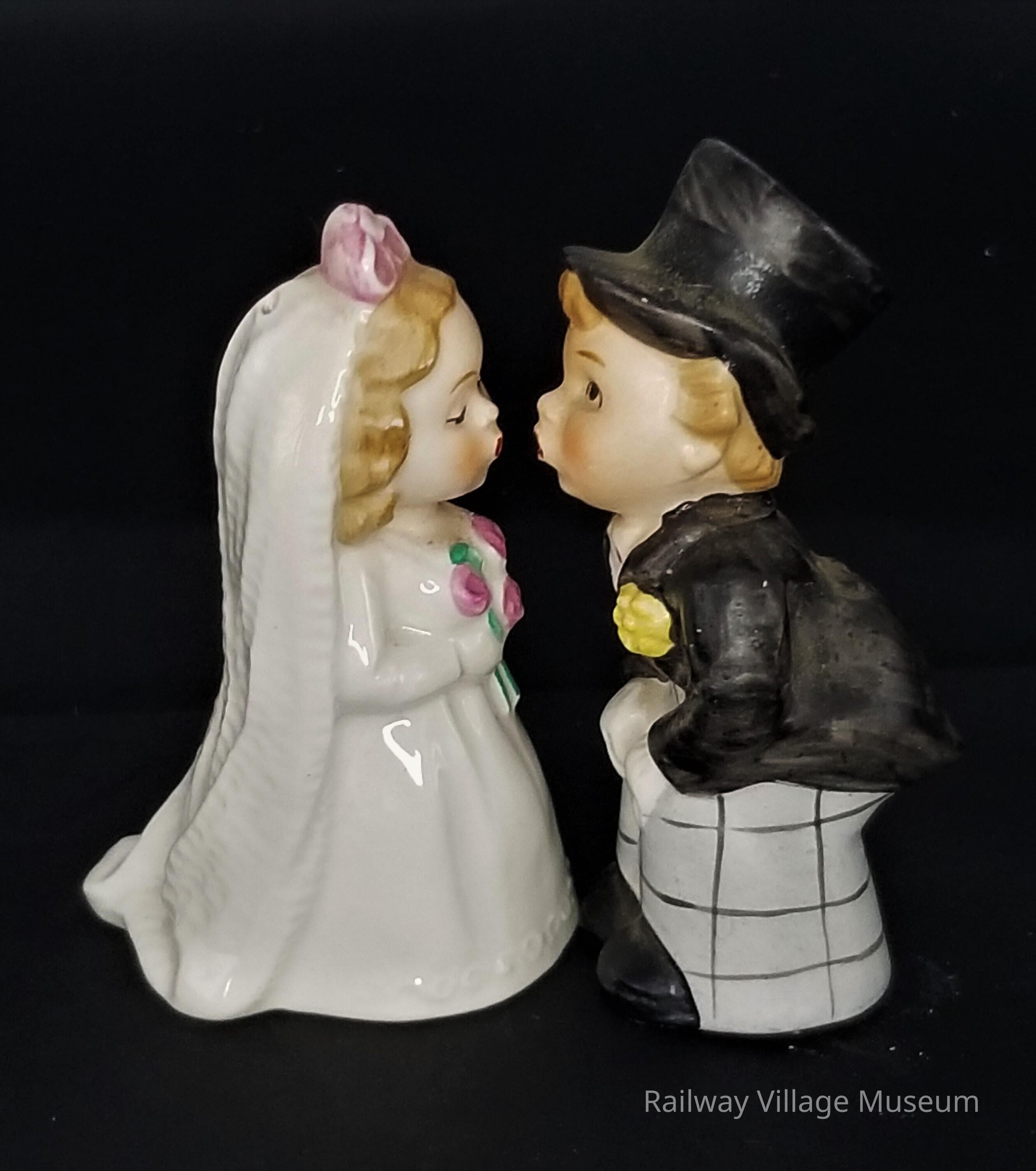 A set of kissing bride and groom shakers by the Goebel company of Germany. On the base of each is the company's bee in a "V" logo. These were designed by Carl Wagner.