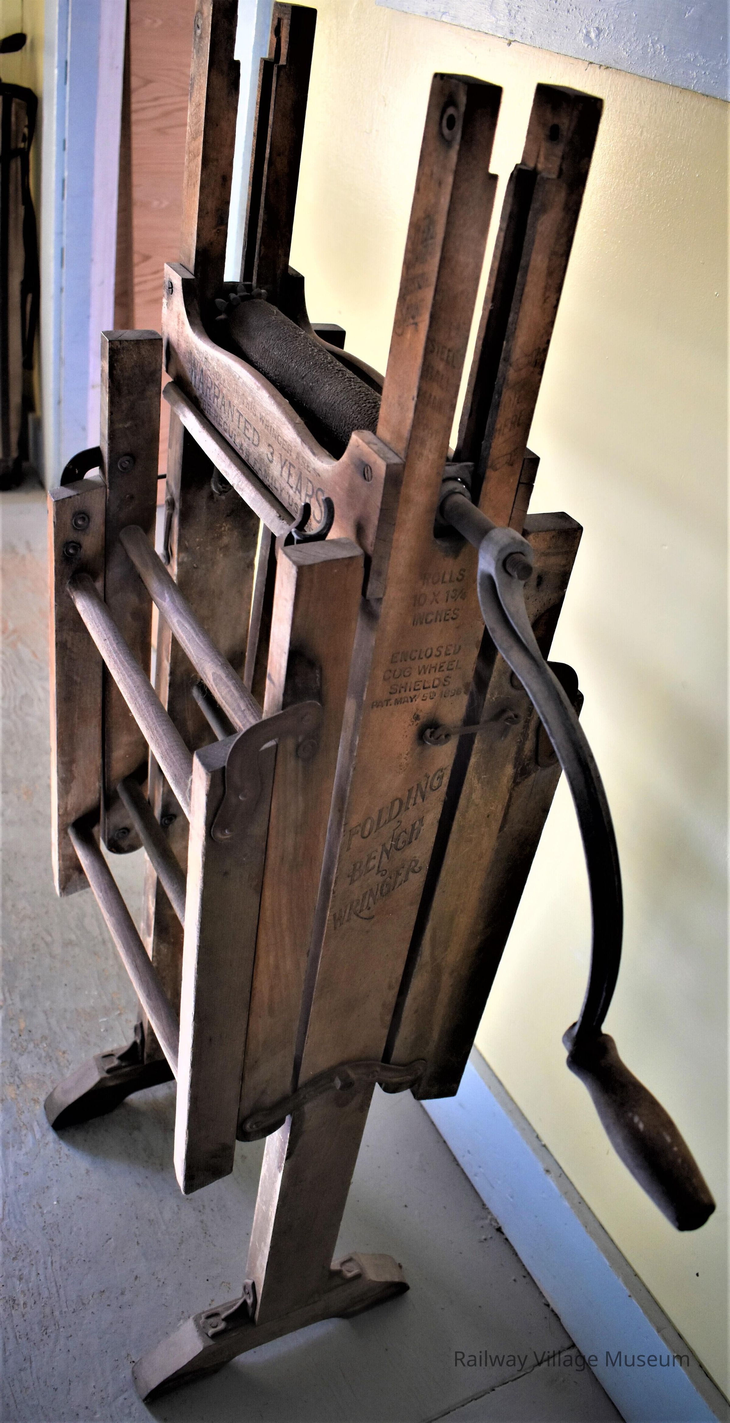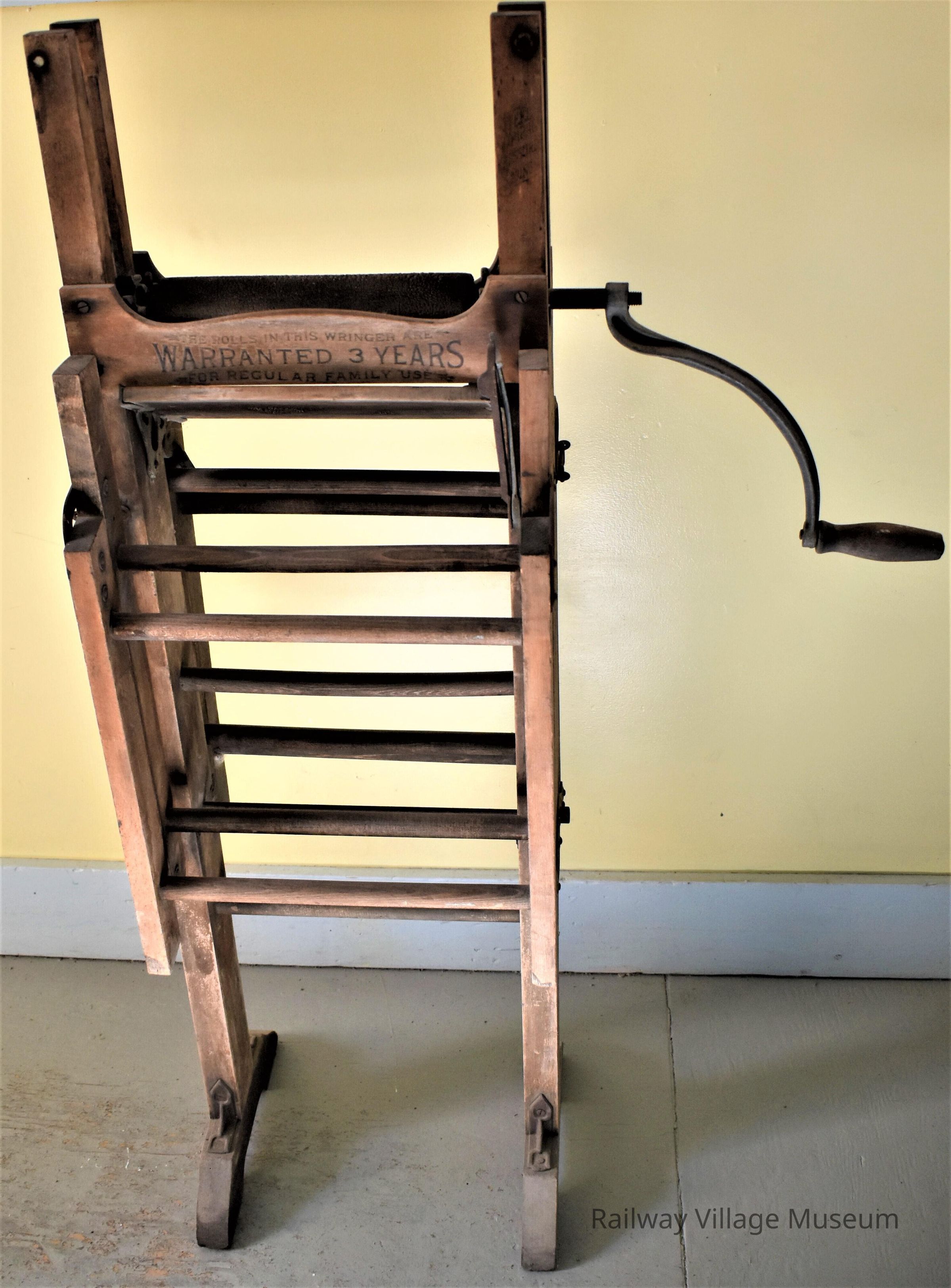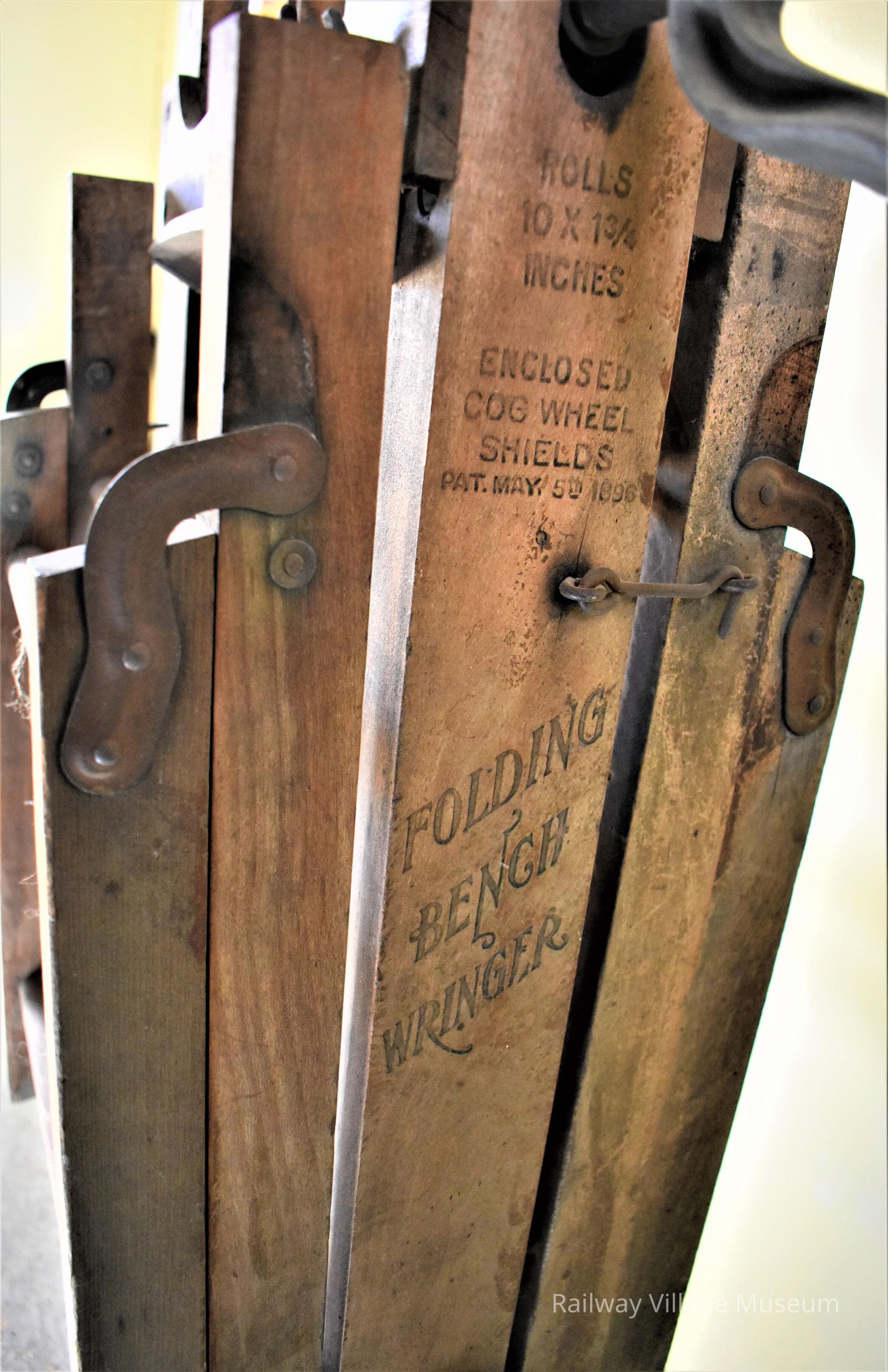 This folding bench wringer acts as a clothes wringer and a bench to air dry the clothes. You can raise or lower the wringer, and the bench part is folded for easy storage.