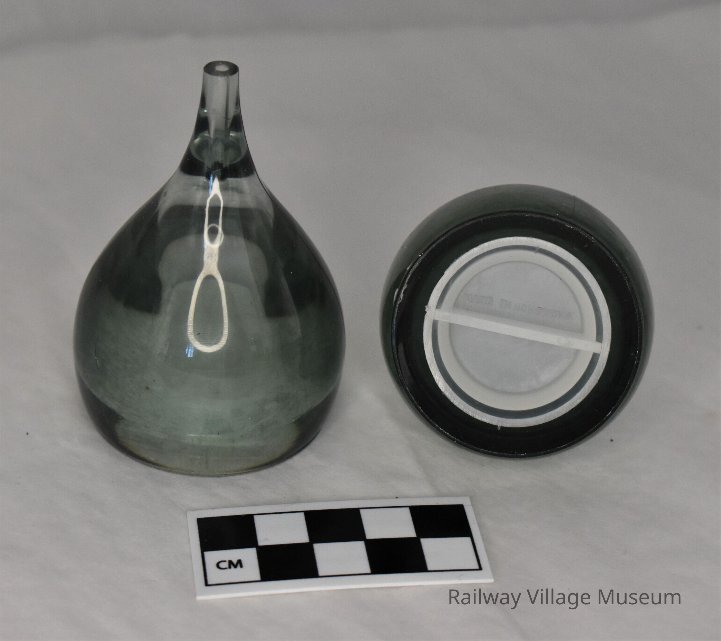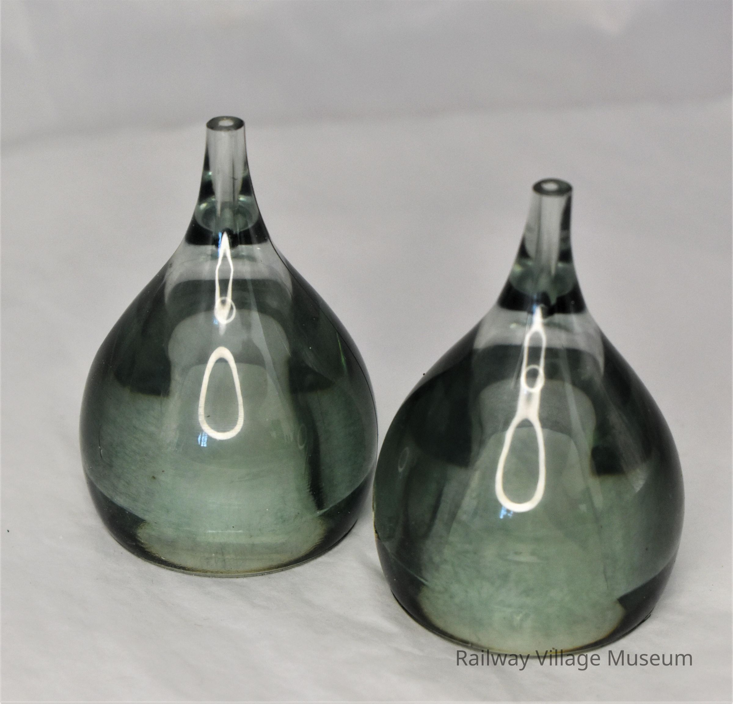 Plastic funnel shaped salt and pepper shakers. Manufacturer is unknown; however, these can be found in a variety of colors. Made in Hong Kong. Both have plastic twist-out stoppers intact.