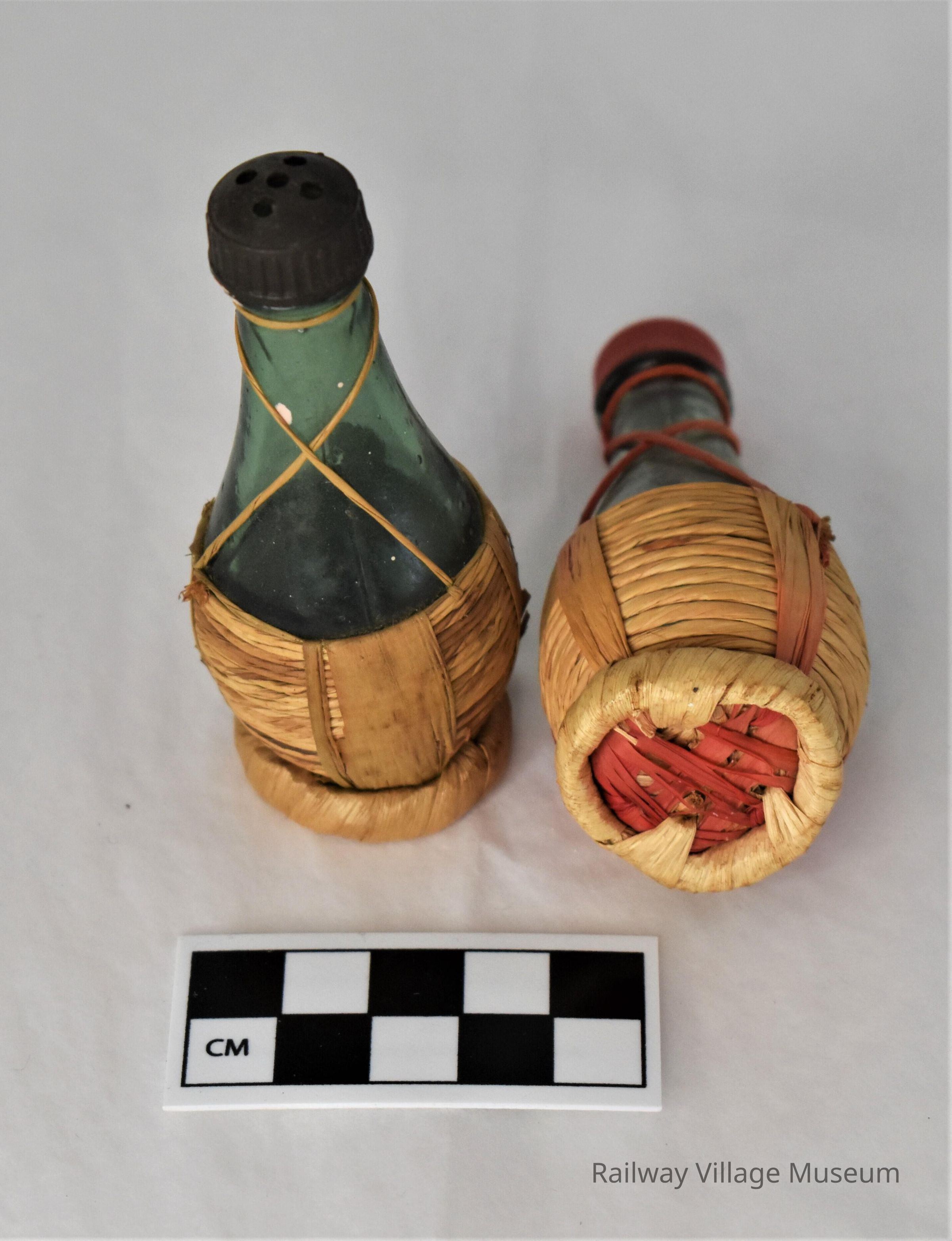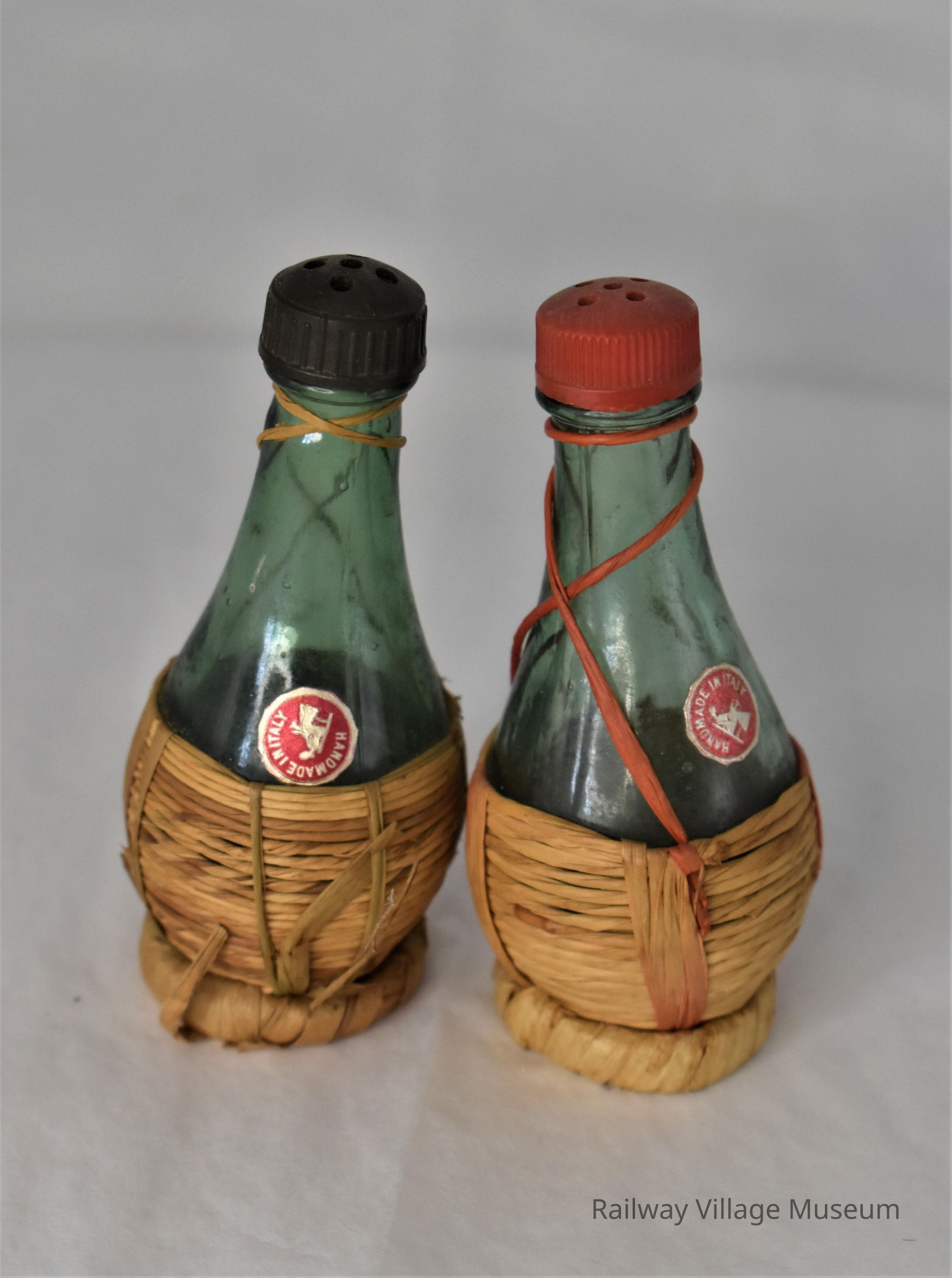 Glass and wicker salt and pepper shakers in the shape of Italian Swiss Colony Chianti wine bottles. Both have red and silver foil stickers that say "Handmade in Italy". One has a black screw top lid and the other a red screw top lid.