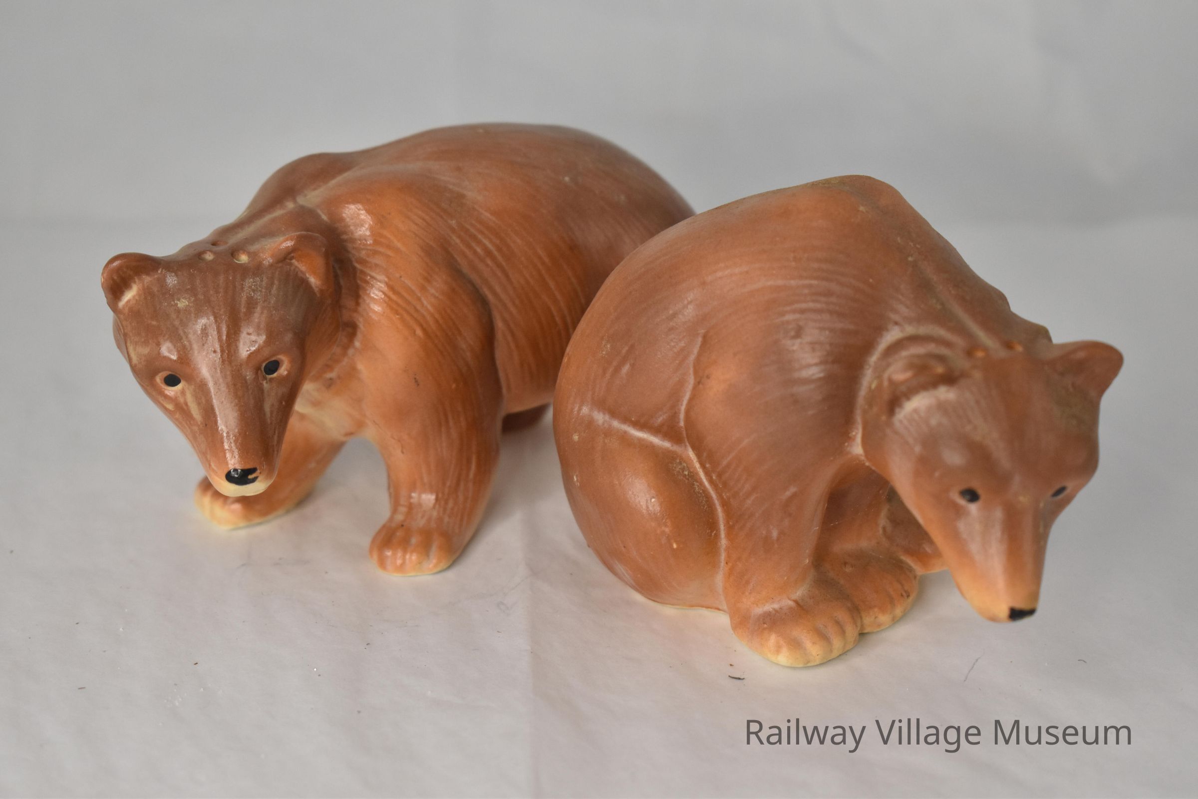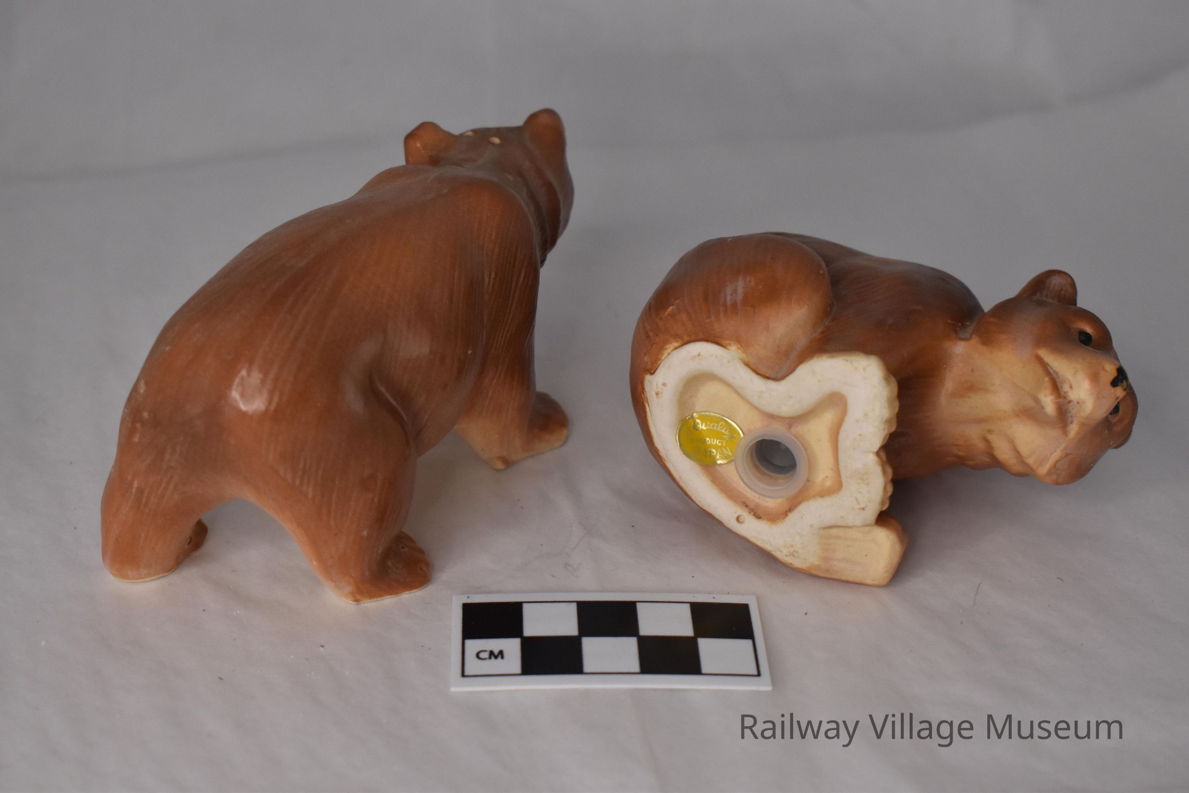 Two ceramic brown bear shakers. One is positioned standing on all four feet and the other is in a seated position. Both have a gold foil sticker on the base that says "A Quality Product Japan". Both have plastic stoppers intact.