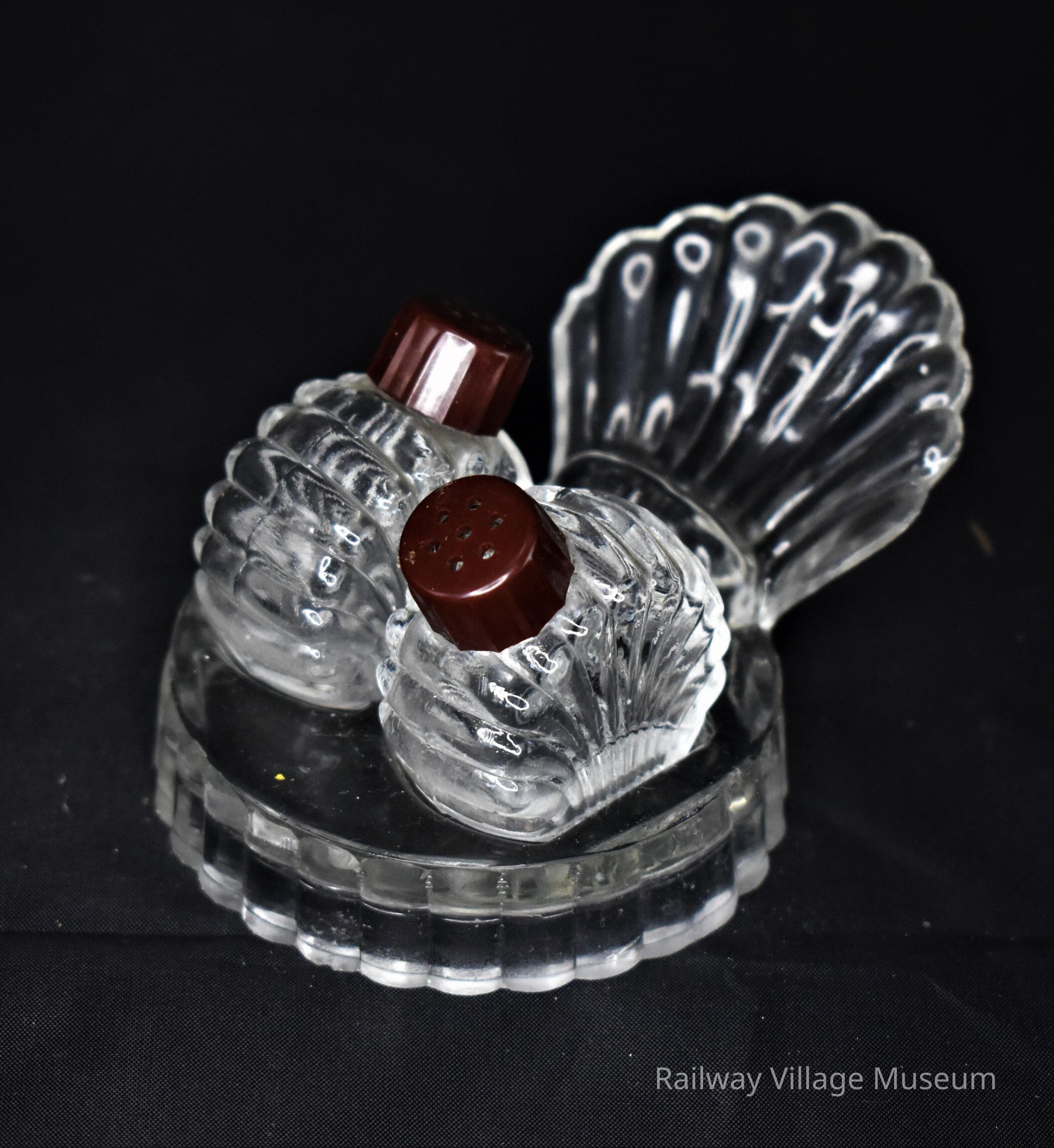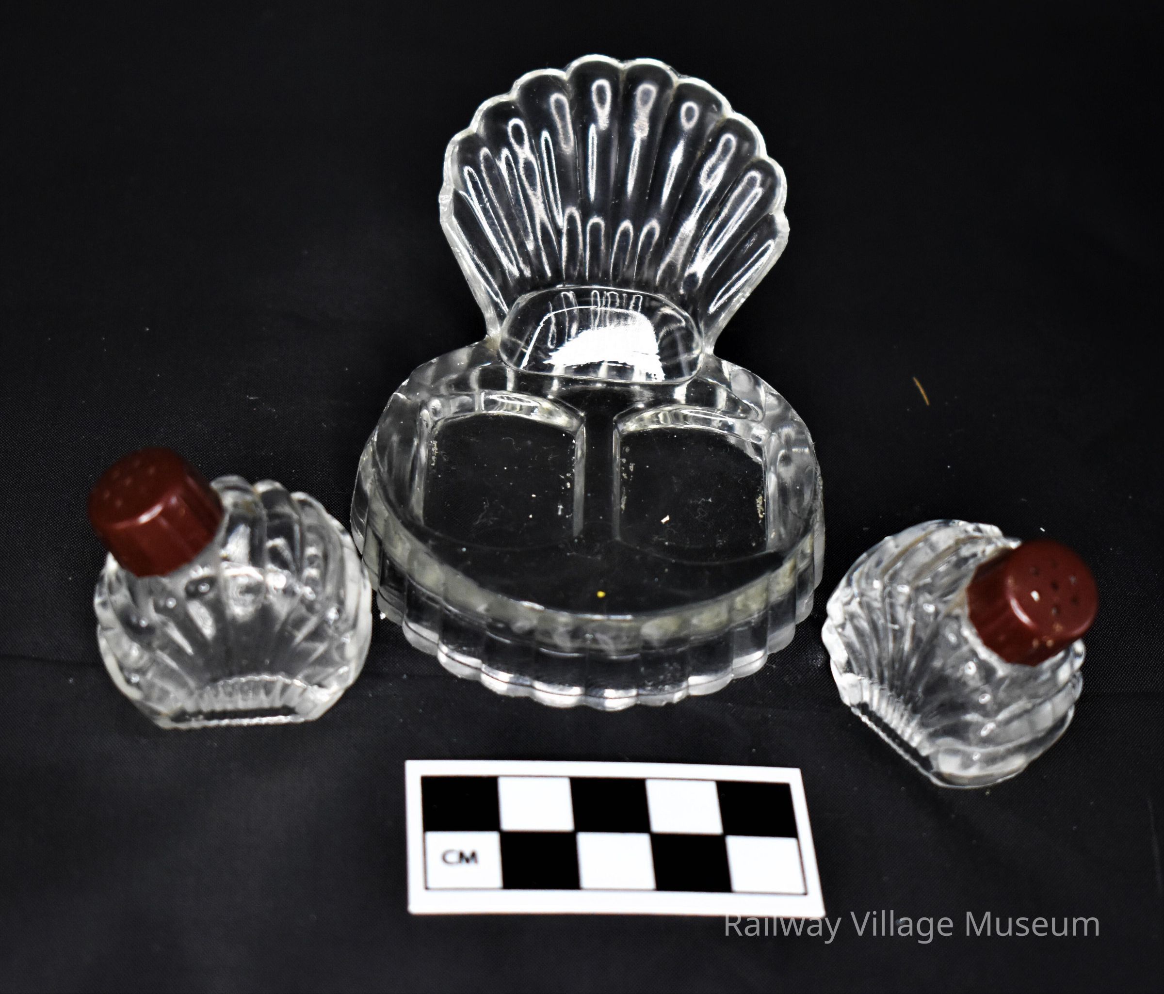 Small glass salt and pepper shakers with plastic lids, nest on a glass base. The general style of the designs is art deco. All parts are unmarked.