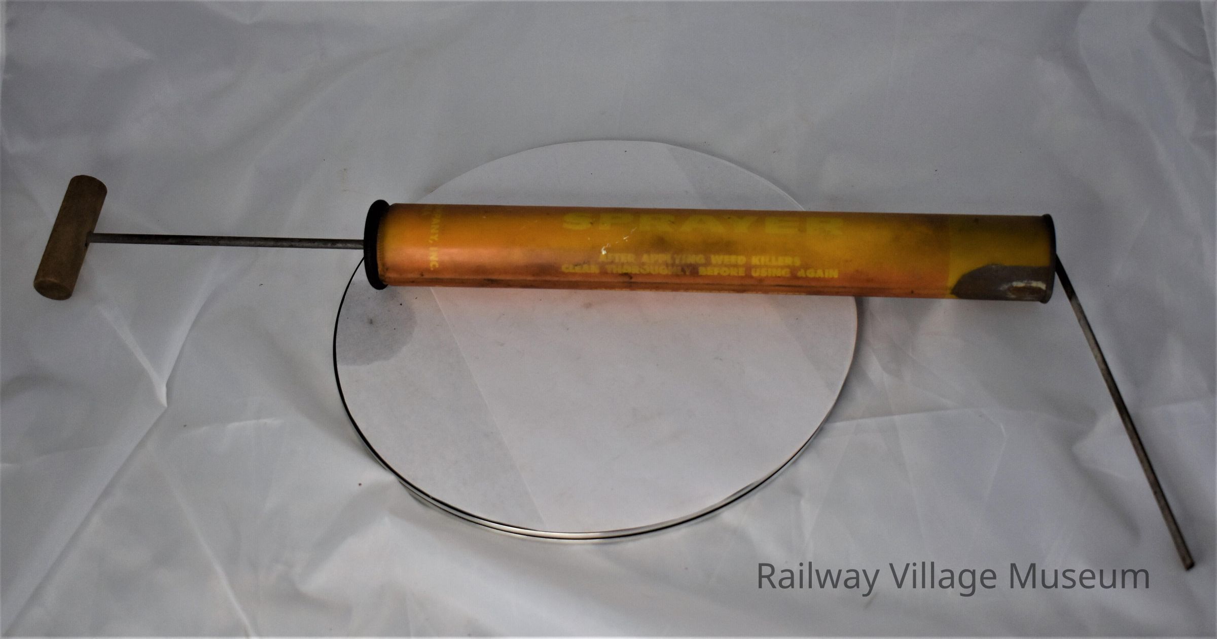 This sprayer and duster was manufactured by Oakes Manufacturing Company, INC. While there is not much to find on Oakes, they were most known for their egg scale. The sprayer itself has been sun damaged, and no longer works.Made/Created