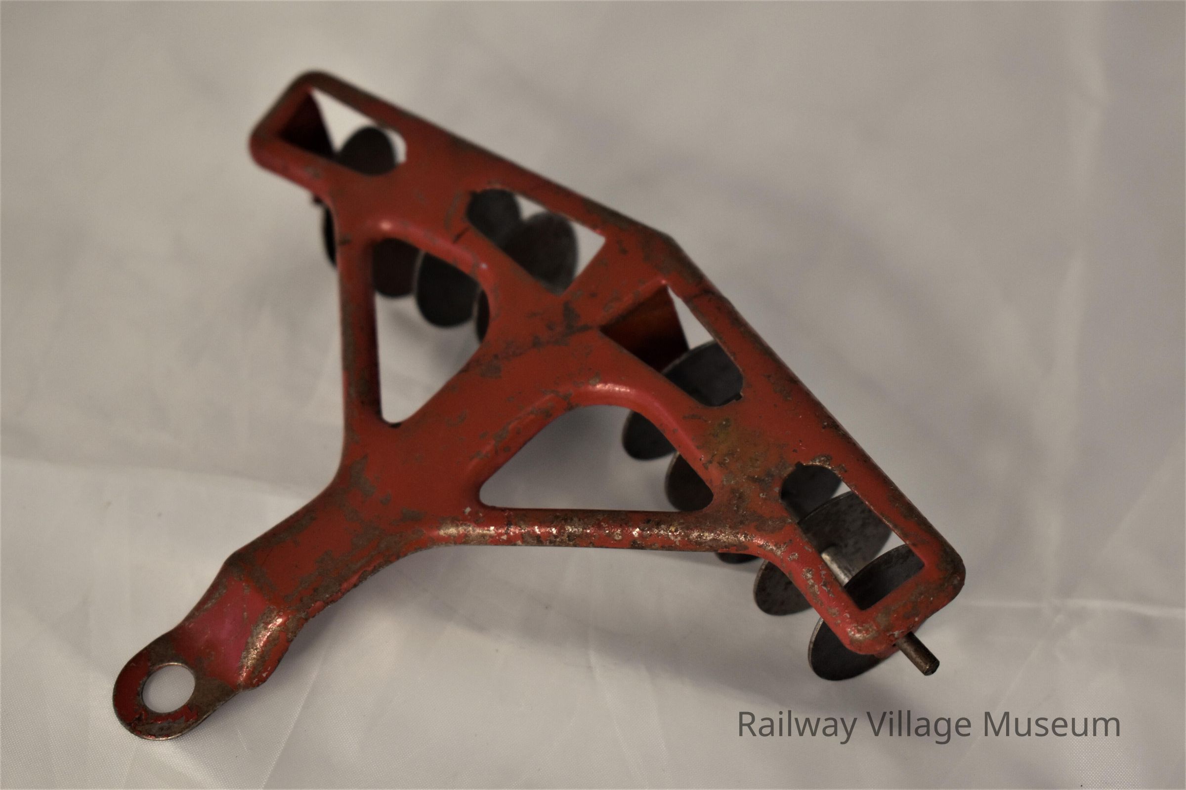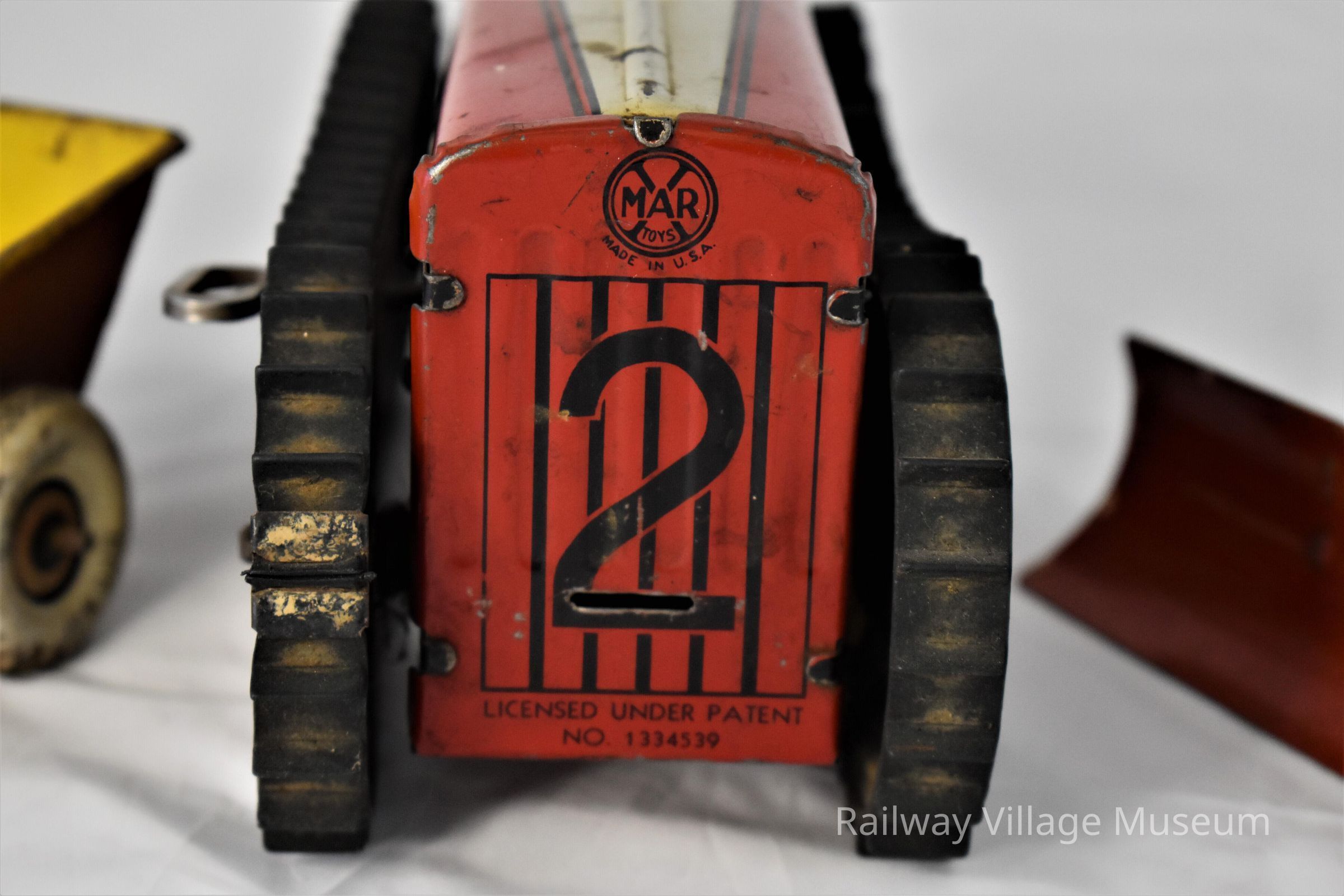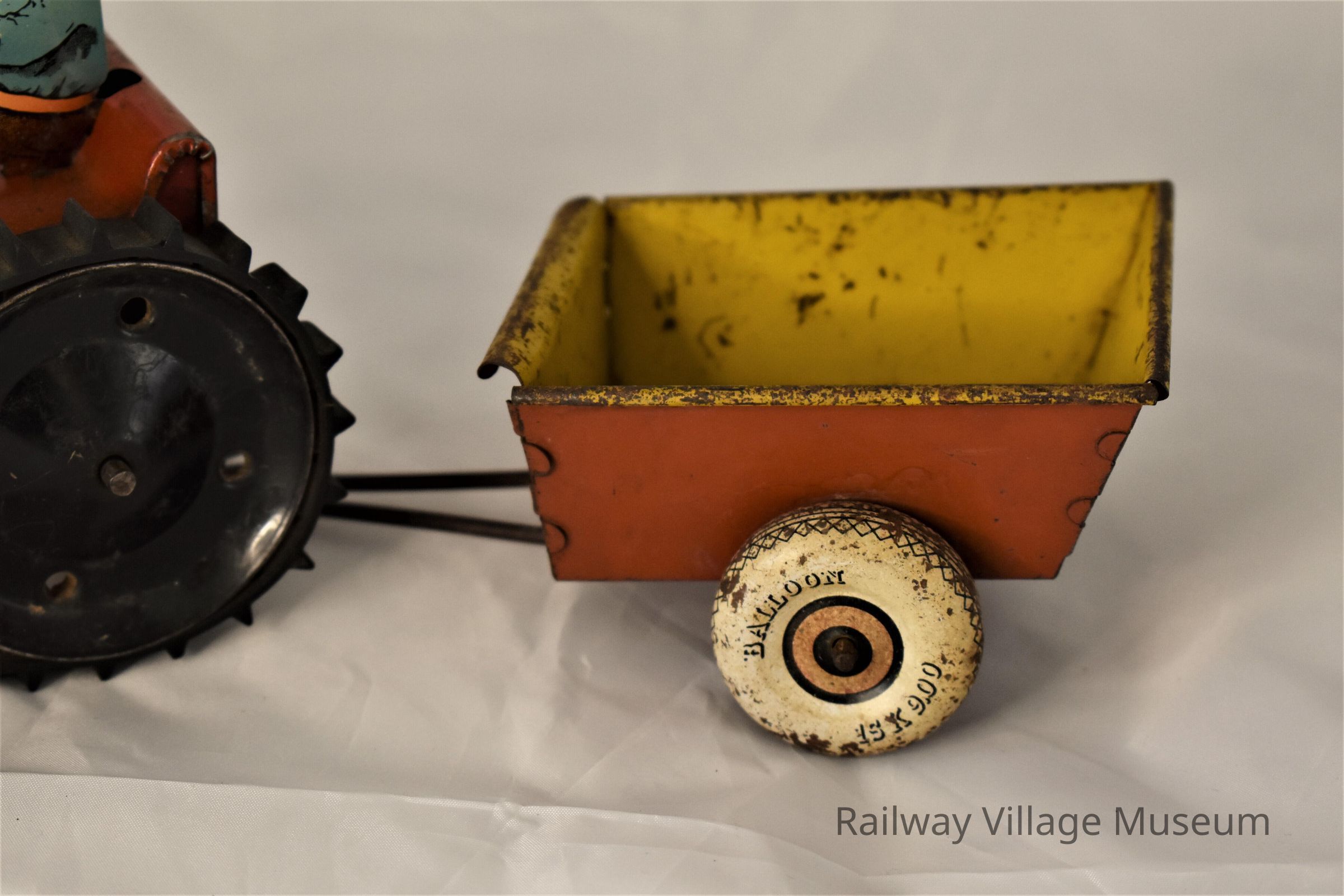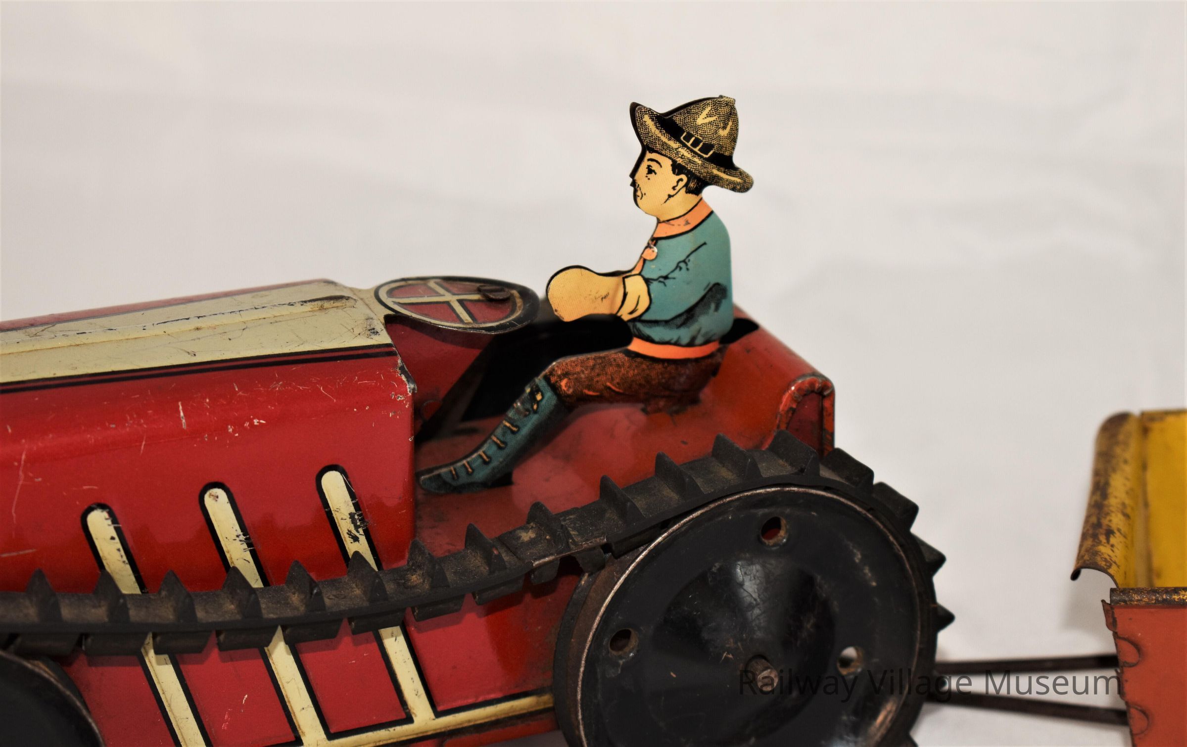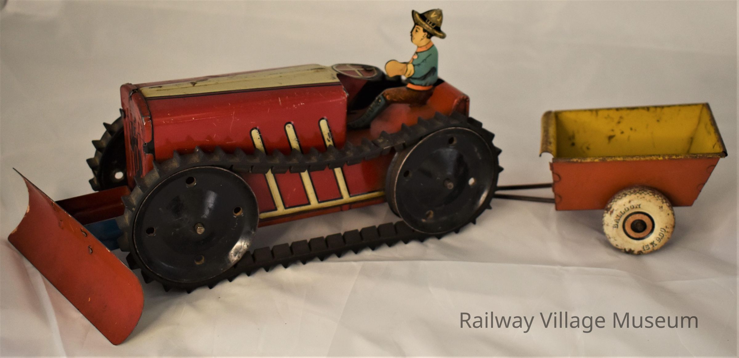 This multi-part lithograph tin toy included a wind-up tractor, rider, plow, trailer, and harrow attachment. The rubber treads were advertised to make the tractor capable of climbing and pulling weight in the trailer.Made/Created