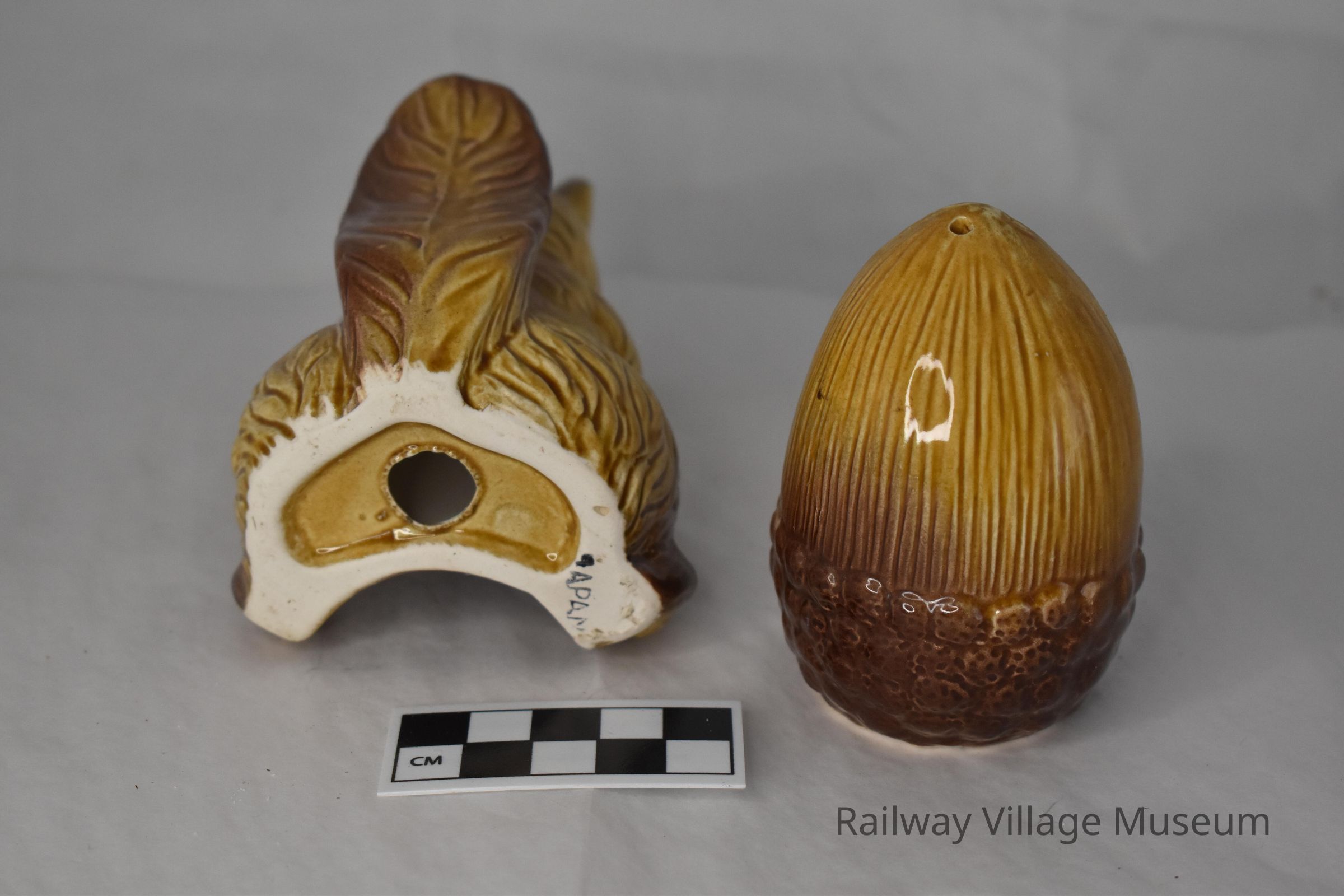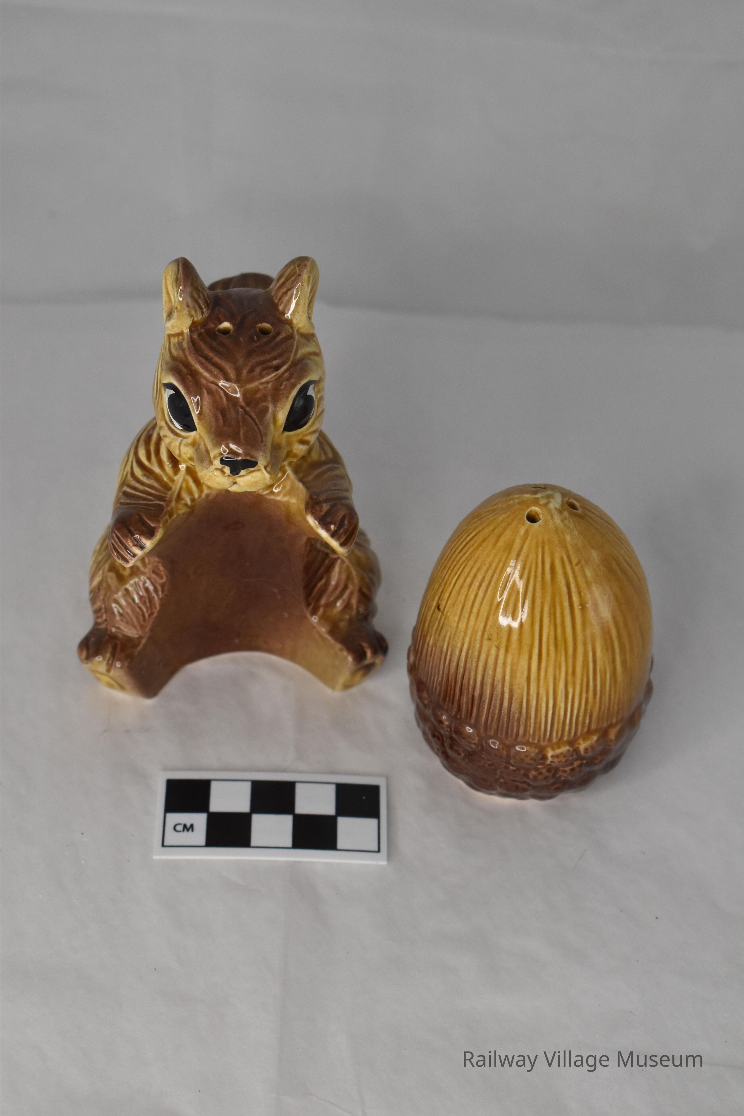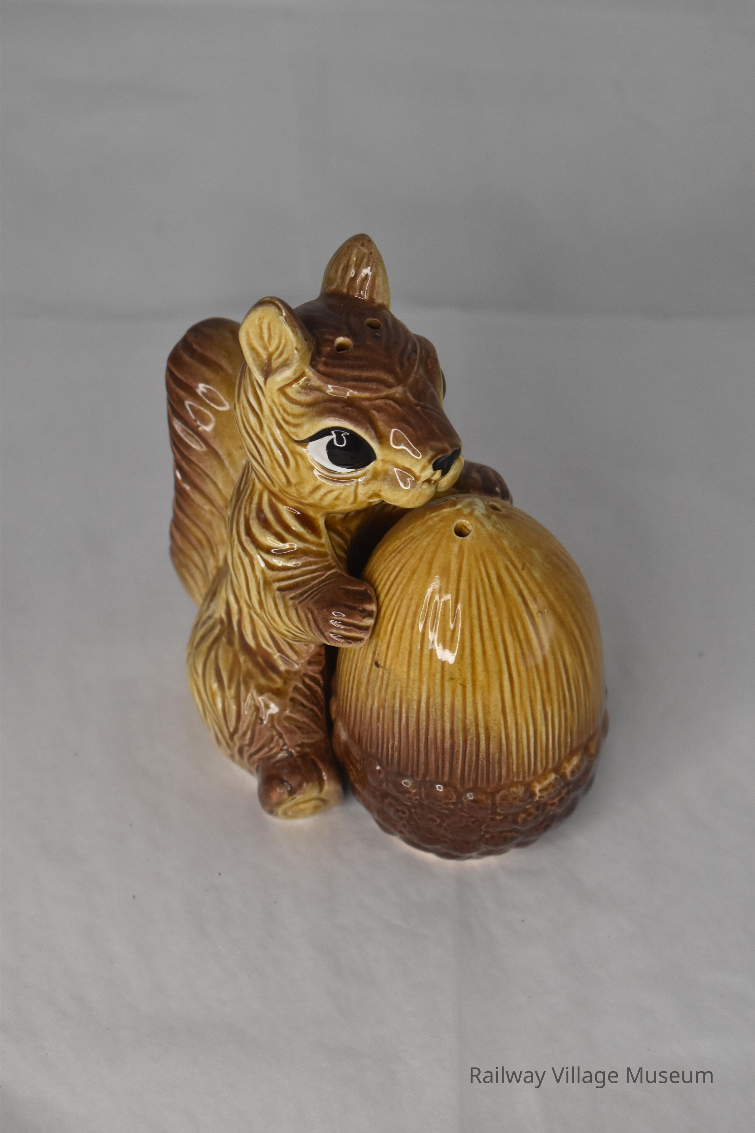 This ceramic squirrel saltshaker is paired with a nested ceramic acorn pepper shaker. They were made in Japan although the manufacturer is unknown. Only the acorn shaker has its plastic stopper still in place.