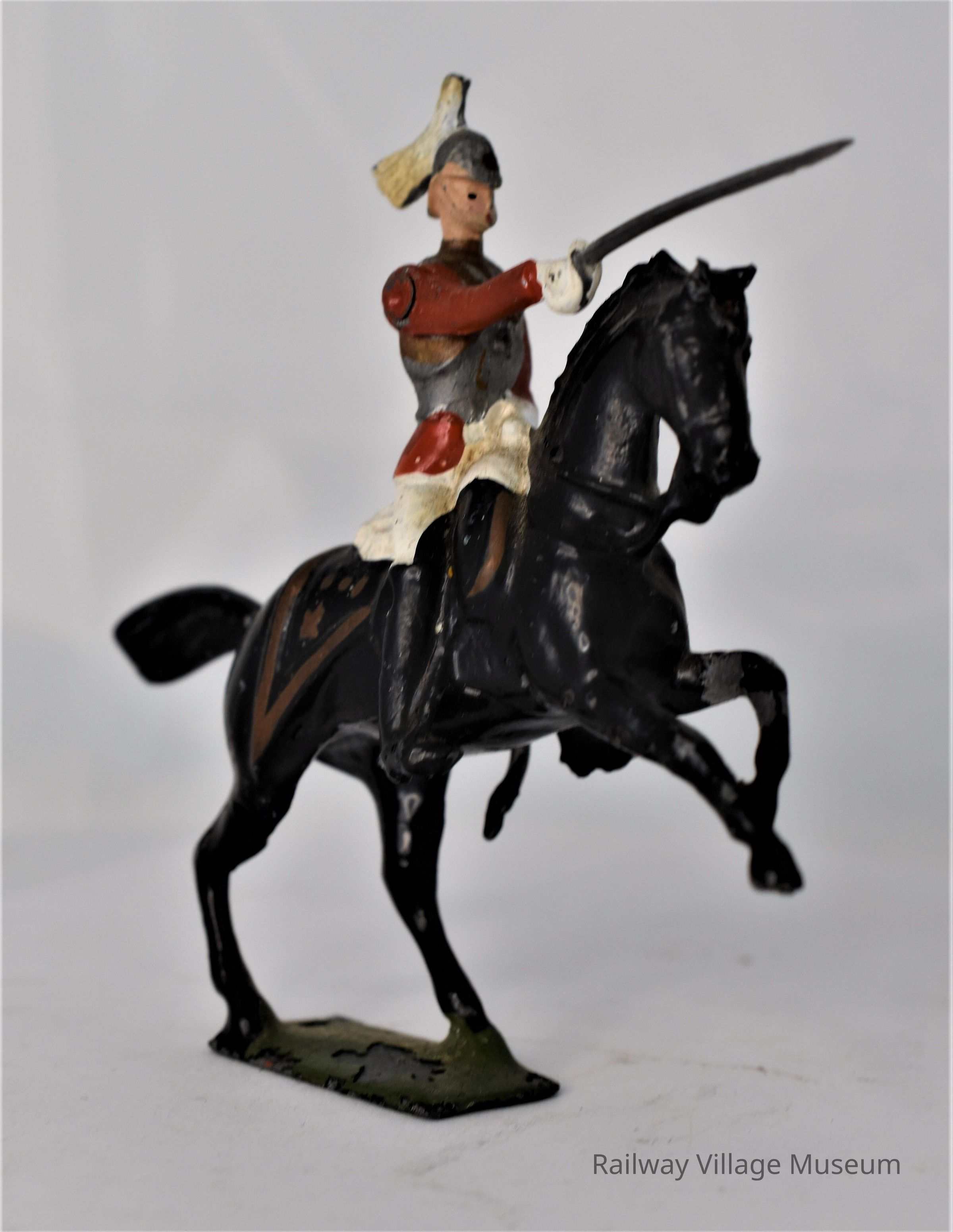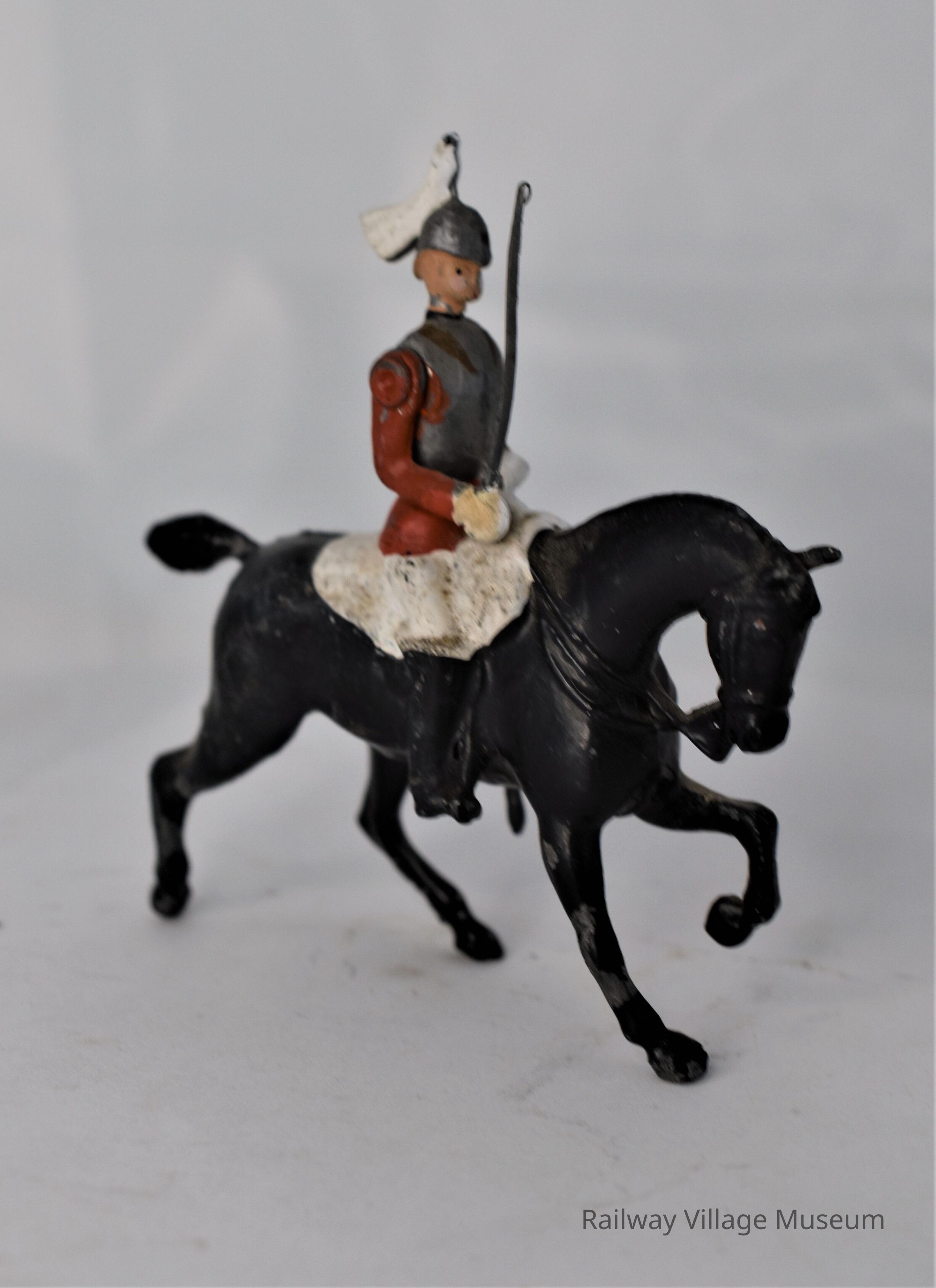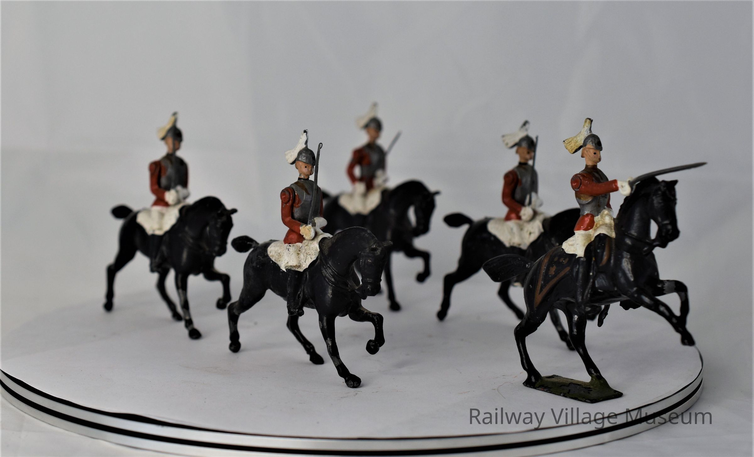 A set of 5 life guards manufactured by Britains LTD. Like most toy soldiers from Britain LTD, these figures have one movable arm, which Britains LTD introduced in 1900. The life guards (not this particular set) were the first toy soldiers Britains LTD manufactured.