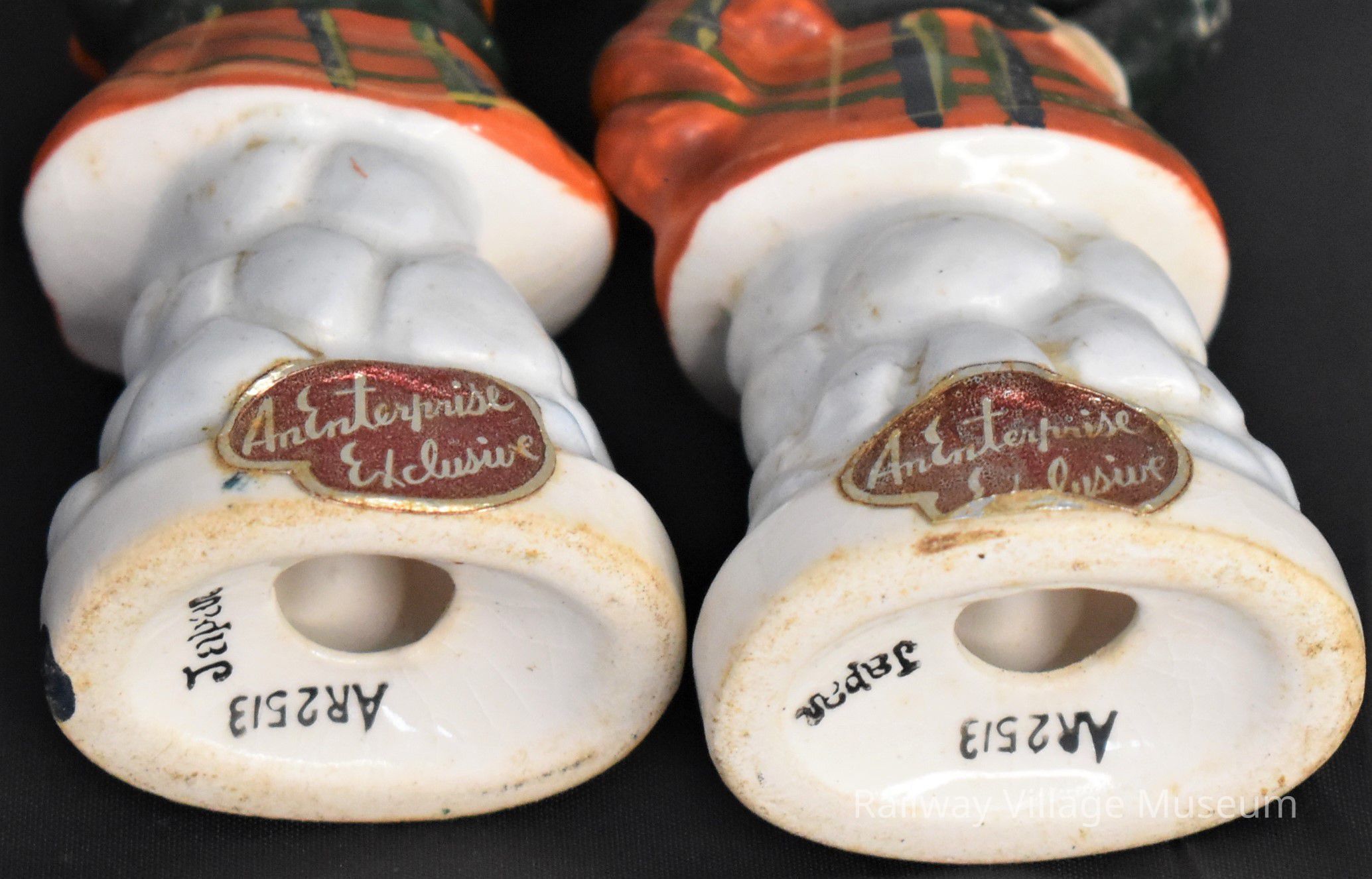 Vintage waving ceramic boy and girl salt & pepper shakers dressed in Scottish outfits with "Cape Breton N.S." written on the front base of each. They have their original labels: "An Enterprise Exclusive Made in Japan". (Lefton China was known as Enterprise Exclusive in Canada). Each shaker is stamped on the bottom "AR2153" and "Japan".