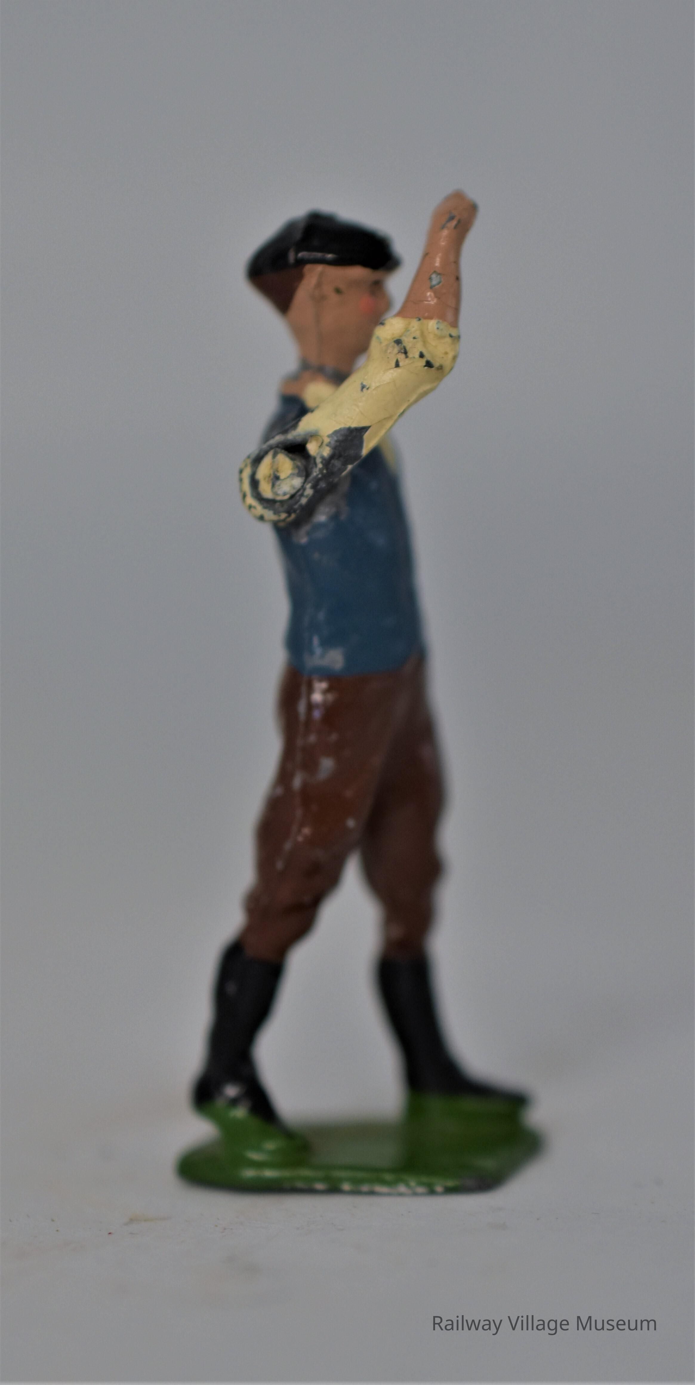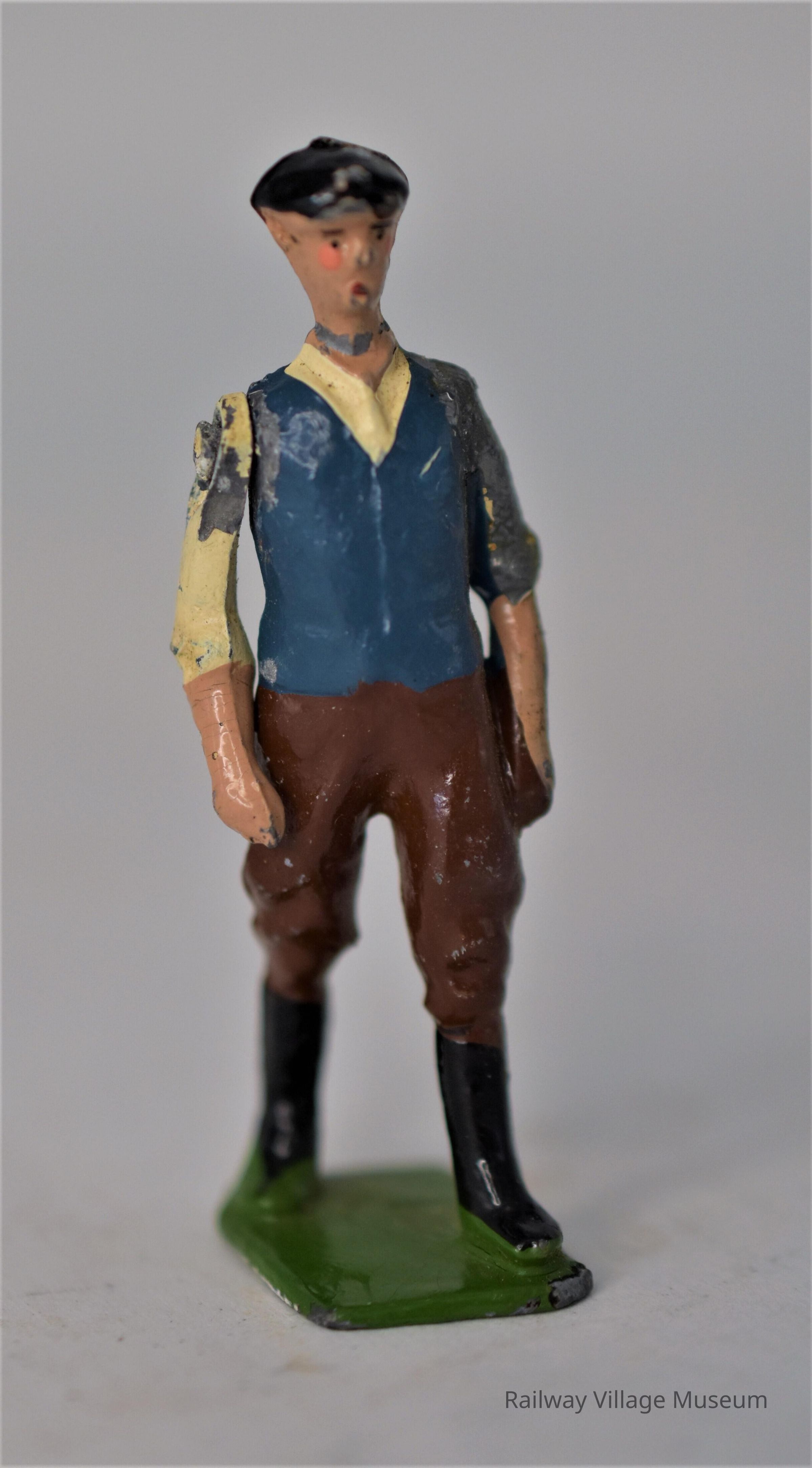 This Britains LTD stable boy goes with entry 2021.1.47. He is wearing a white shirt with a blue vest, brown trousers, black boots, and a black cap. He has one movable arm.Made/Created