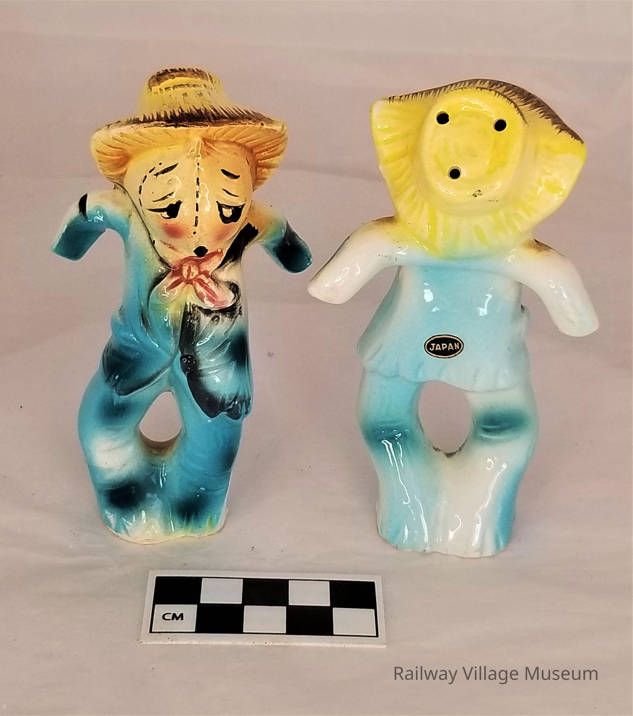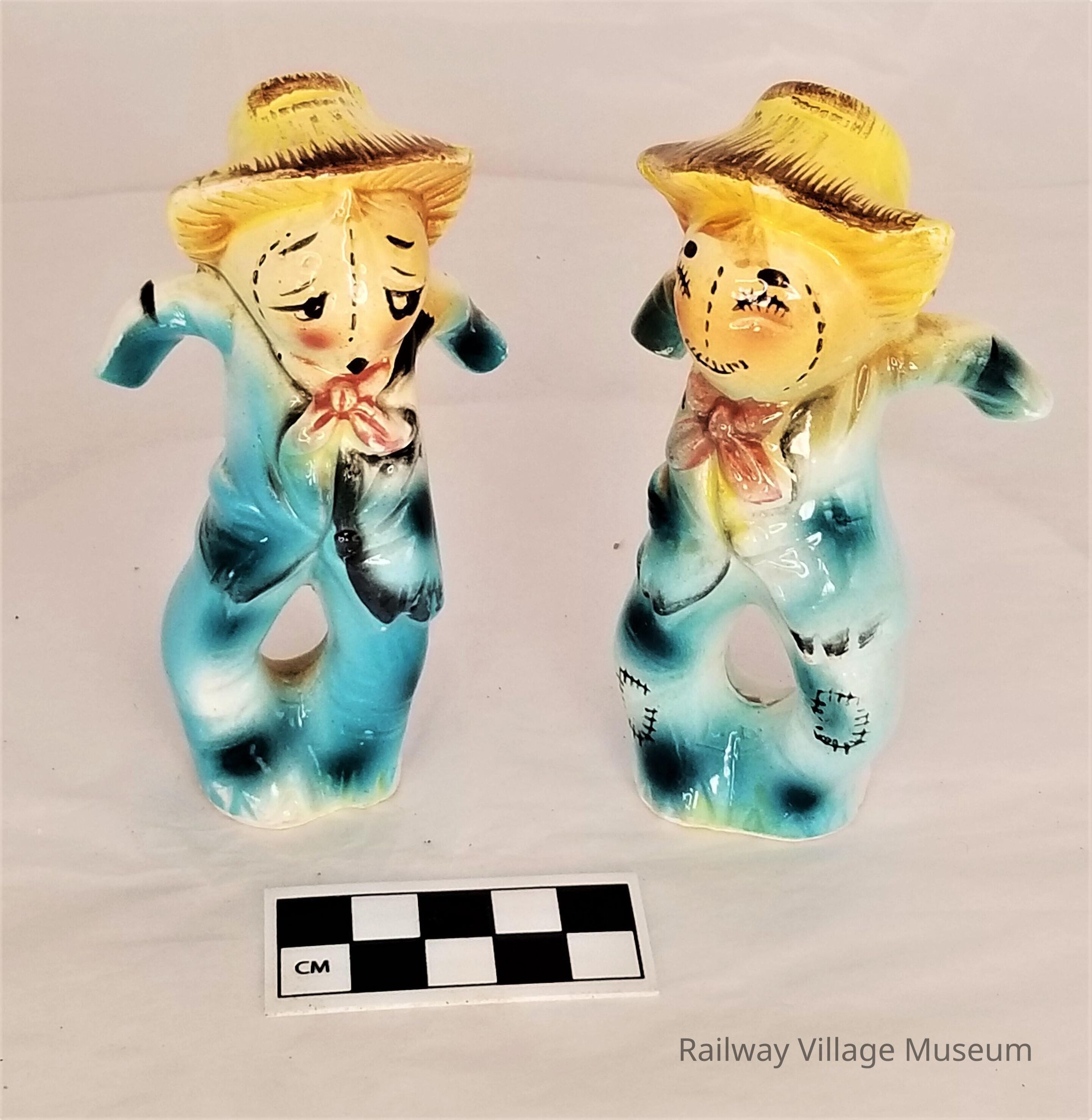 One happy and one sad ceramic scarecrow make up this pair of shakers. They are hand-painted and marked as being made in Japan. They are possibly made by the Holt Howard company, but this is unclear.