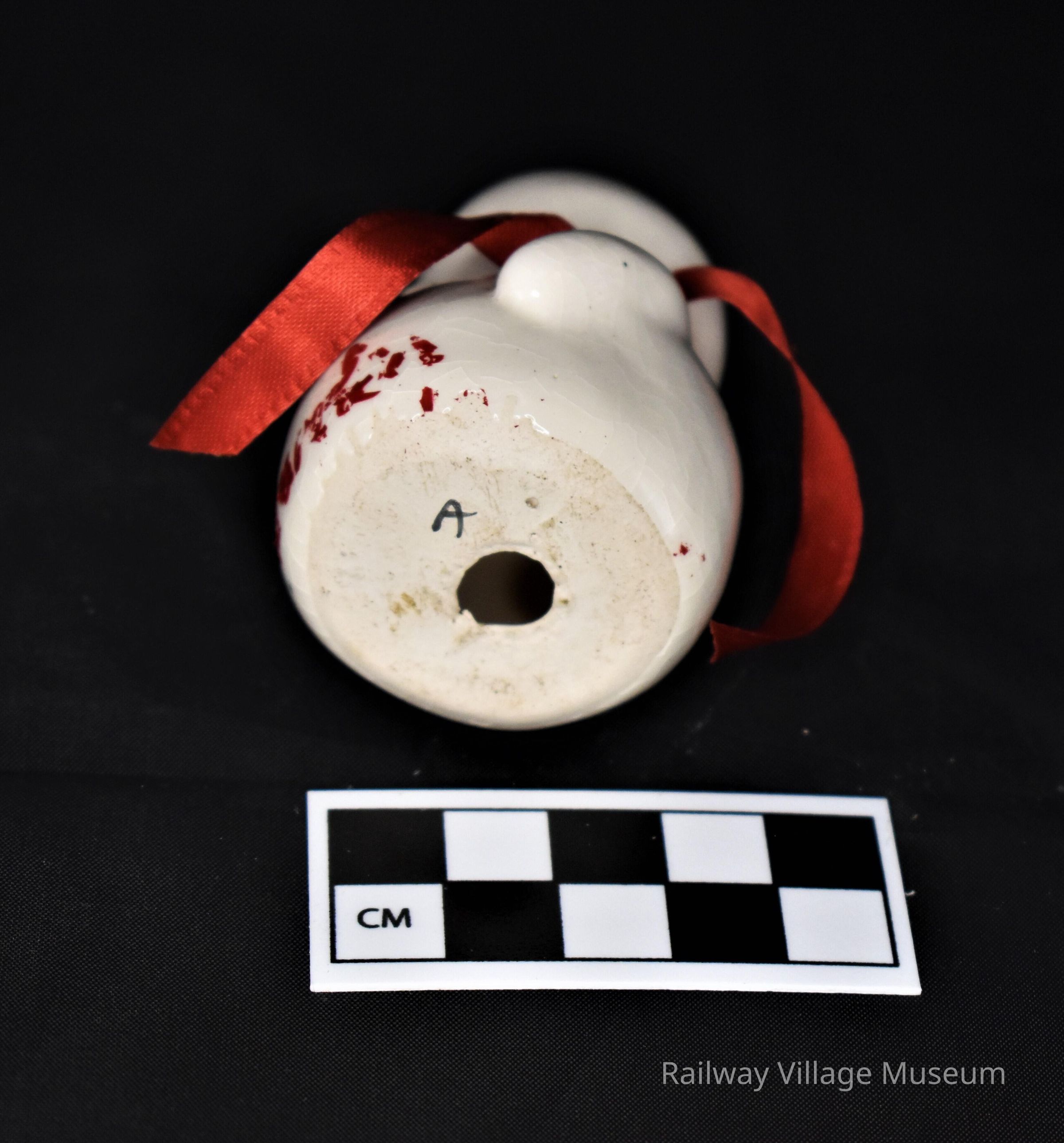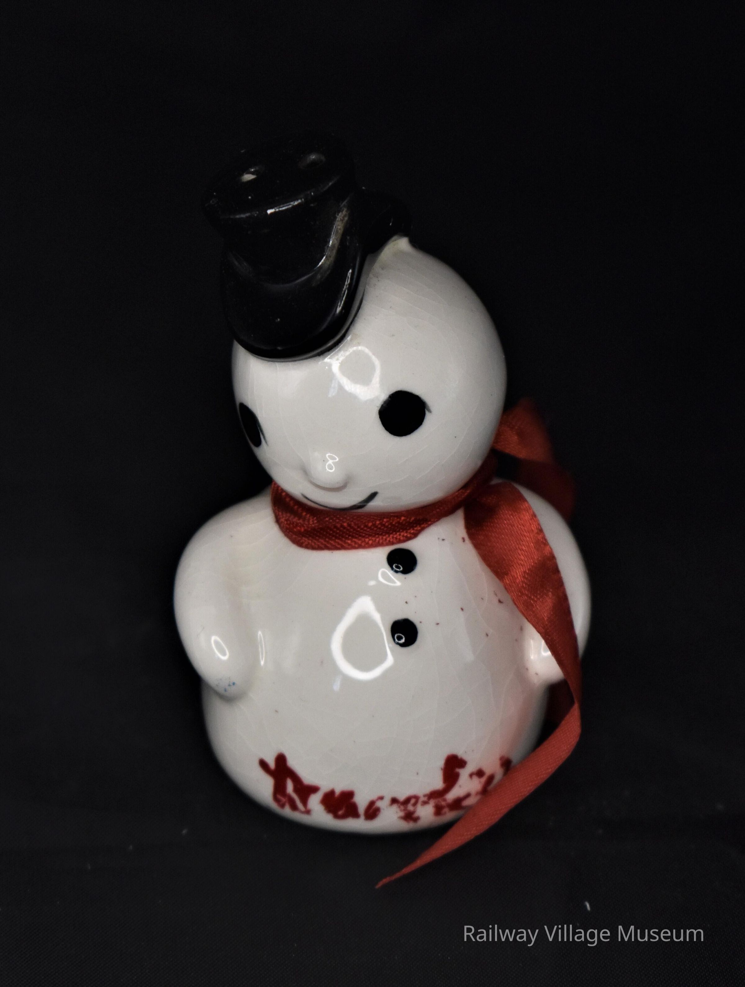 This single snowman shaped shaker has a red ribbon tied as a scarf and a black top hat. Unmarked, other than a handwritten letter A on the base. Something was handpainted in red paint on top of the glaze near the bottom of the snowman, however, the paint has chipped away so it is illegible.Lexicon