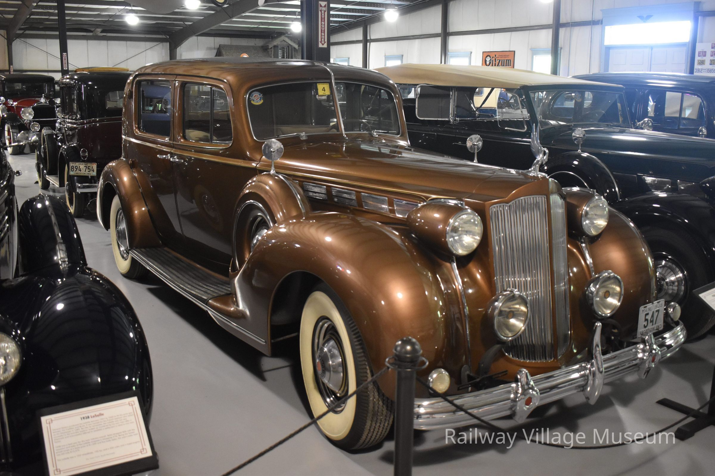 This 1938 Packard is part of their 16th series. It is equipped with an L-head inline eight-cylinder engine that produces 130 hp. Additional features include a Stromberg carburetor, fender wells, center bumper guards, 134" wheelbase, and a 25-gallon fuel tank. Optional features were an electric clock, cigar lighter, whitewall tires, and a guest speaker mounted on the back of the driver's seat. The original price was $2,990.