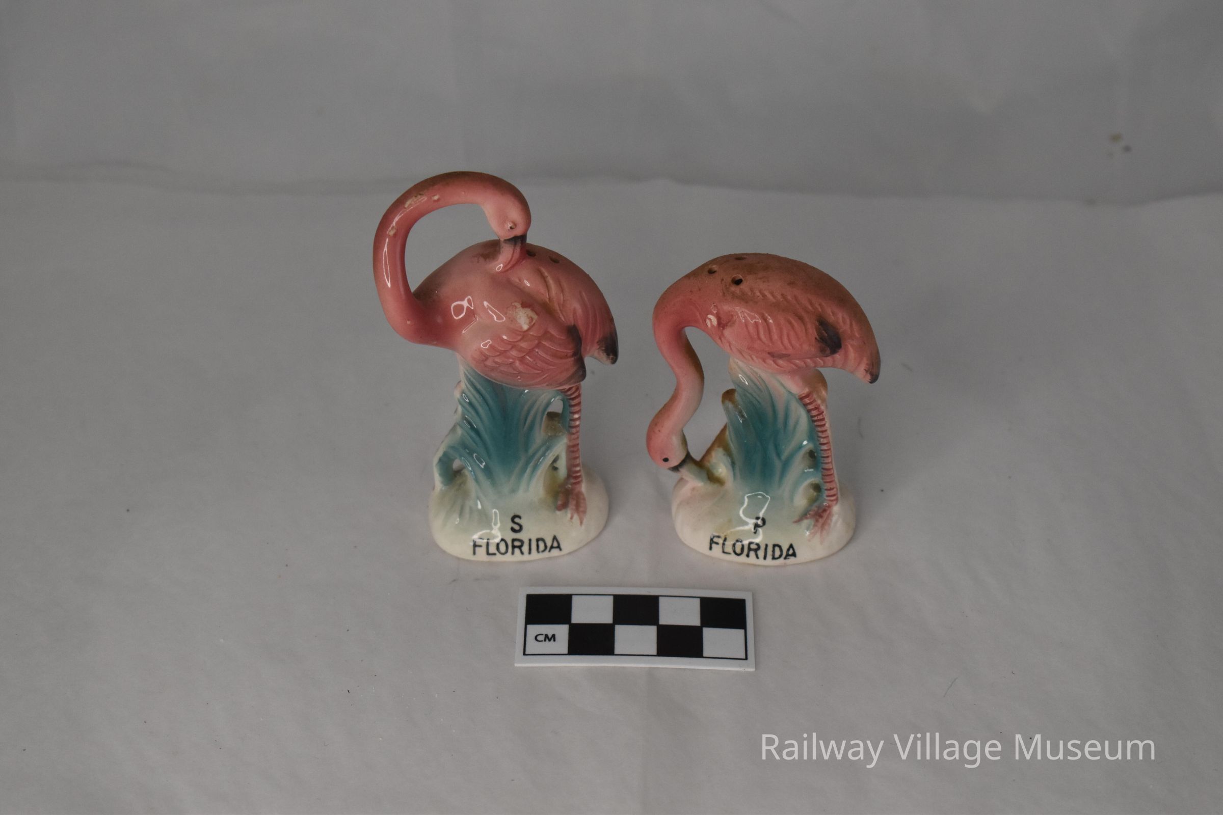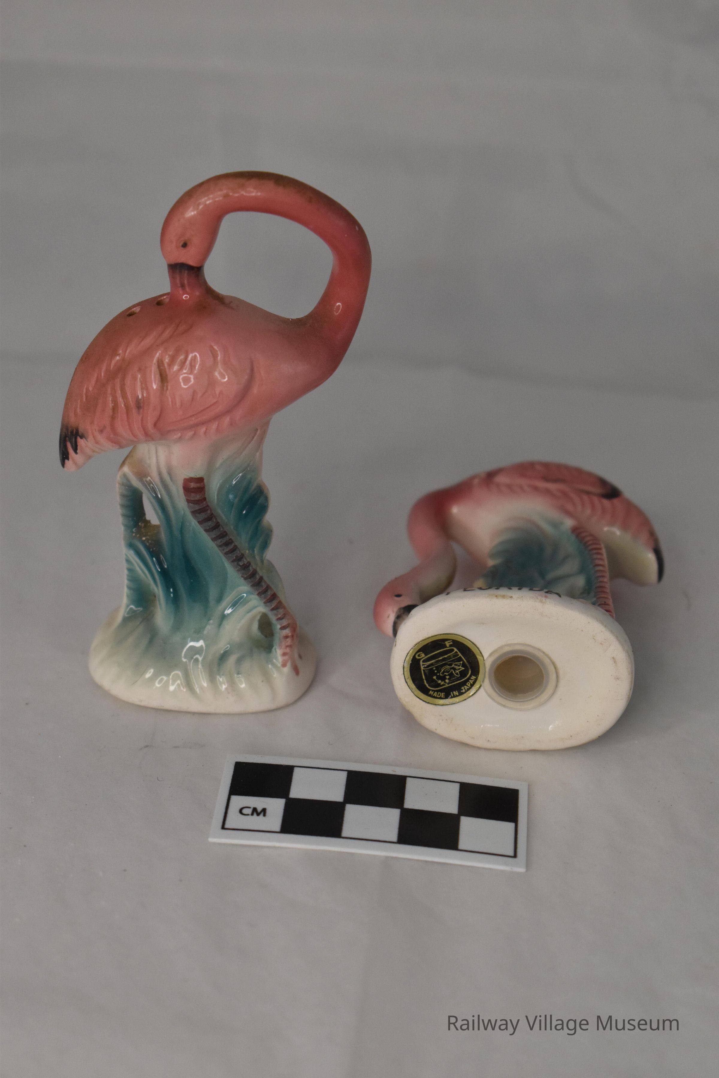 Ceramic flamingo salt and pepper shaker souvenirs from Florida. The saltshaker has a flamingo with its head up and the pepper has its head down. Made in Japan. Manufacturer unknown, however, the pepper shaker has a foil sticker on the base with a fishbowl logo, the letters "G F", and "Made in Japan".