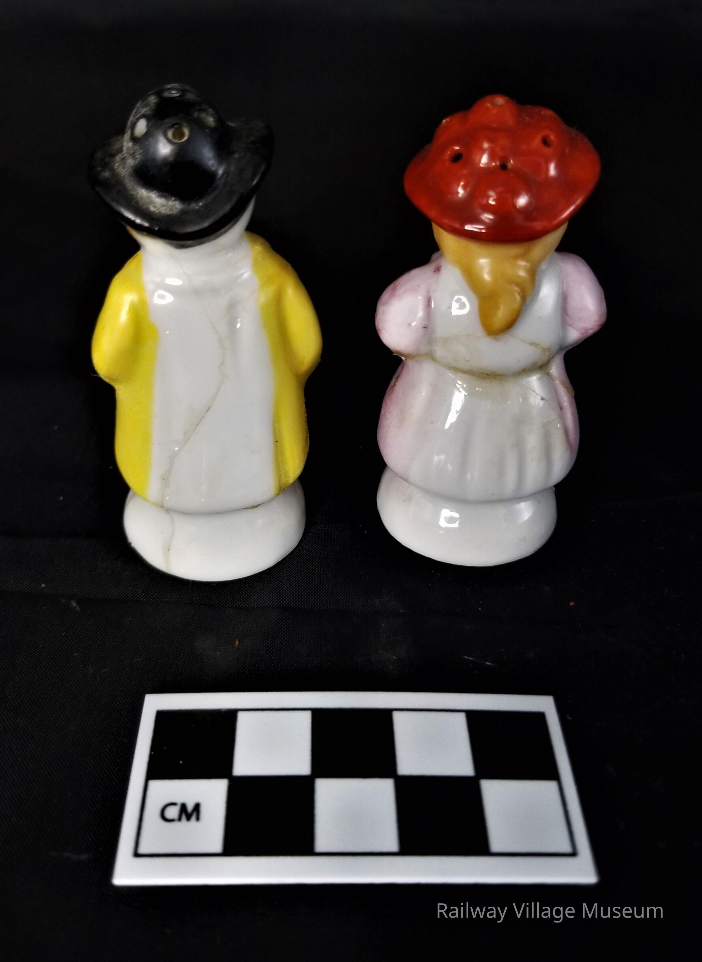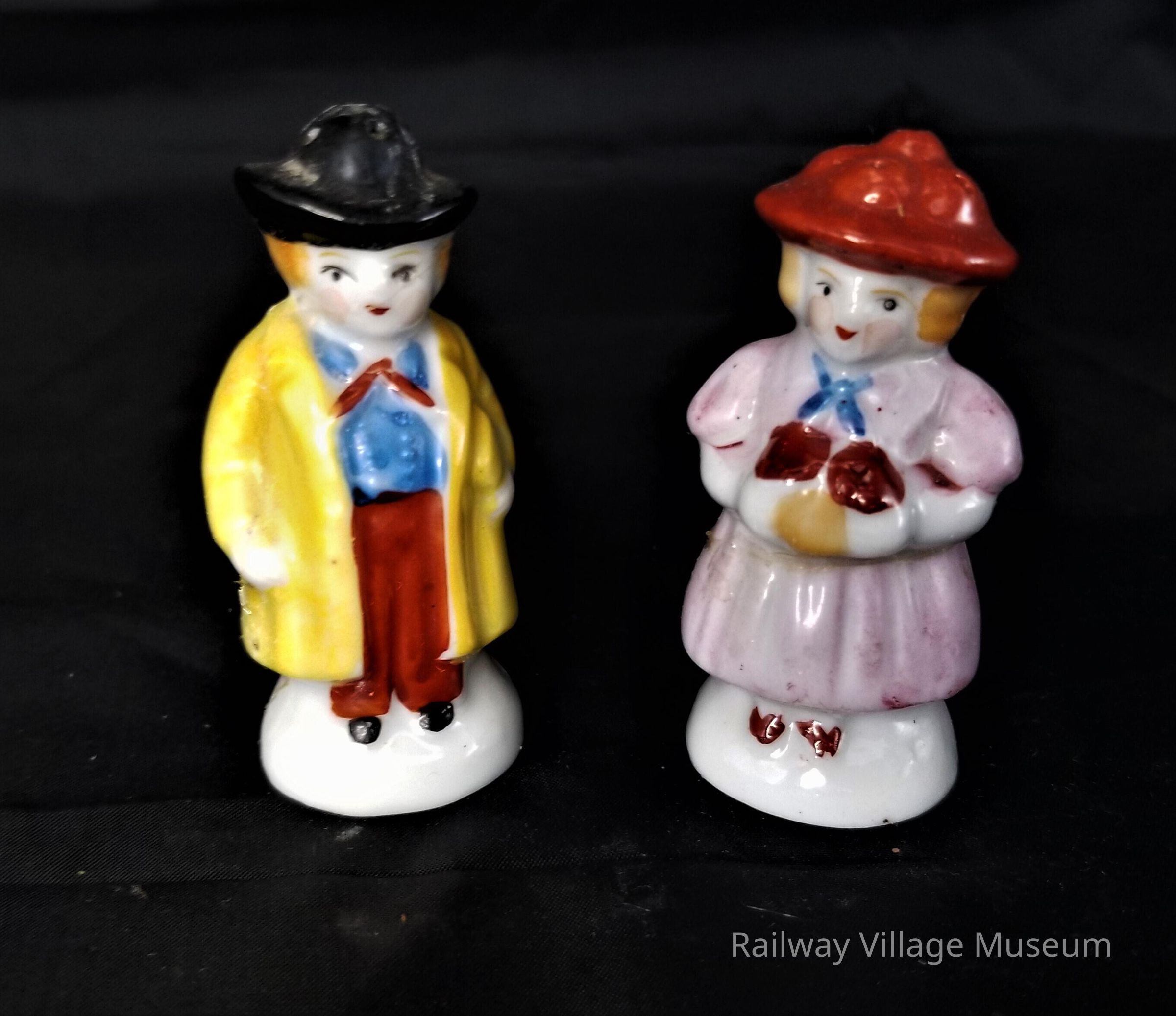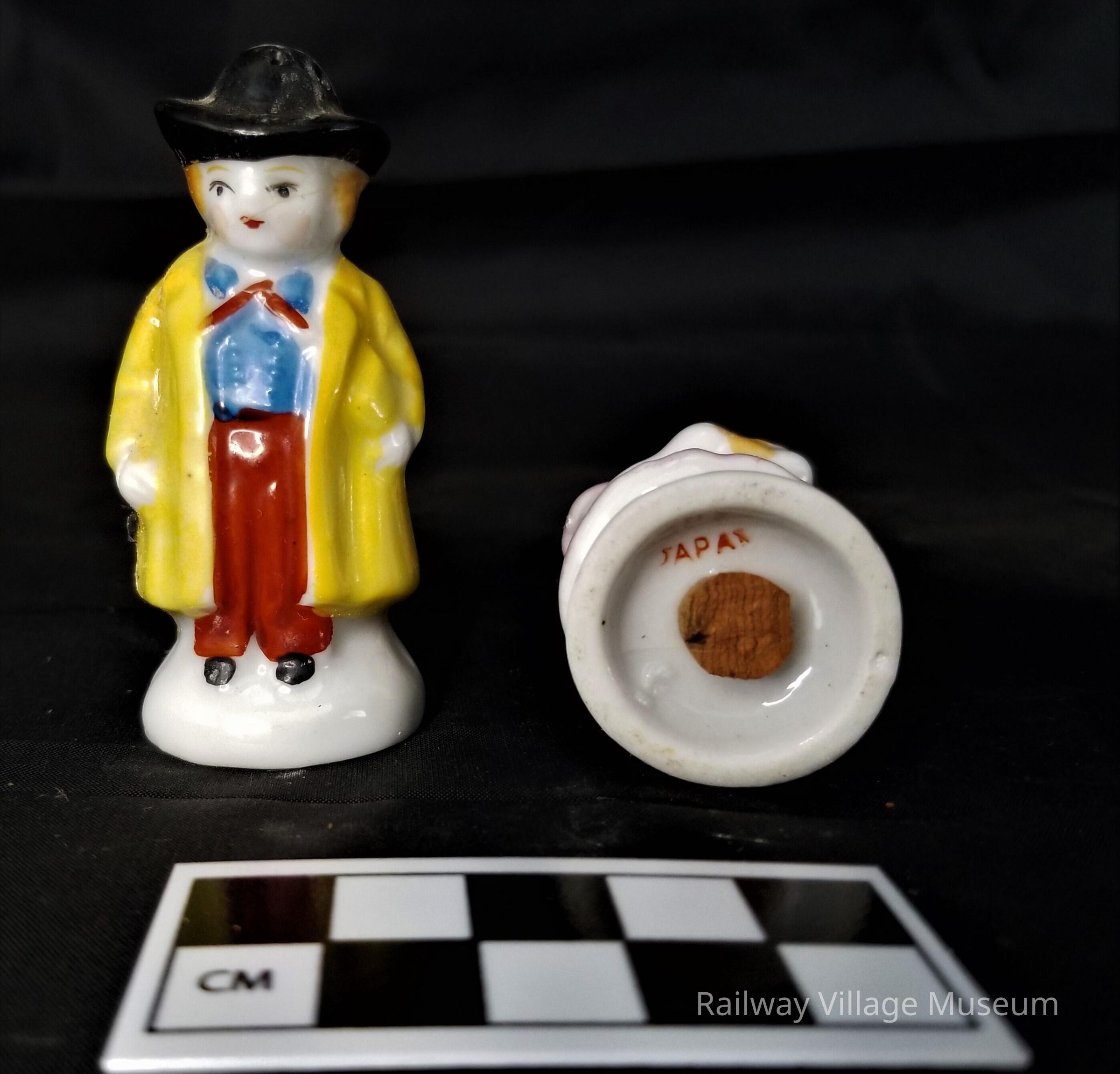 Mid-century ceramic shakers made in Japan. Hand-painted Colonial-style couple. Back of character minimally painted. Cork stoppers in place. Cracks noticeable on both. Possible repairs in both.