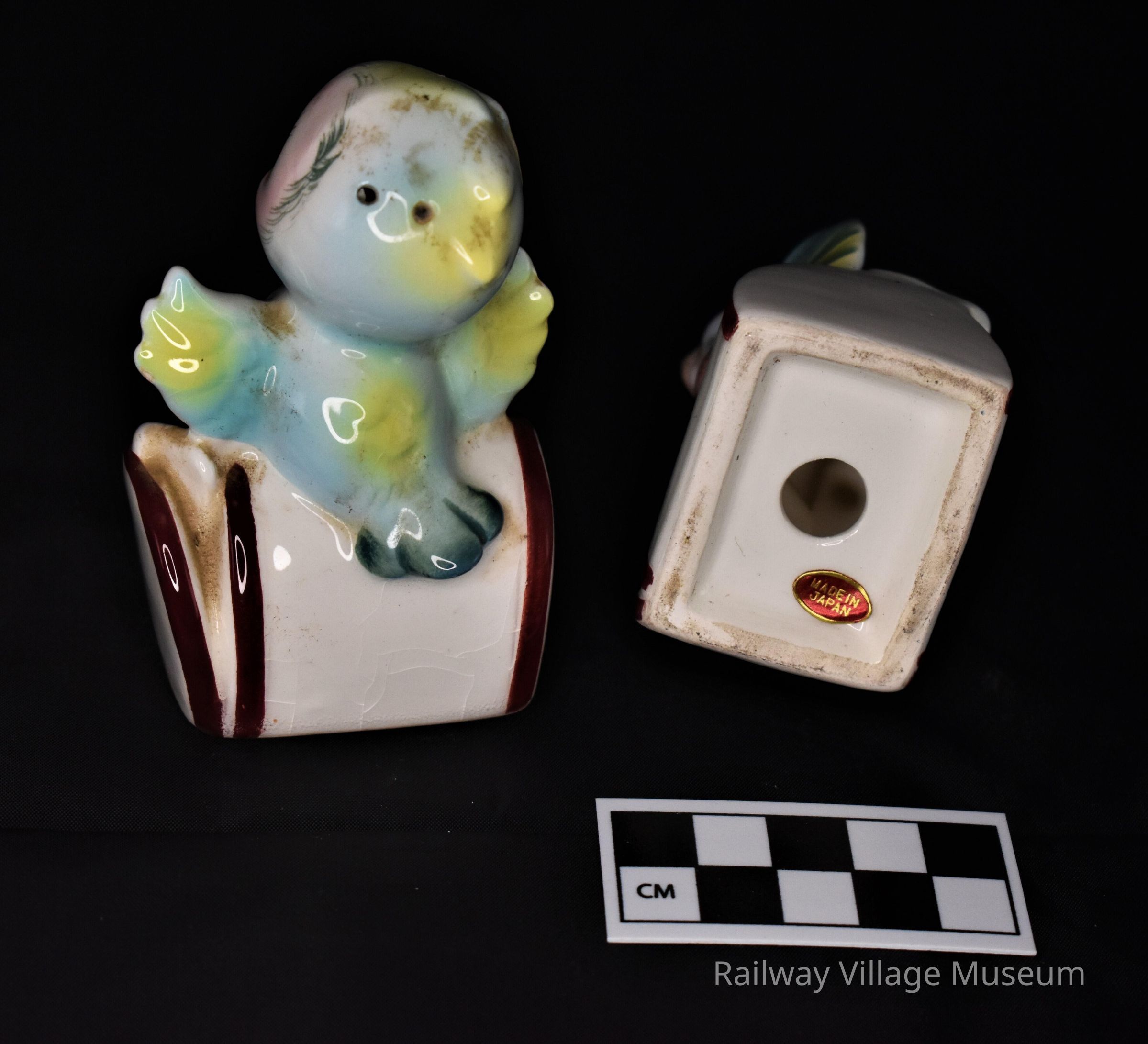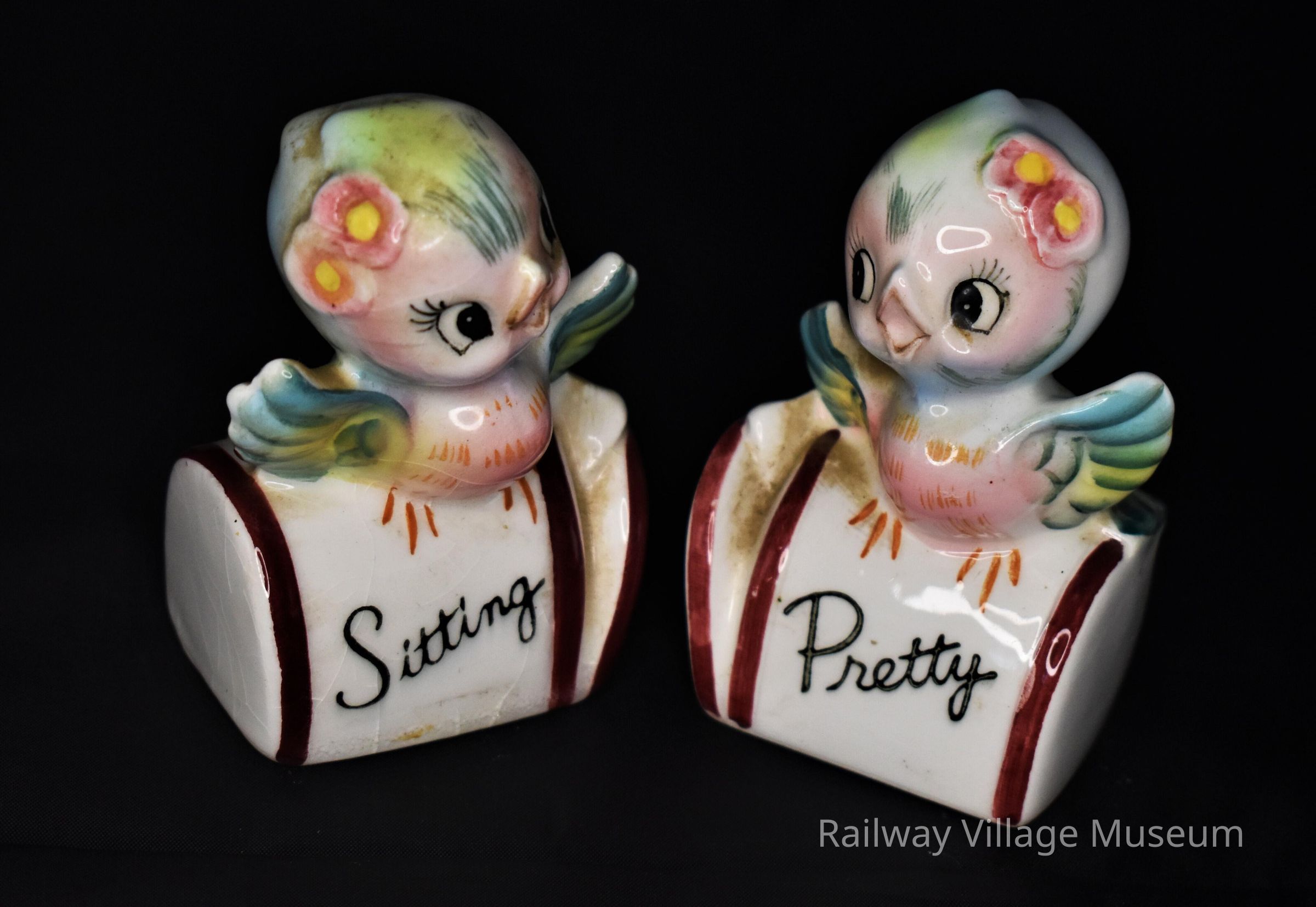 Ceramic shakers with matching colorful birds sitting on top of mailboxes. One mailbox says "Sitting" and the other "Pretty". Only the "Sitting" shaker has its rubber stopper in place. Both shakers have a sticker saying "Made in Japan".