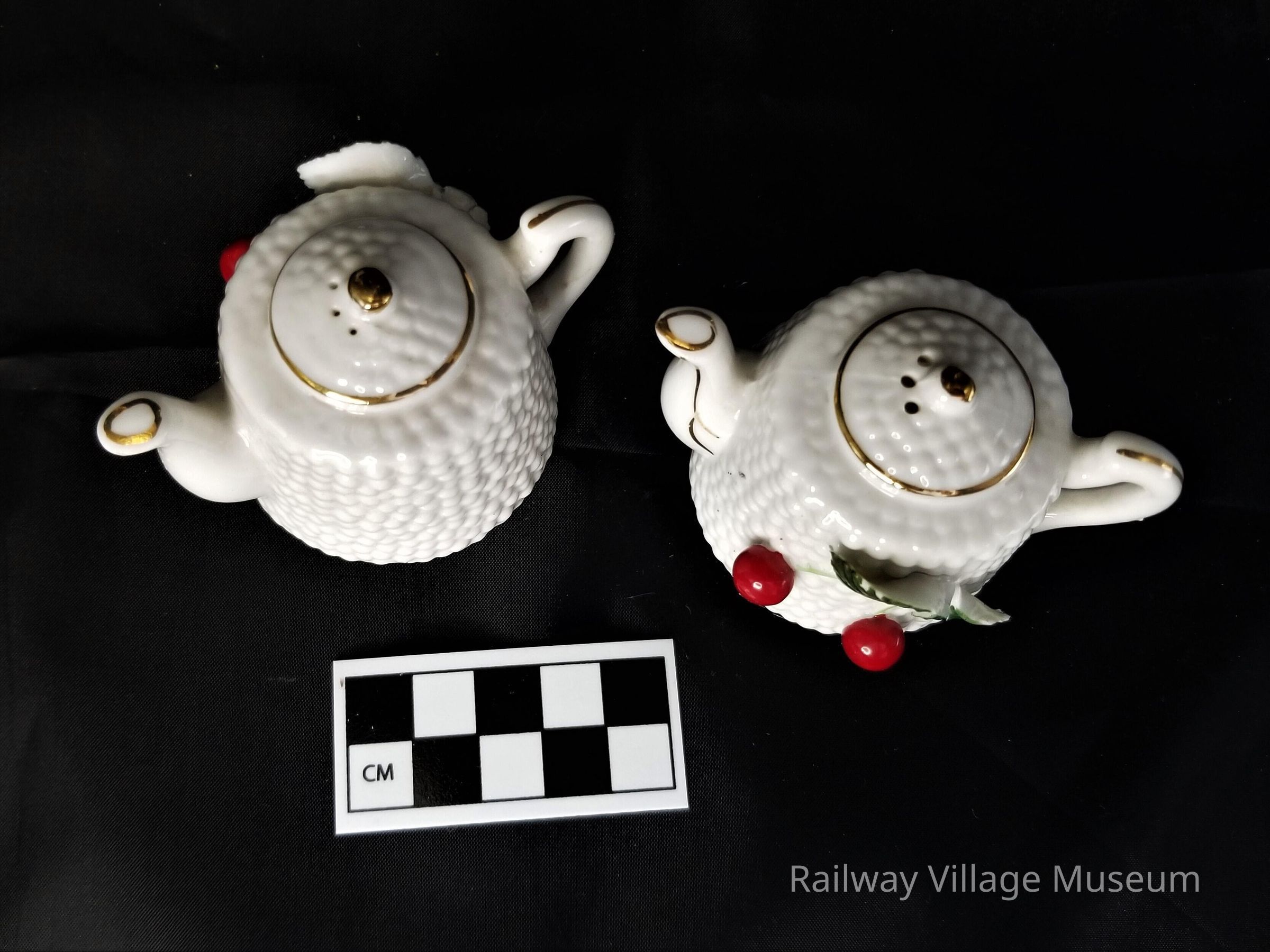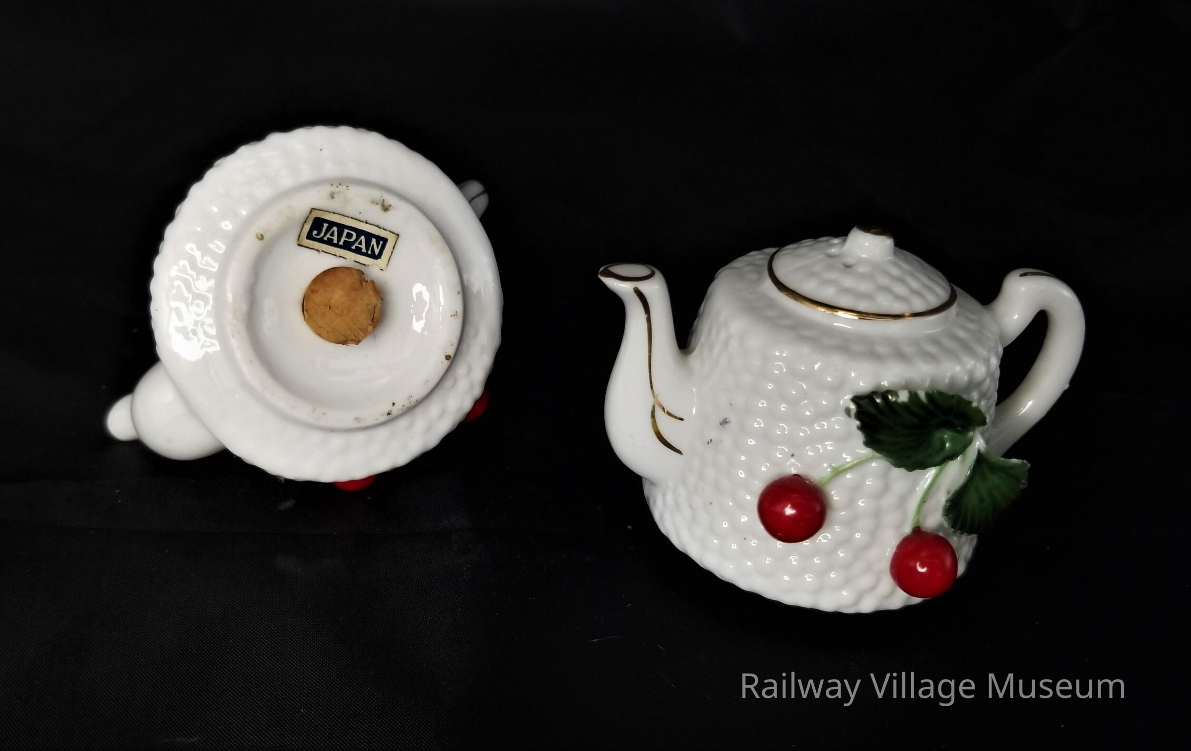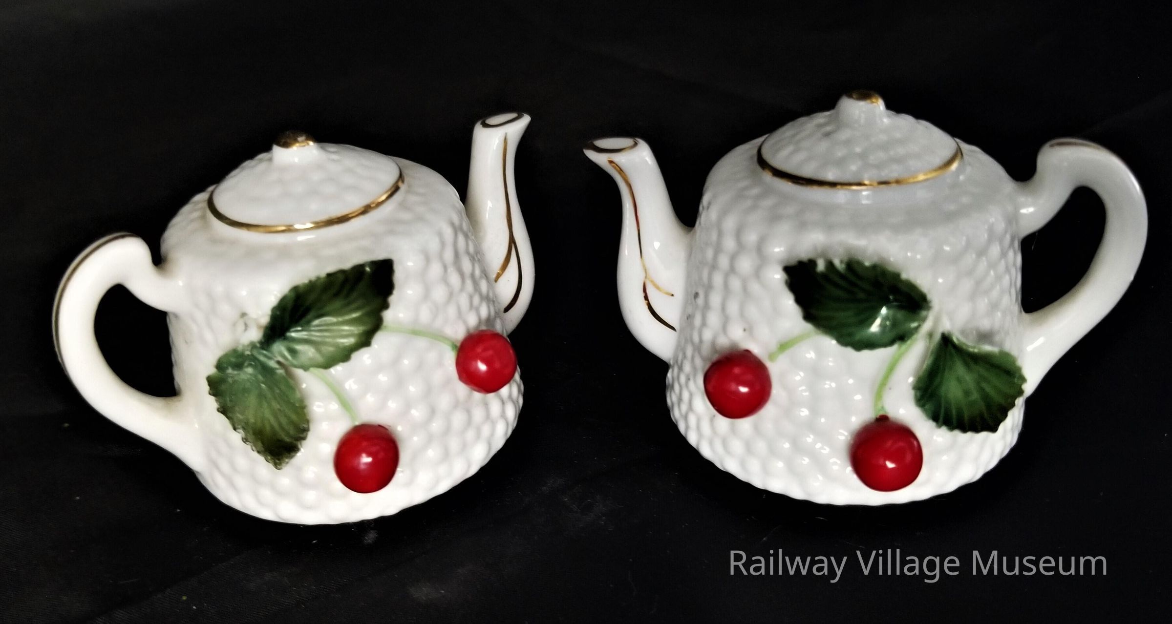 Mid-century porcelain teapot salt and peppershakers with cherry designs. Stickers on base stating, "Japan".