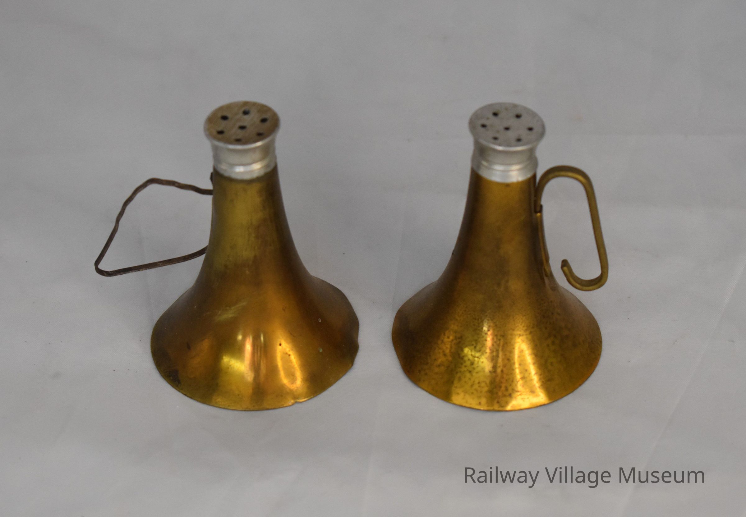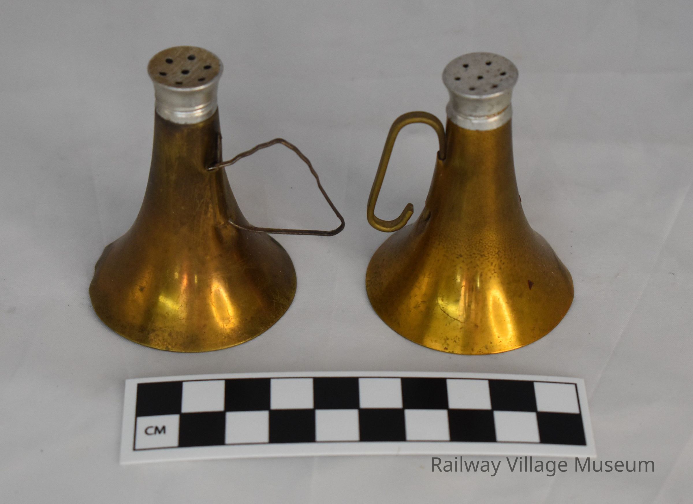 Brass instrument salt and pepper shakers: salt - 2023.1.216a, and pepper - 2023.1.216b.