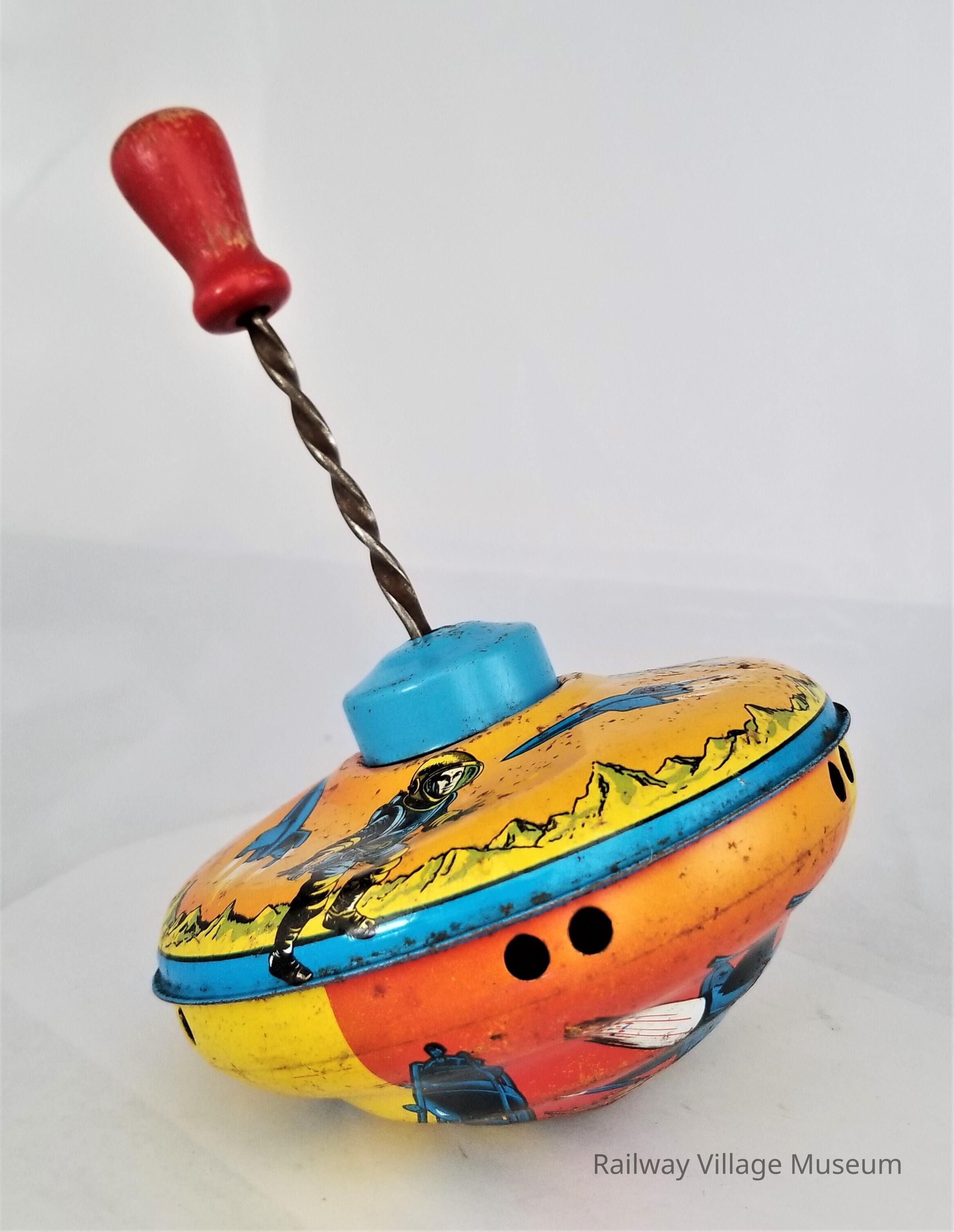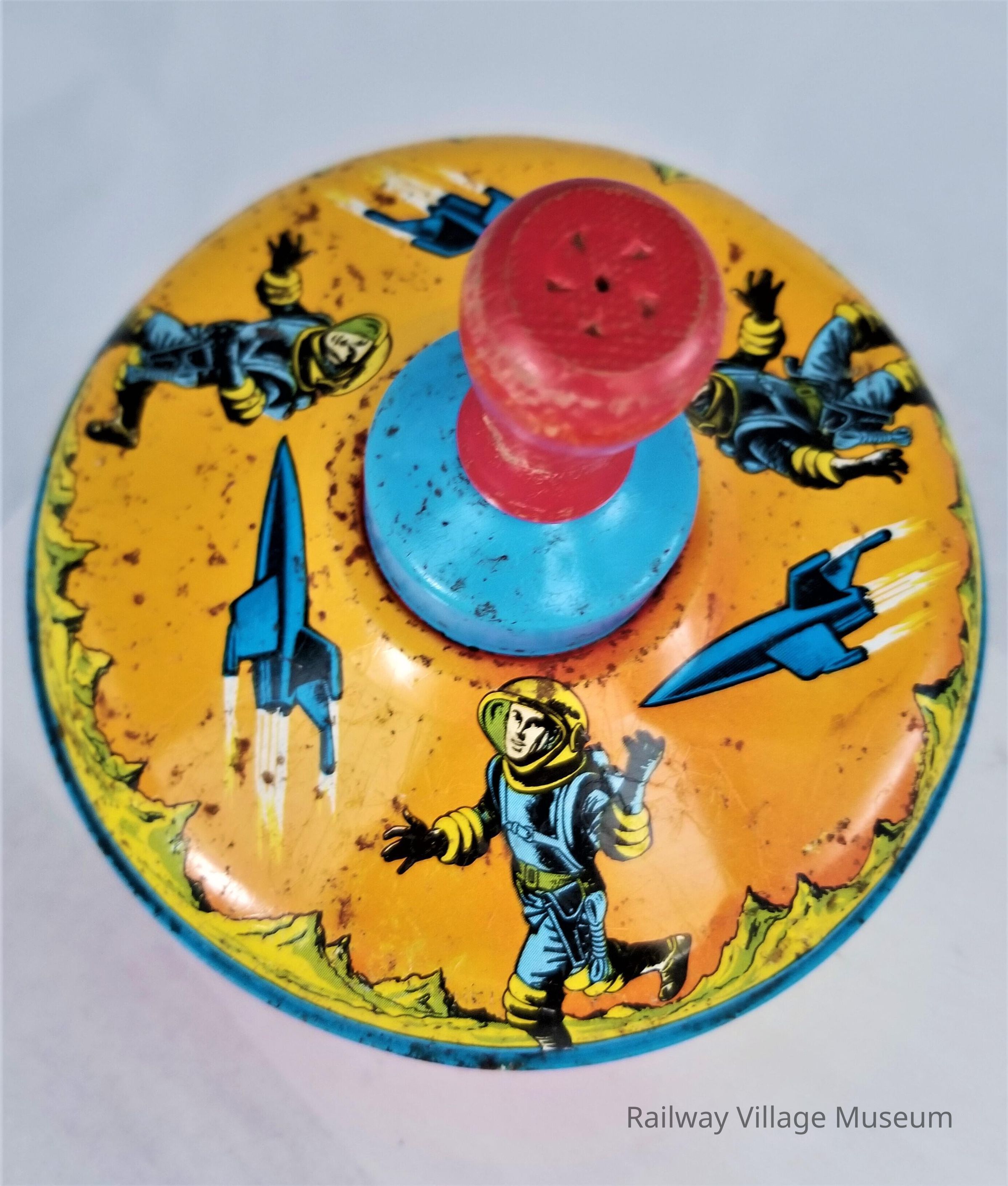 This tin lithograph peg-top features images of rocket ships, astronauts, and satellites. Pulling the peg up and quickly pushing it back down makes to top spin.