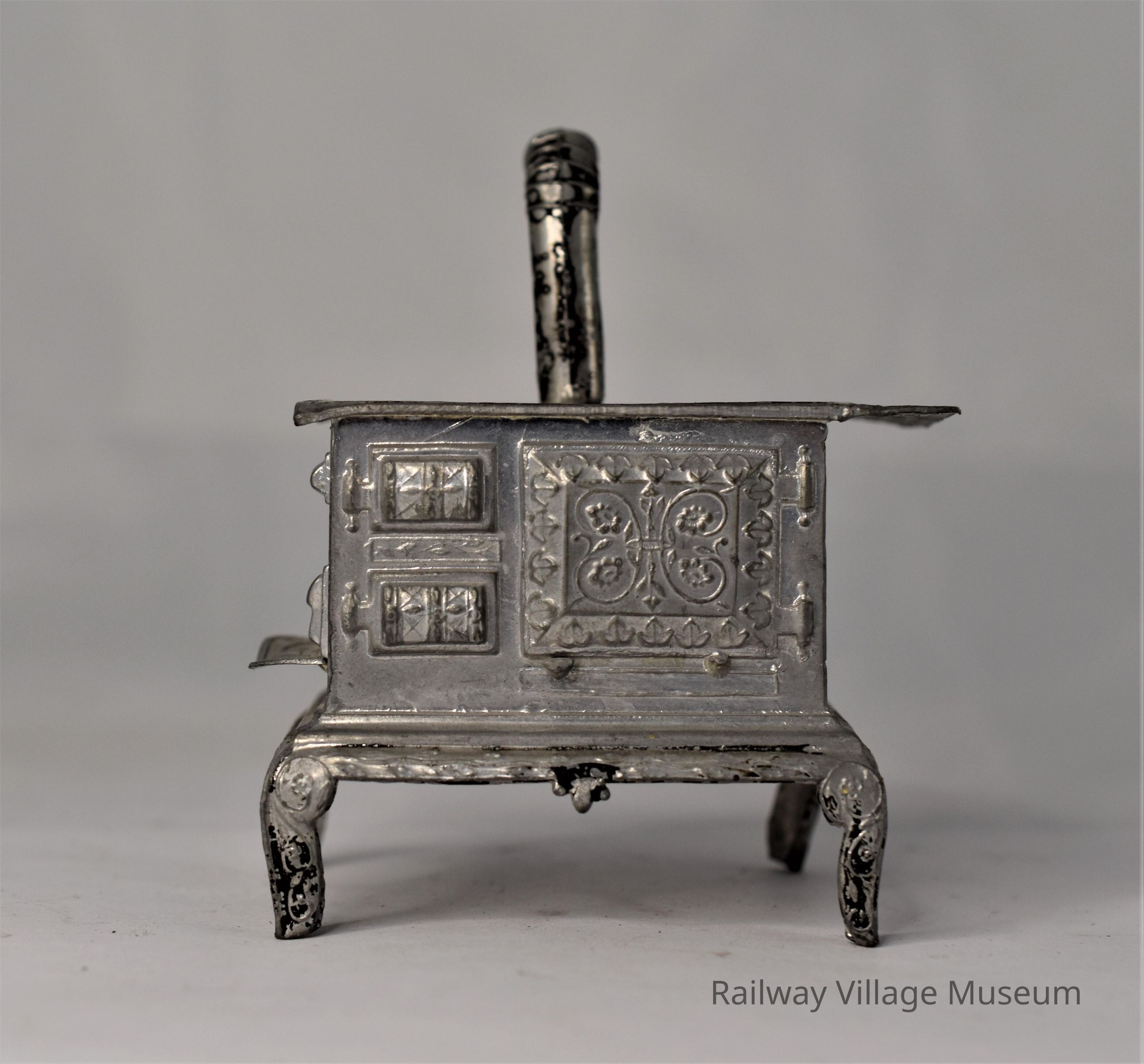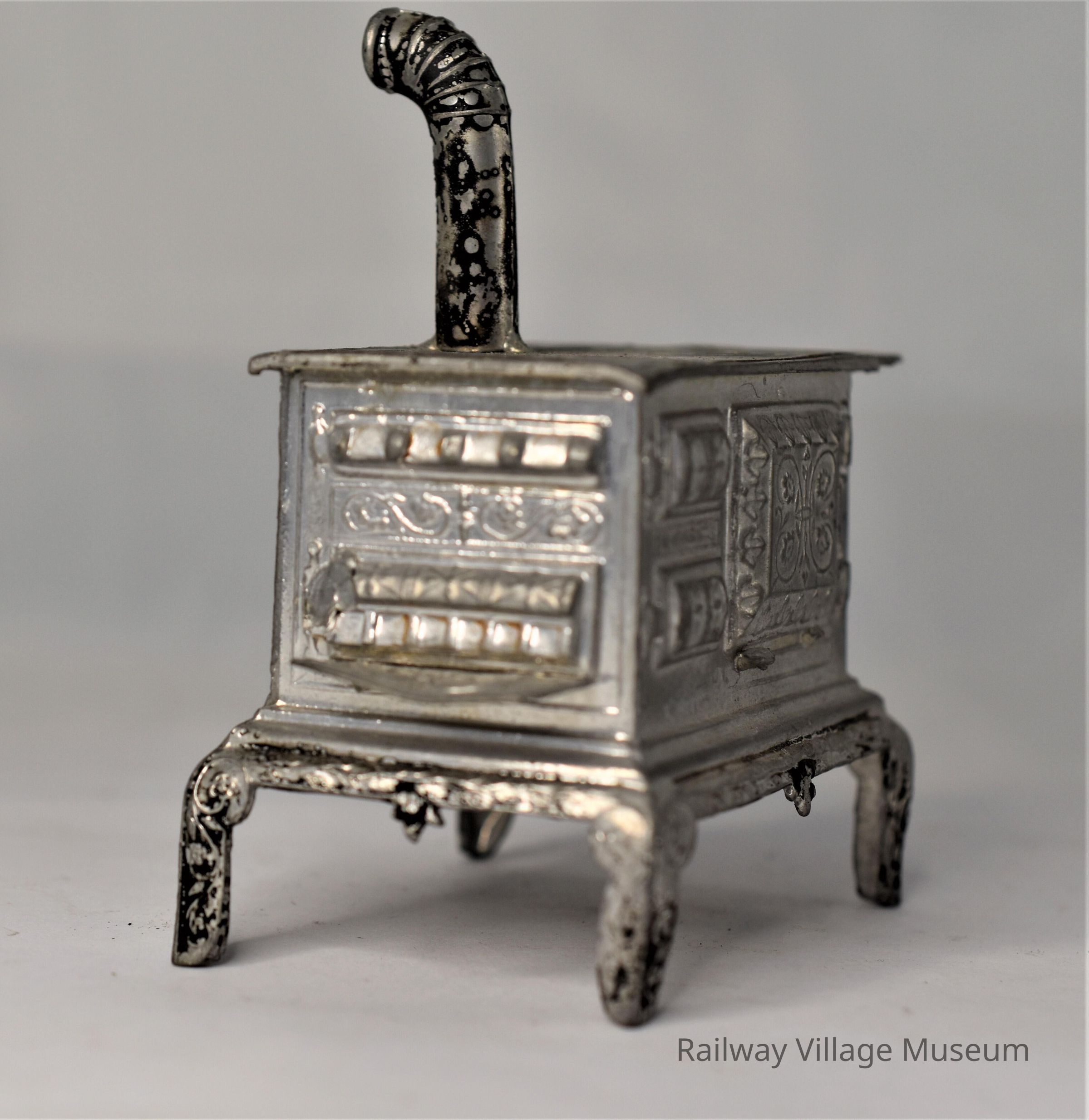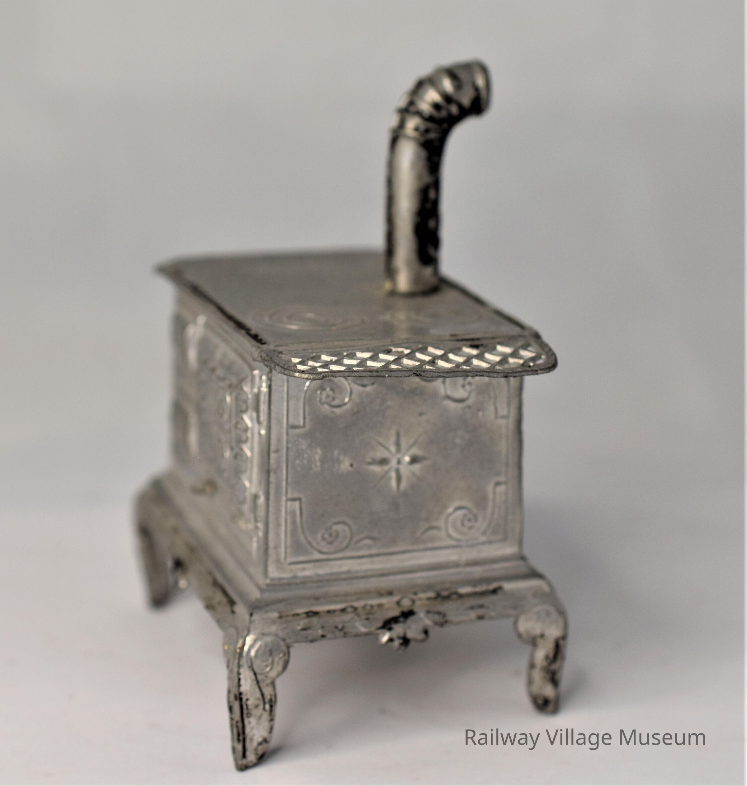 A tin stove, made by an unknown maker. It is hollow, with no bottom. It has four stove tops.