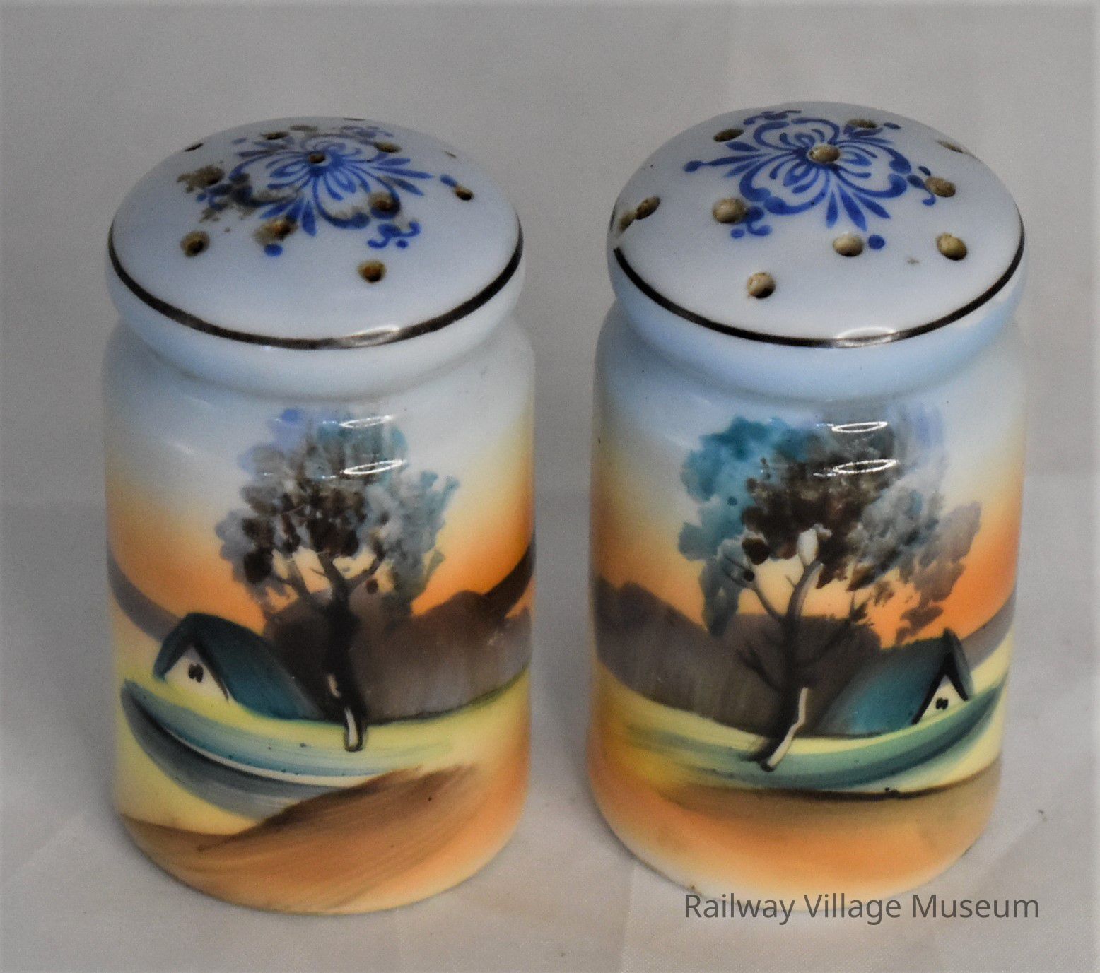 Noritake porcelain salt and pepper shakers with hand painted cottage landscape scene and marked "Made in Japan" on the bottom of each.