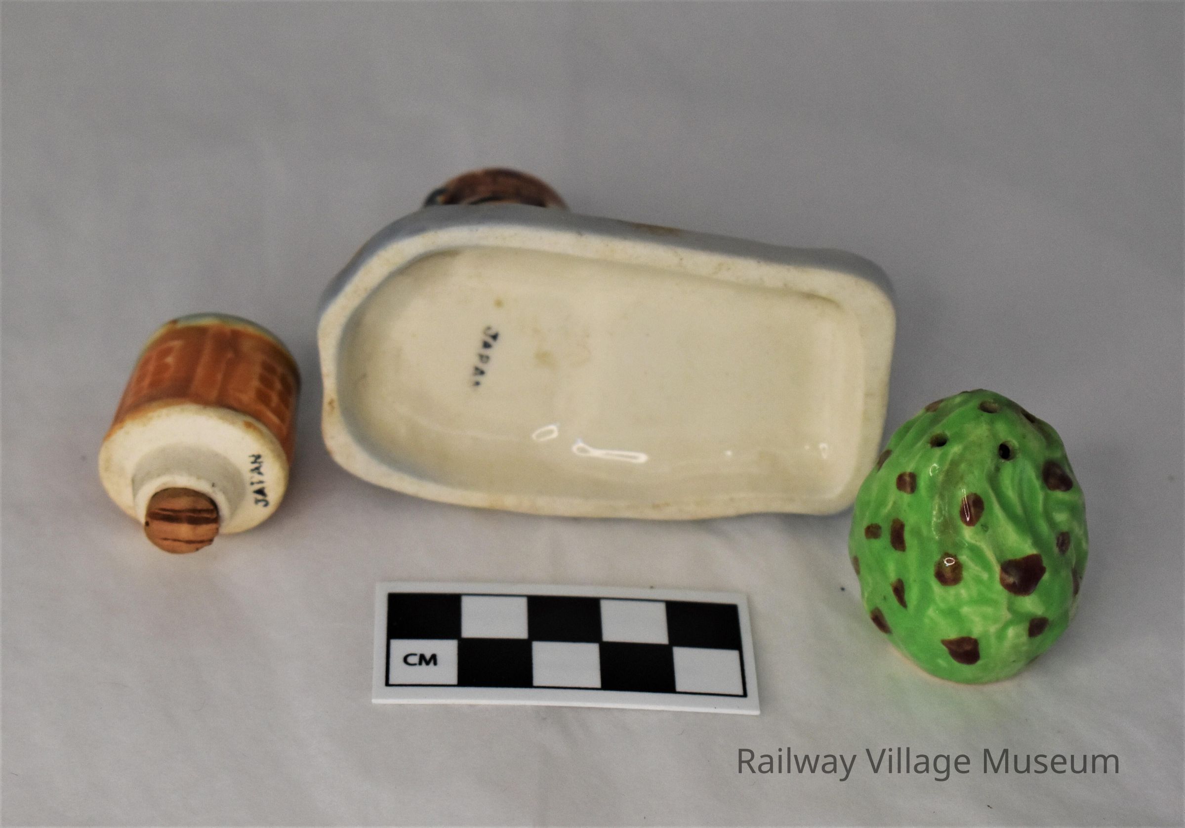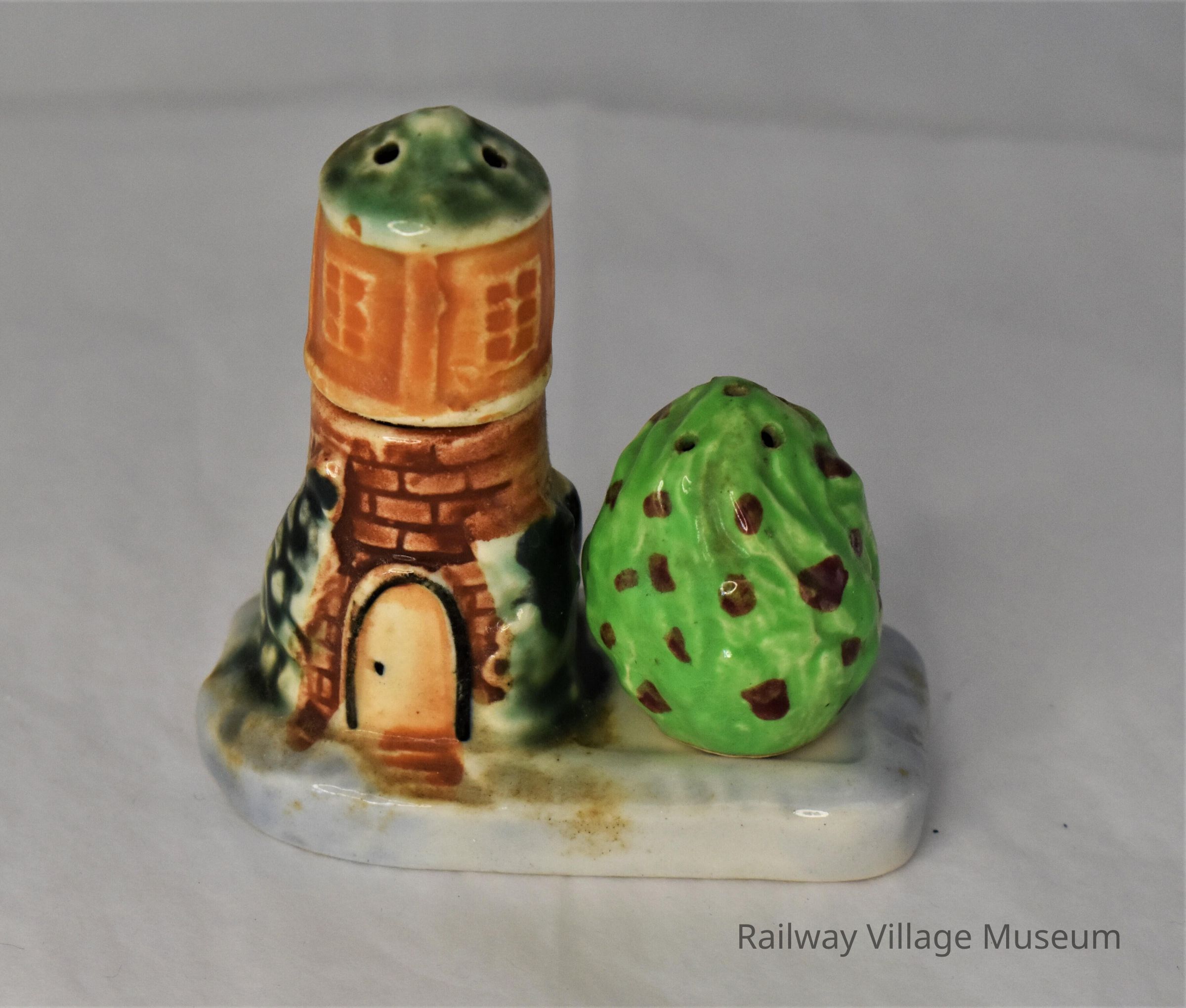This three-piece lighthouse set includes the base as the bottom half of the lighthouse and rocky coast next to it, a saltshaker in the form of the top of the lighthouse, and a pepper shaker in the form of a flowering bush. The small set was made in Japan and is marked as such on the bottom of the base and lighthouse shaker. Both shakers have their cork stoppers intact.Lexicon