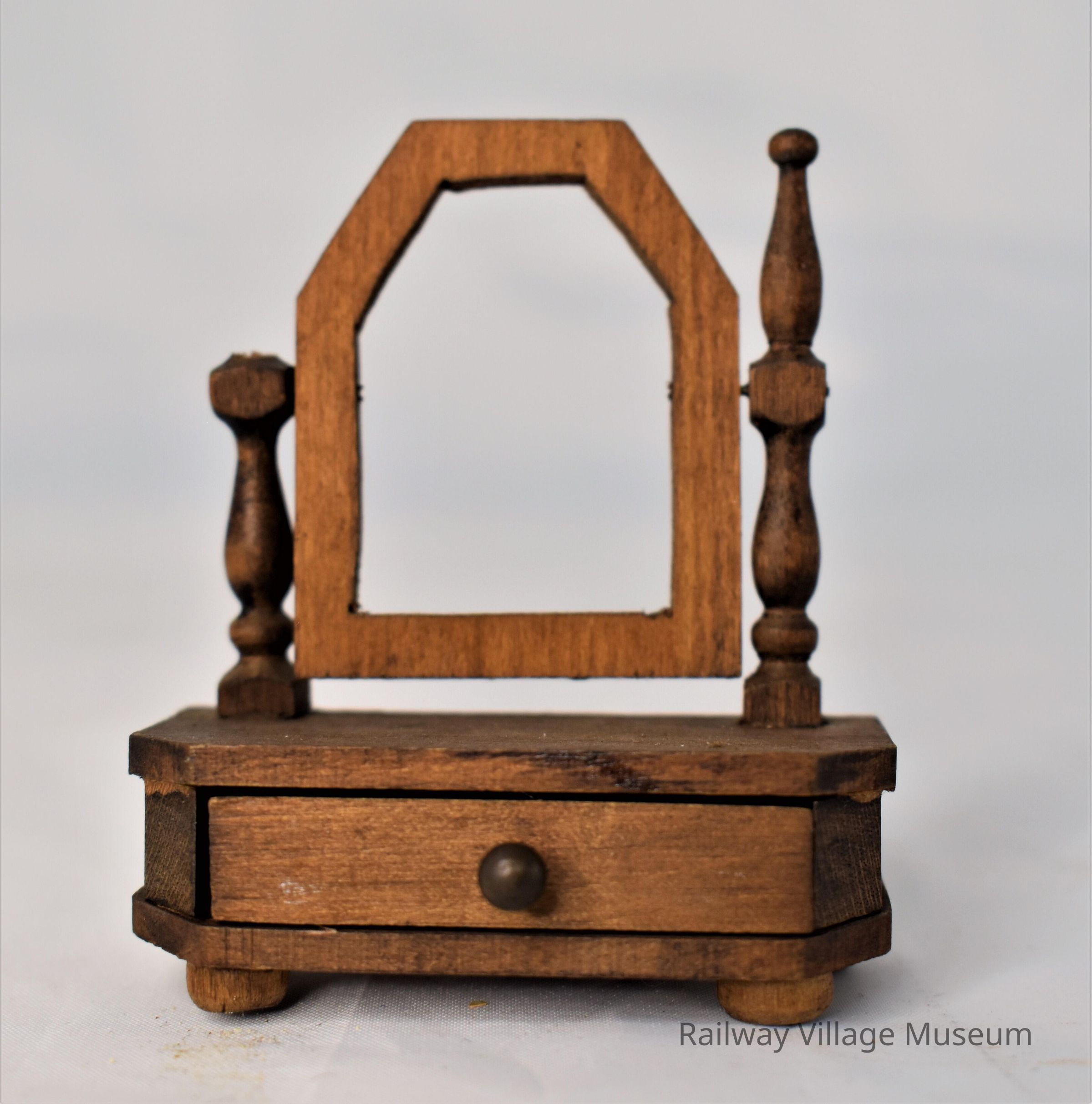 A wooden dollhouse vanity. There is no mirror attached to this piece, and one of the spindles has broken off. The drawer comes out easily.