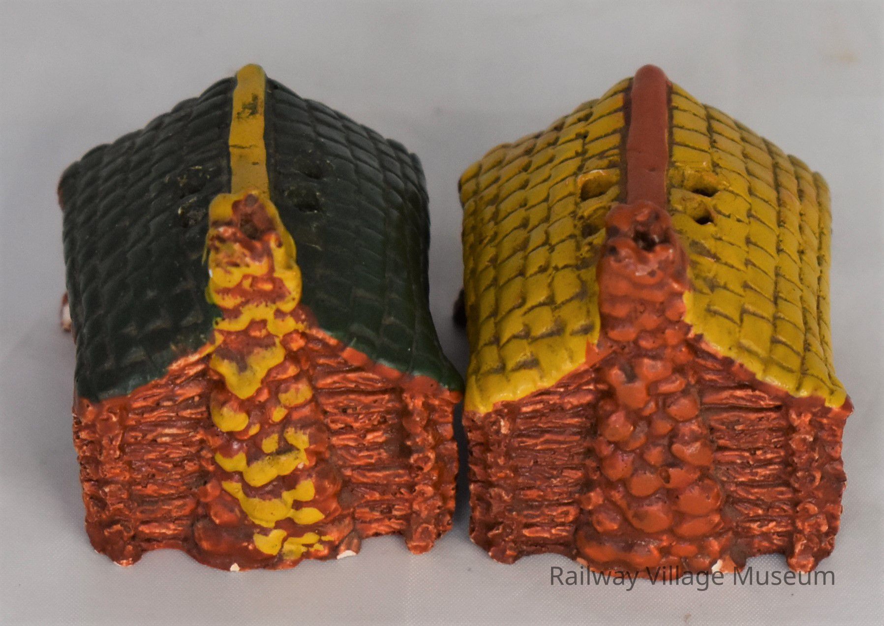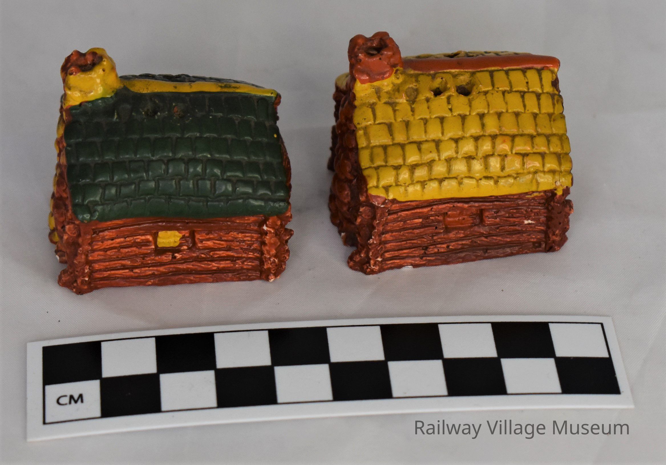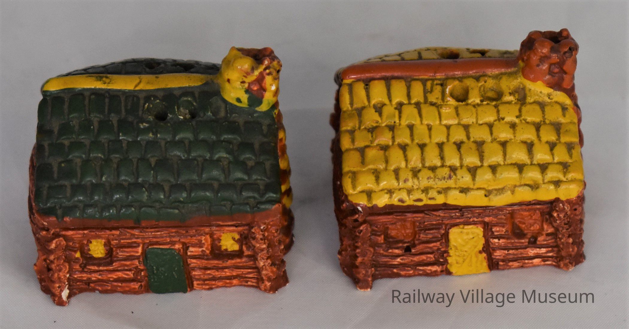 Vintage chalkware log cabin salt and pepper shakers with green and yellow roofs.