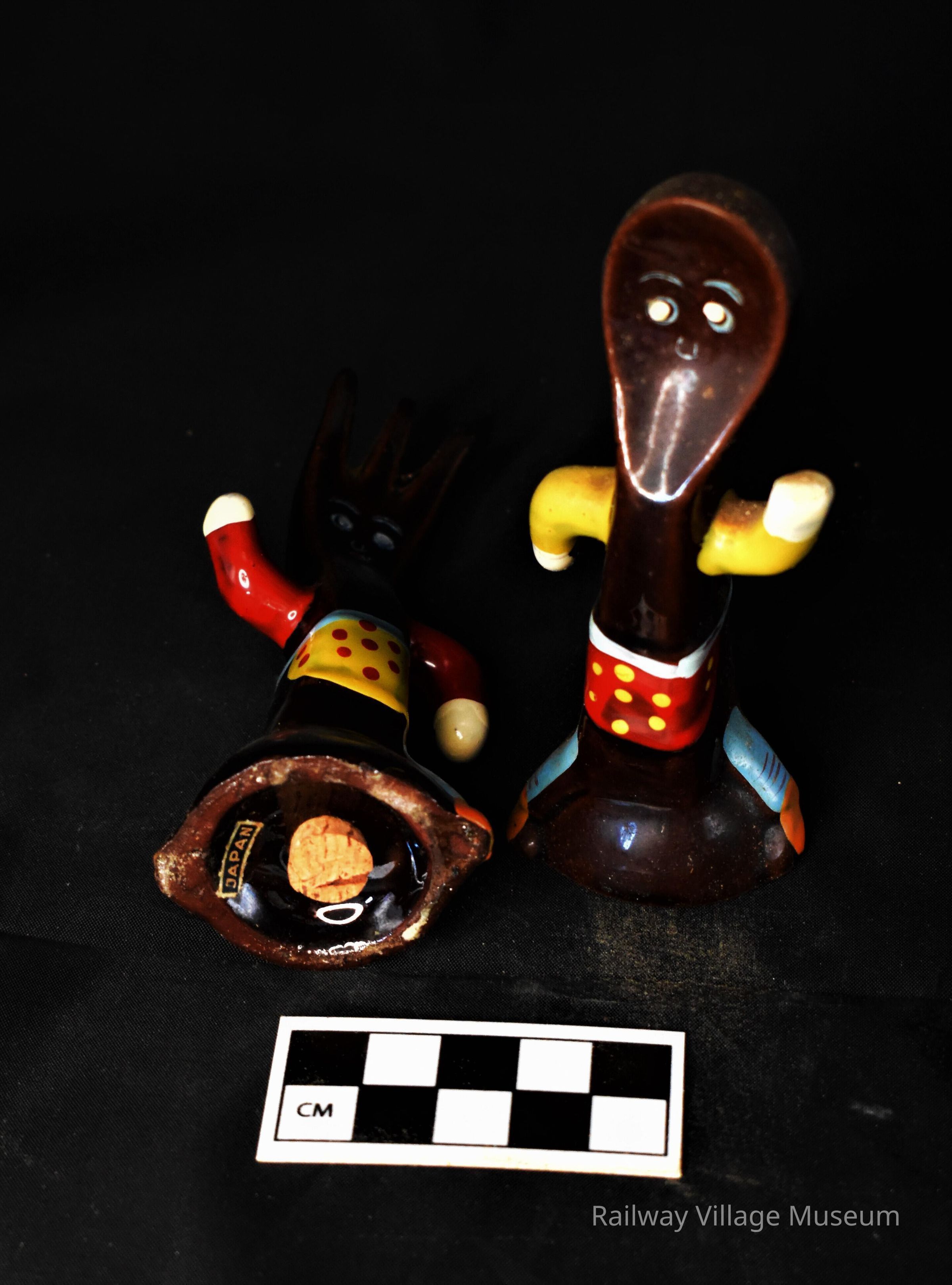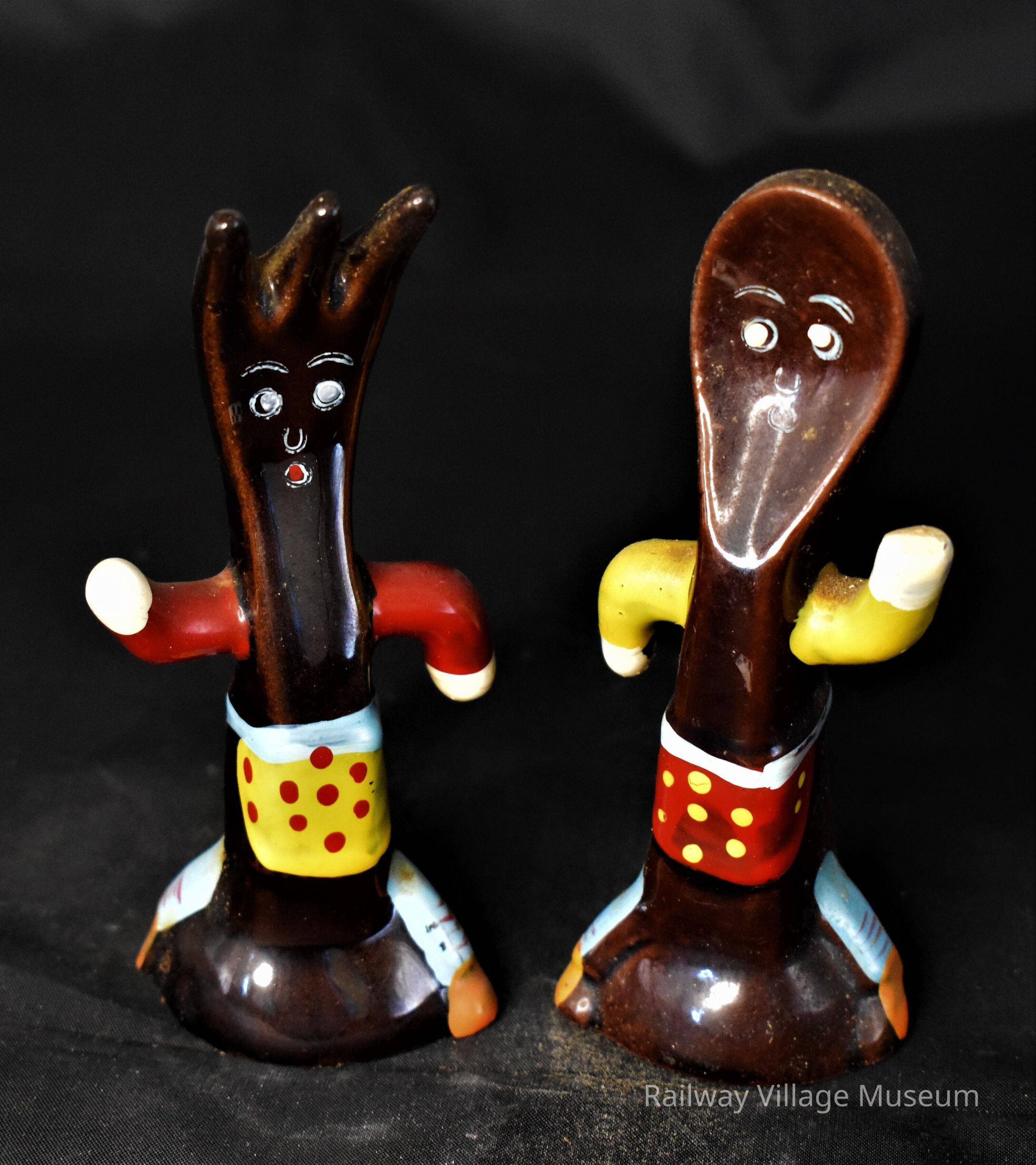 These ceramic salt and pepper shakers are in the form of apron wearing fork and spoon. Multiple colors and styles of this pairing exist. Sometimes they are referenced as part of the "Hey diddle diddle" nursery rhyme which ends with the lyric "and the dish ran away with the spoon". Stickers on bases say, "Japan". Cork stoppers intact.