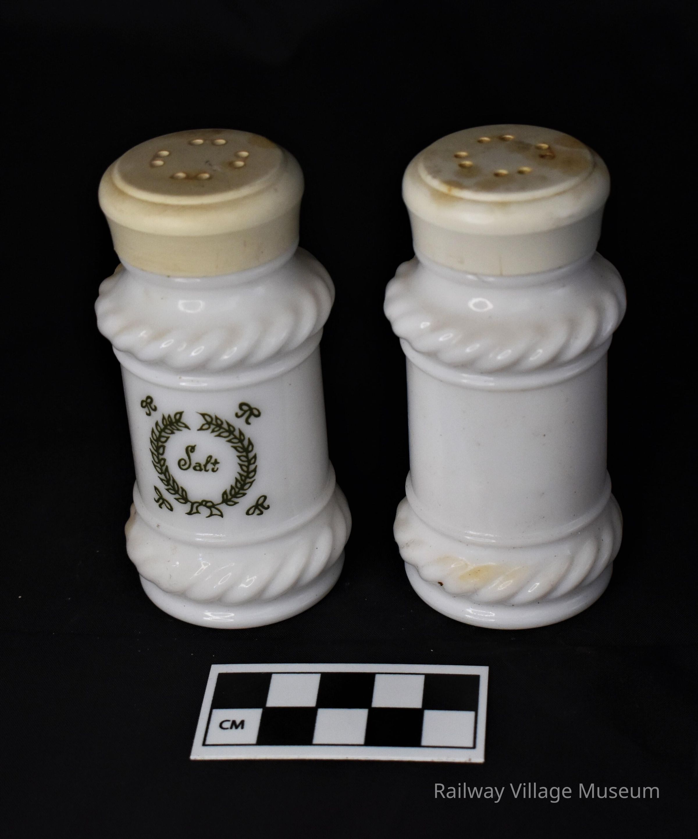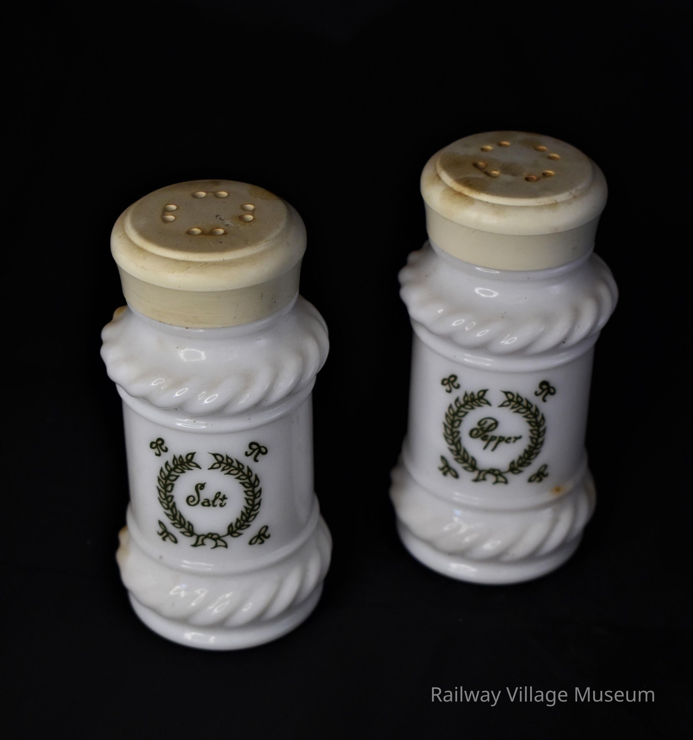 These milk glass shakers have plastic tops and have matching bow and wreath designs on the front. They are unmarked and manufacturer is unknown. Milk glass, or opal glass, was first made in the 16th century. The milky color is the result of adding different chemicals into the glass-making process that creates the opacity of milk glass. Some chemicals that can be used to do this are Titanium Dioxide, Zirconium Dioxide, and Cryolite.Lexicon