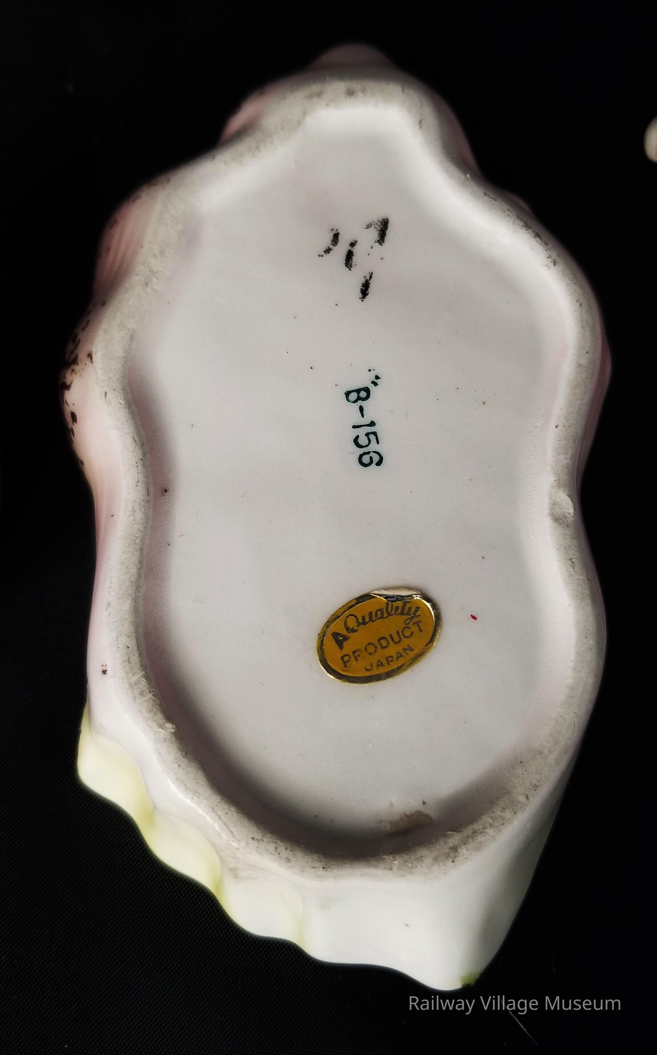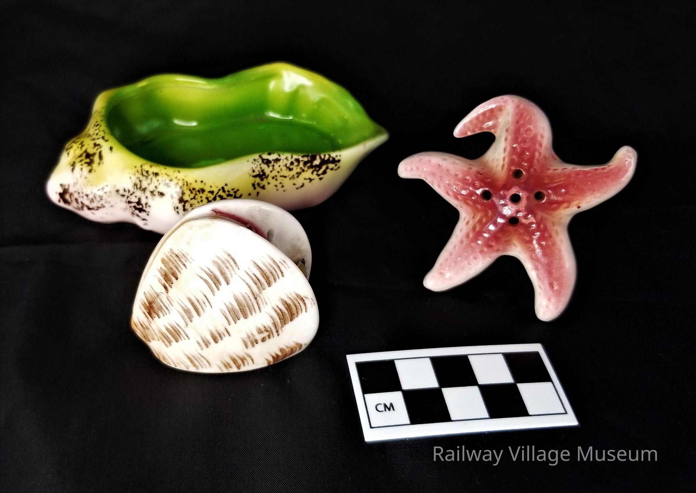 This colorful three-piece set includes a scallop shell shaker, starfish shaker, and seashell dish. The dish has an object number (B-156) and each piece has a sticker stating, "A Quality Project Japan". The dish also has a sticker stating, "Boothbay Harbor, Maine".Inscription/Signature/Marks