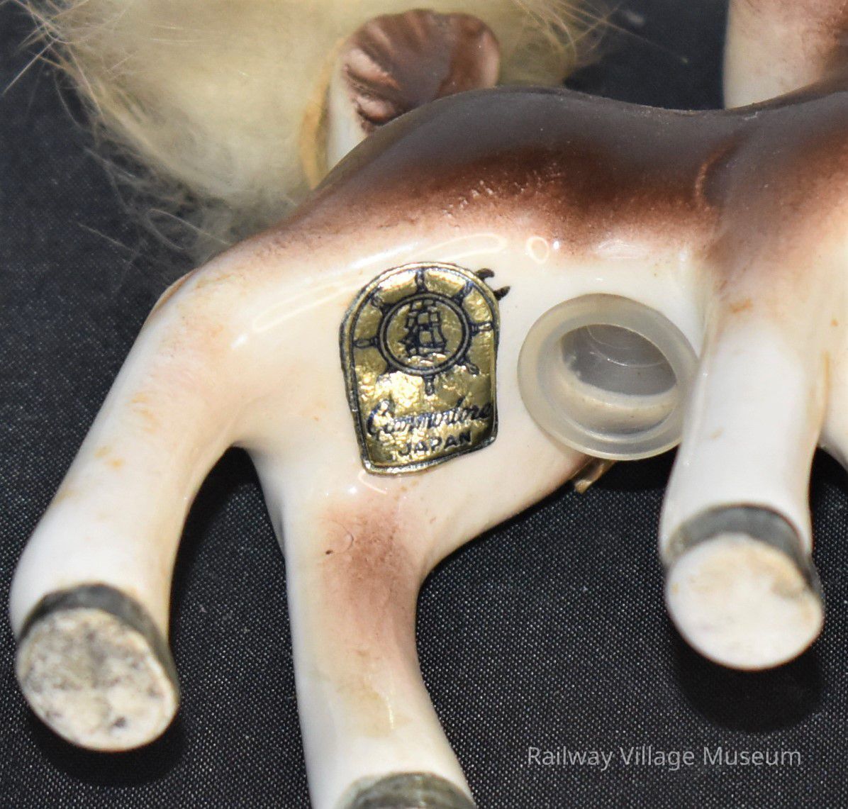 Vintage ceramic "Little Bambi" deer salt and pepper shakers with fur - one with antlers. Original "Commodore Japan" labels on the bottom of each shaker.