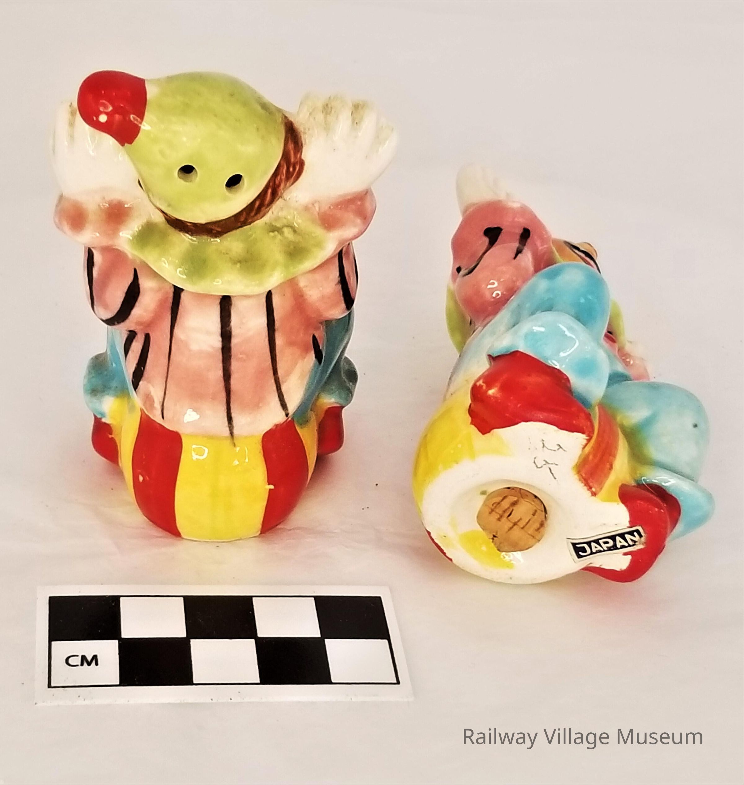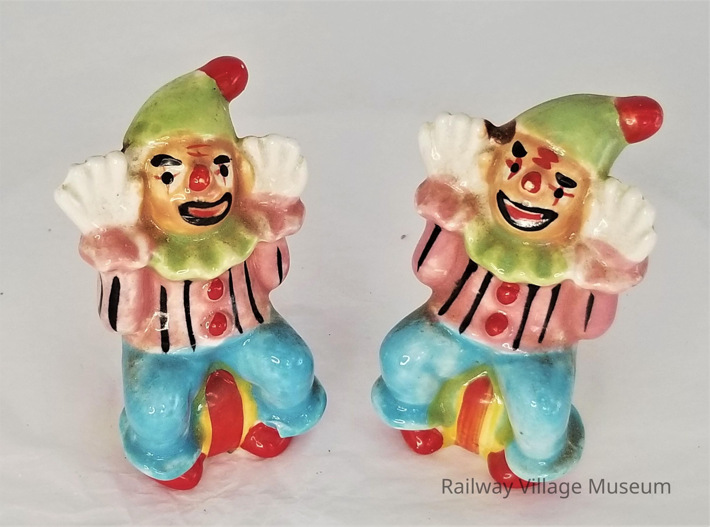 Hand-painted clown shakers. Though minor inconsistencies, the smiling characters sitting on striped balls basically match. Both cork stoppers intact. Made in Japan.