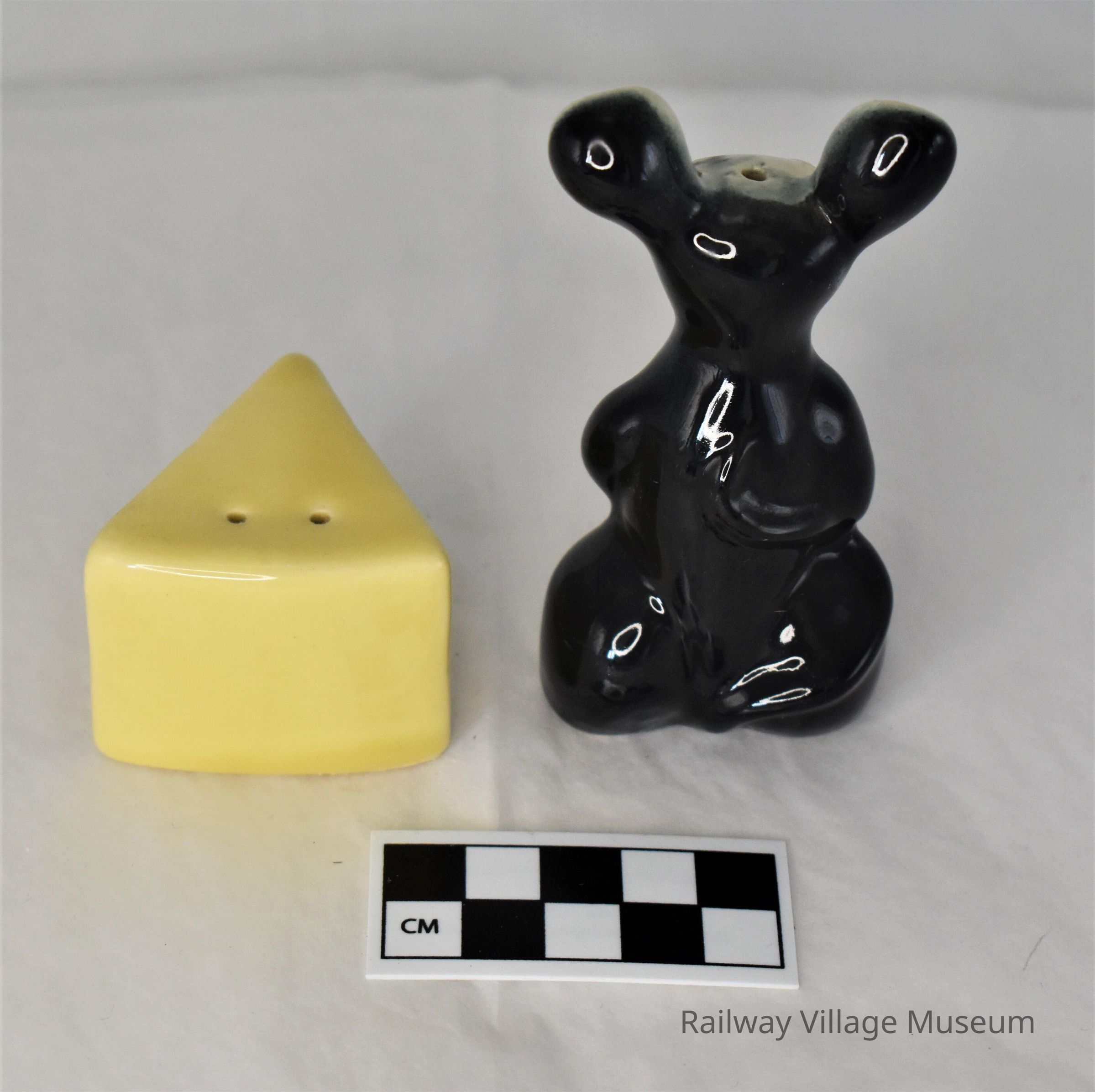 This ceramic salt and pepper set consists of a muse and his cheese wedge. They are unmarked and neither has a stopper in place.