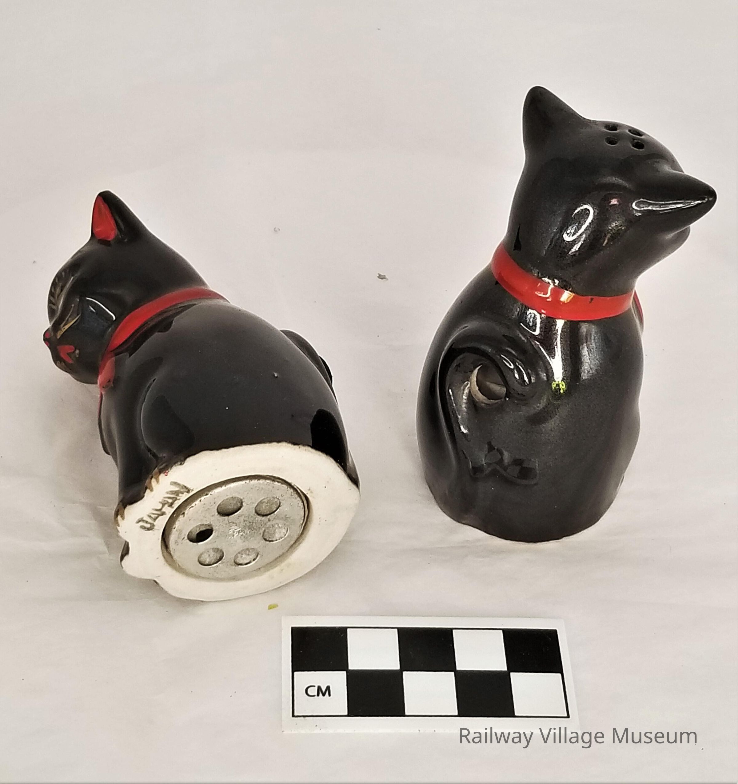 A pair of matching hand-painted black cat shakers. Made in Japan. One still has cork in place and they both have a metal mechanism in the base. Likely made by the Shafford Pottery company or created to resemble their "black cat" line of pottery items.