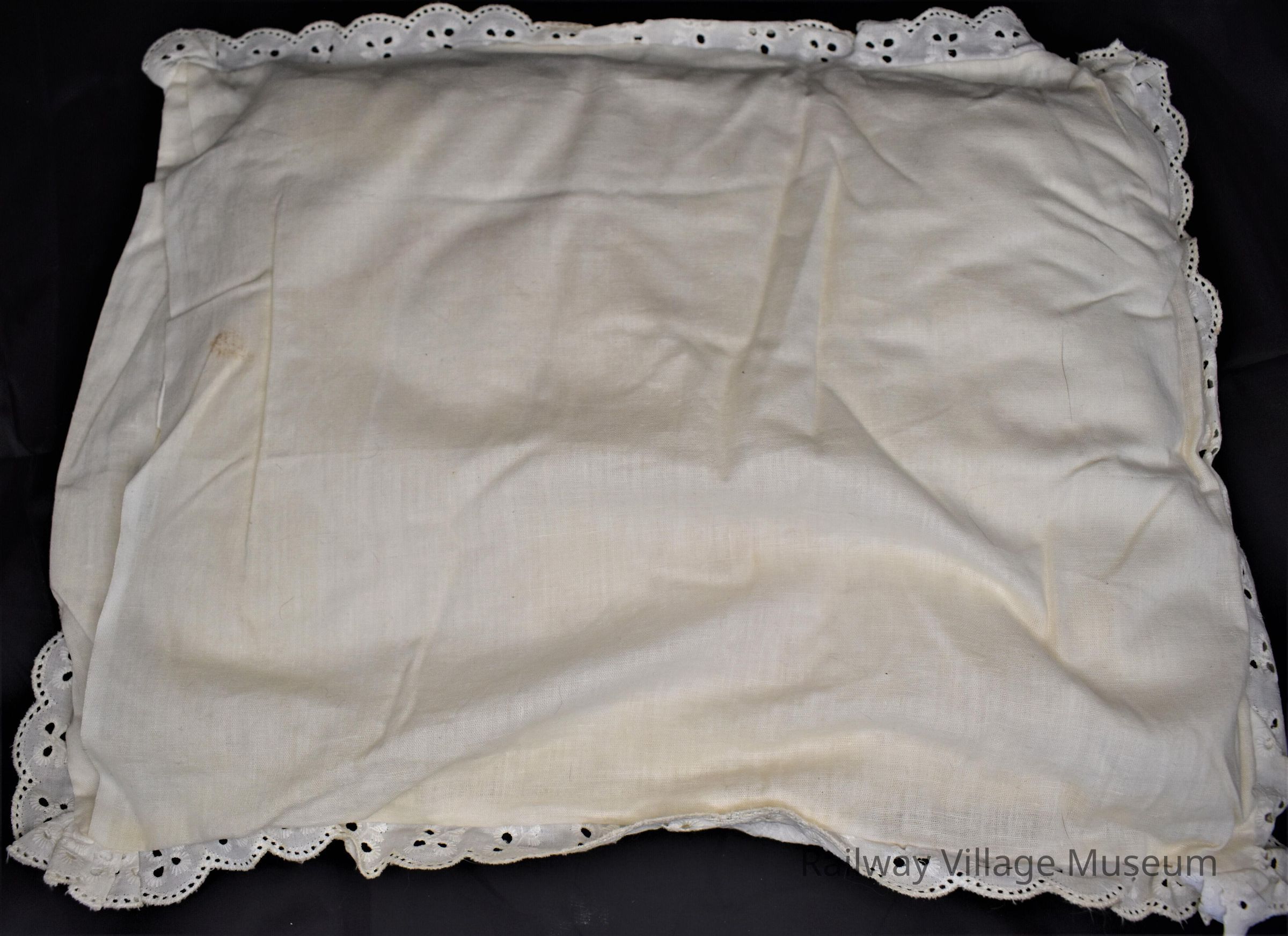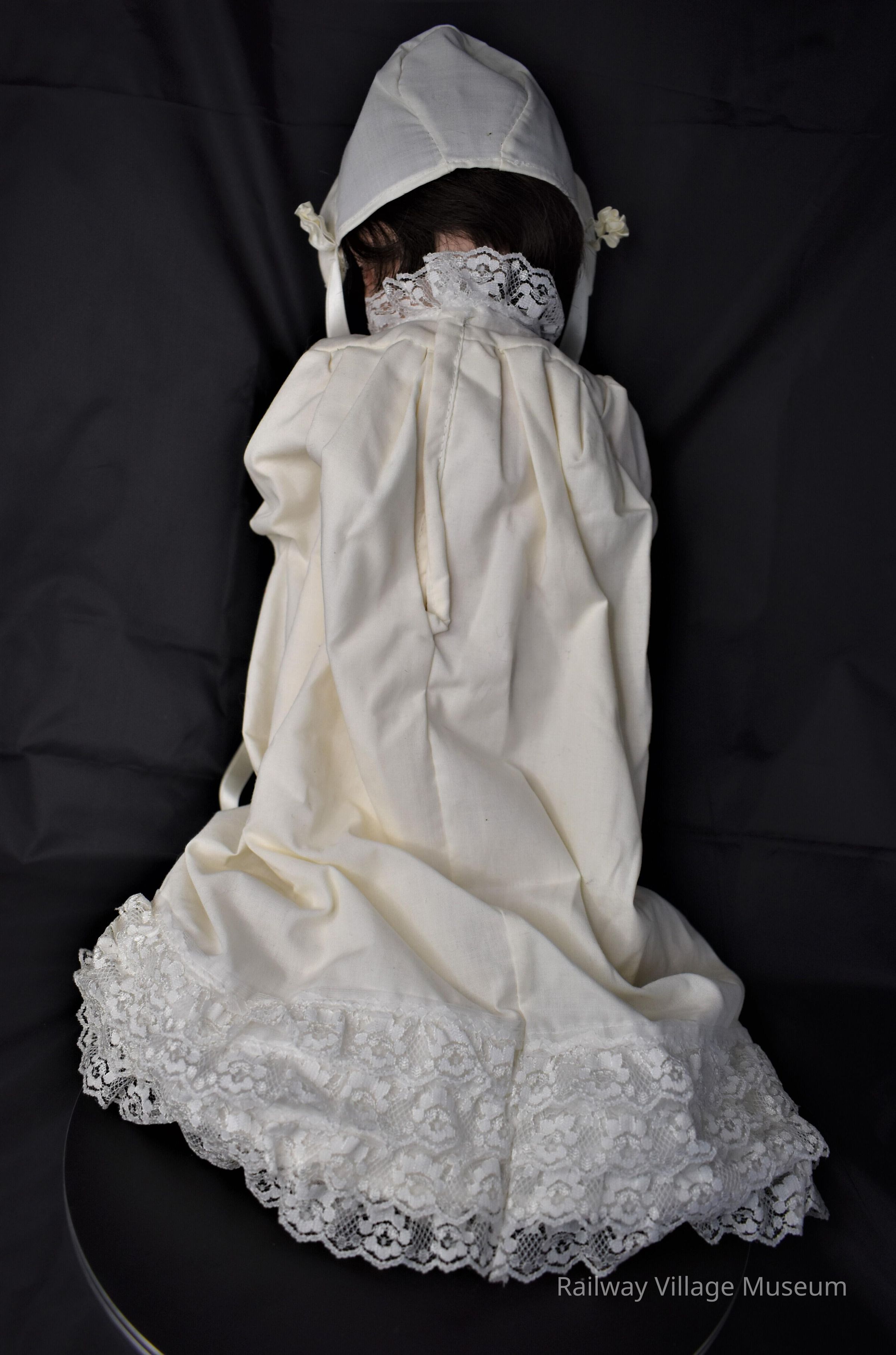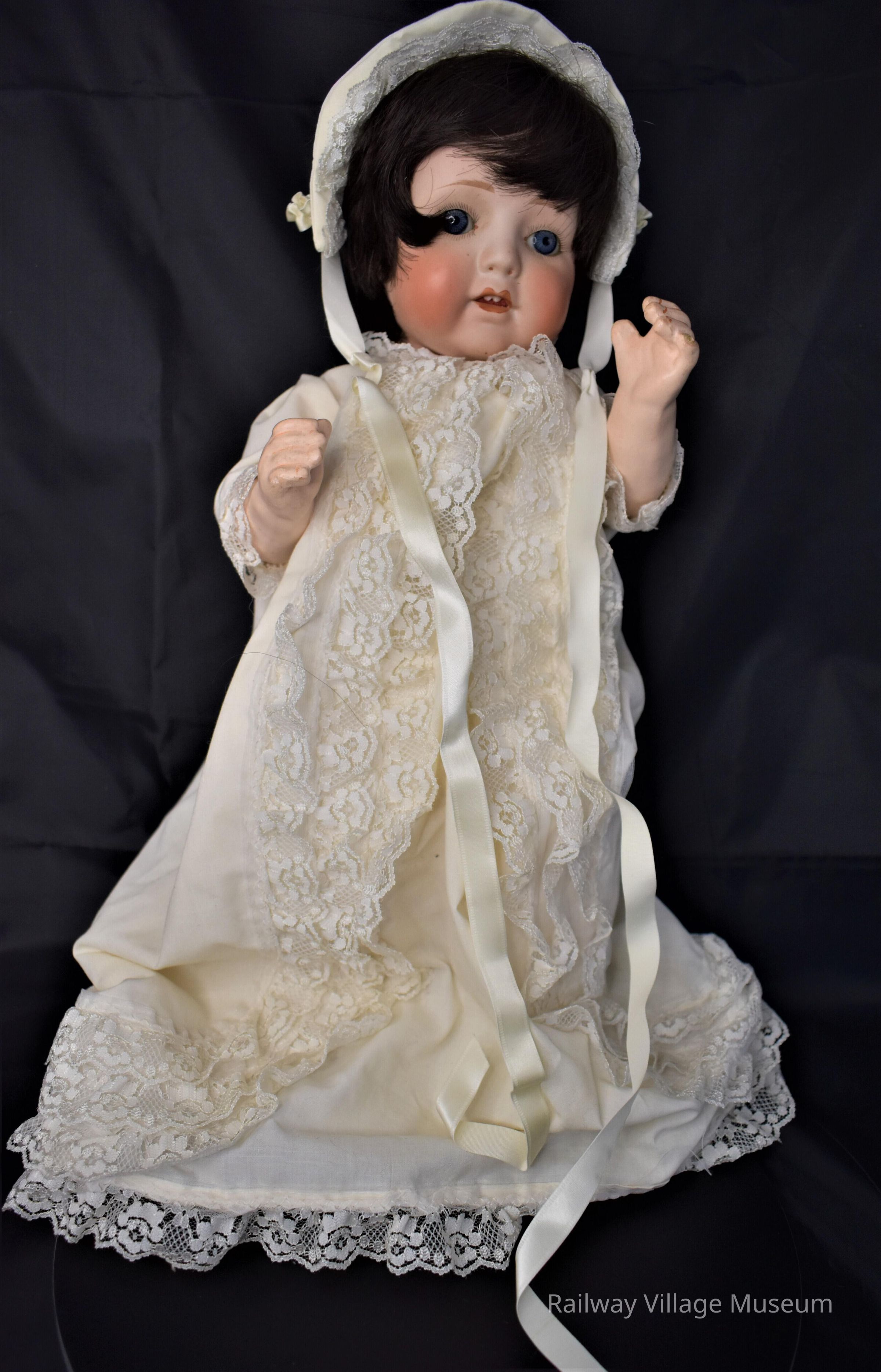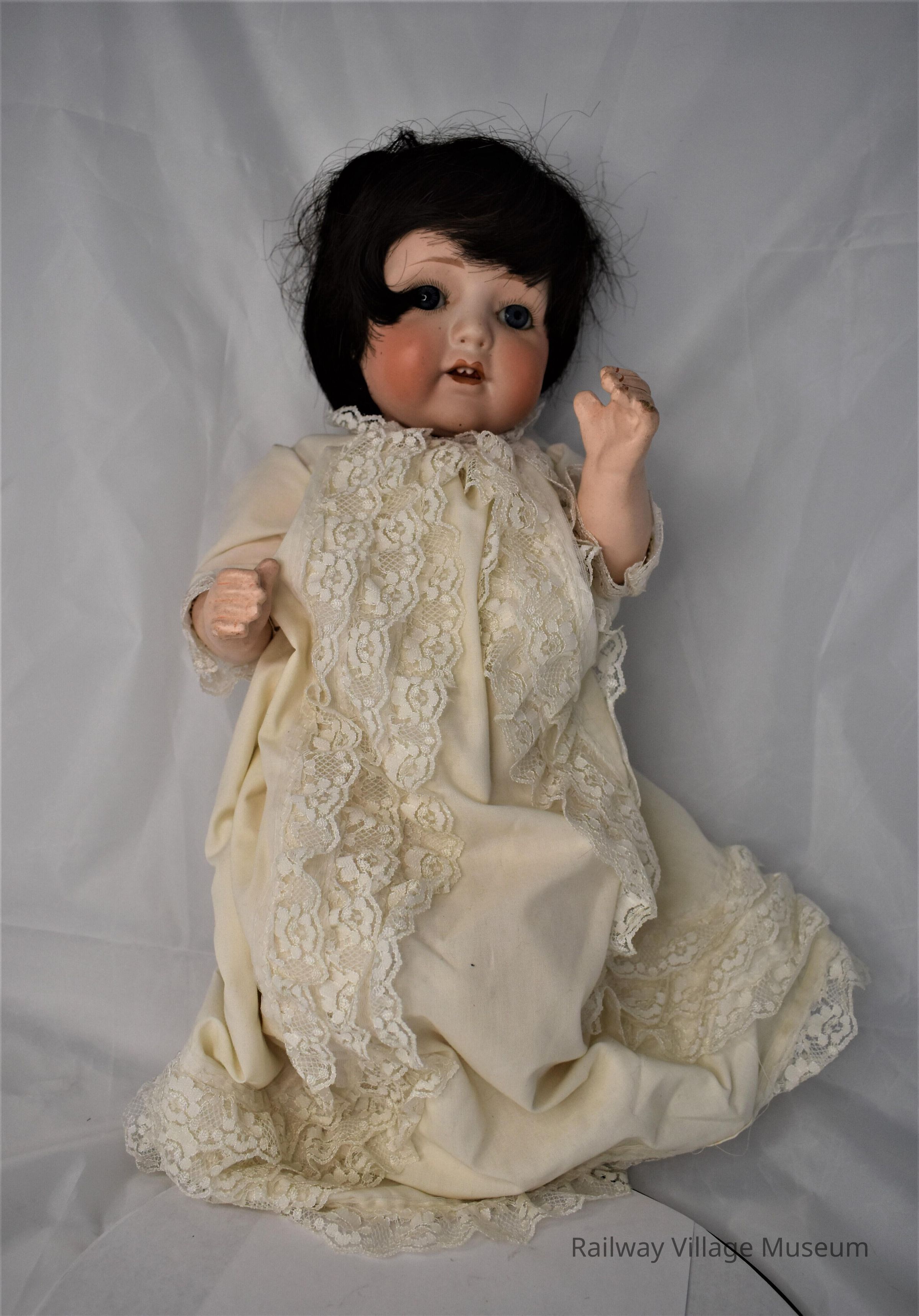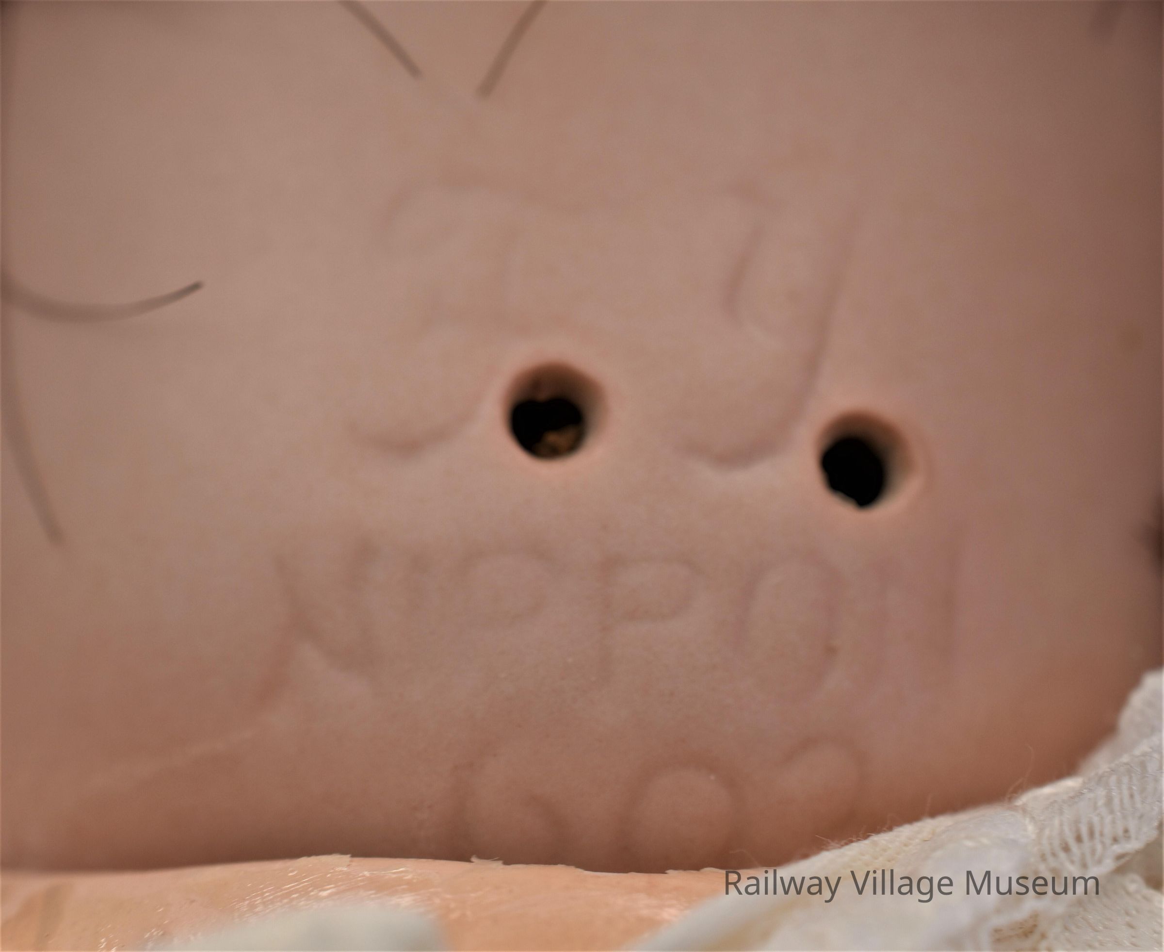 This doll was made in Japan, during World War I. She is a bisque (unglazed porcelain) doll, and she was made by the Yamato Importing Company. She is in good condition, although her hair and clothes are not original. She comes with a bonnet and a pillow, which is also not original.Acquisition