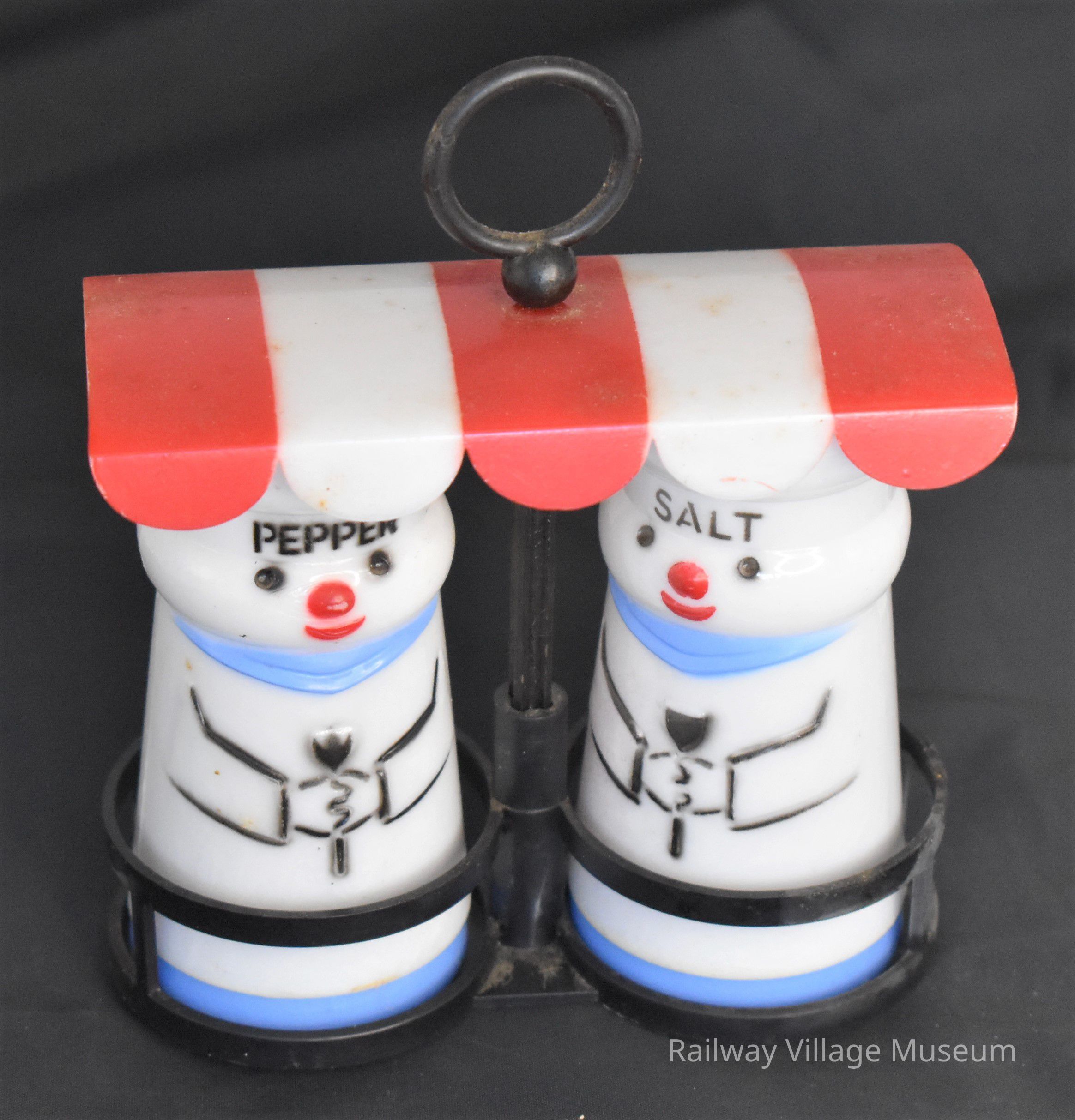 Vintage plastic chefs in red and white striped awning holder salt and pepper shakers set. Made in Hong Kong.