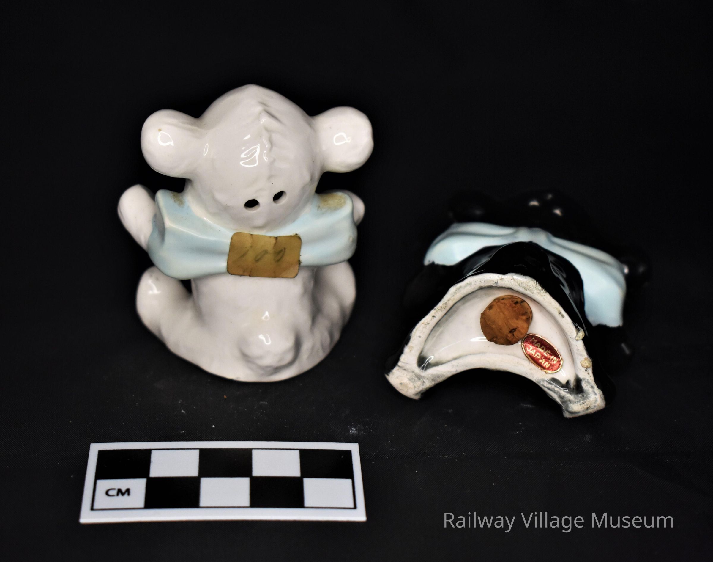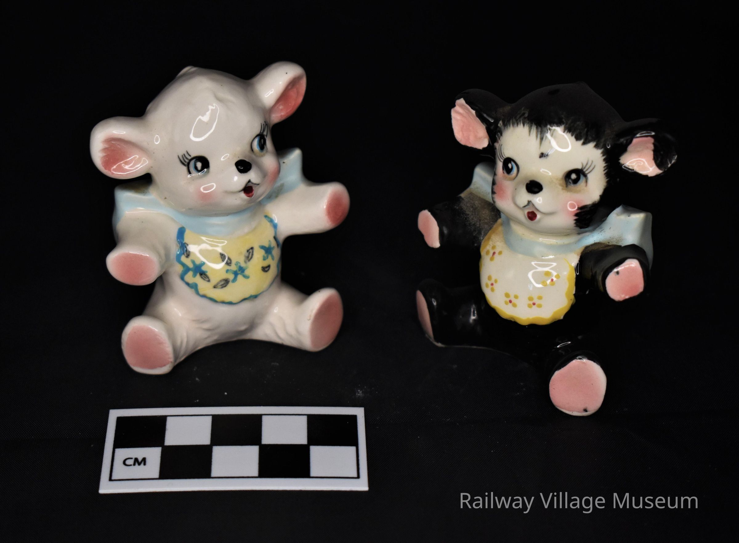 These ceramic shakers are white and black teddy bears wearing colorful baby bibs. Manufacturer is unknown; however, both have sticker stating they were made in Japan. Corks stoppers both intact. On the reverse of the white bear is an original price sticker which says "1.00"