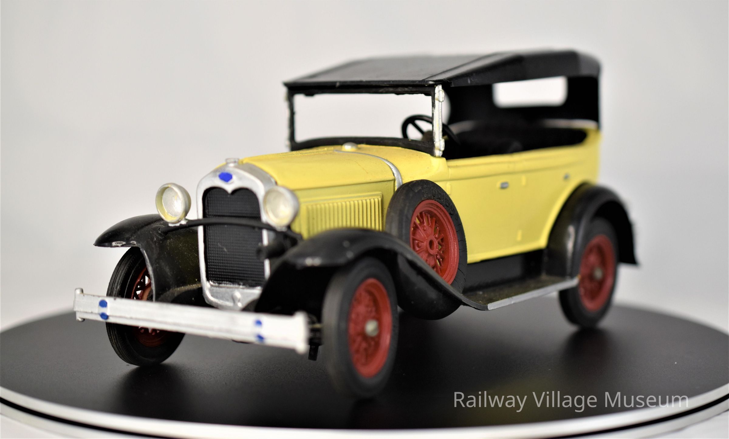 A Model A Ford Phaeton. The car was built from a kit, and it appears complete. The steering wheel turns the front wheels.